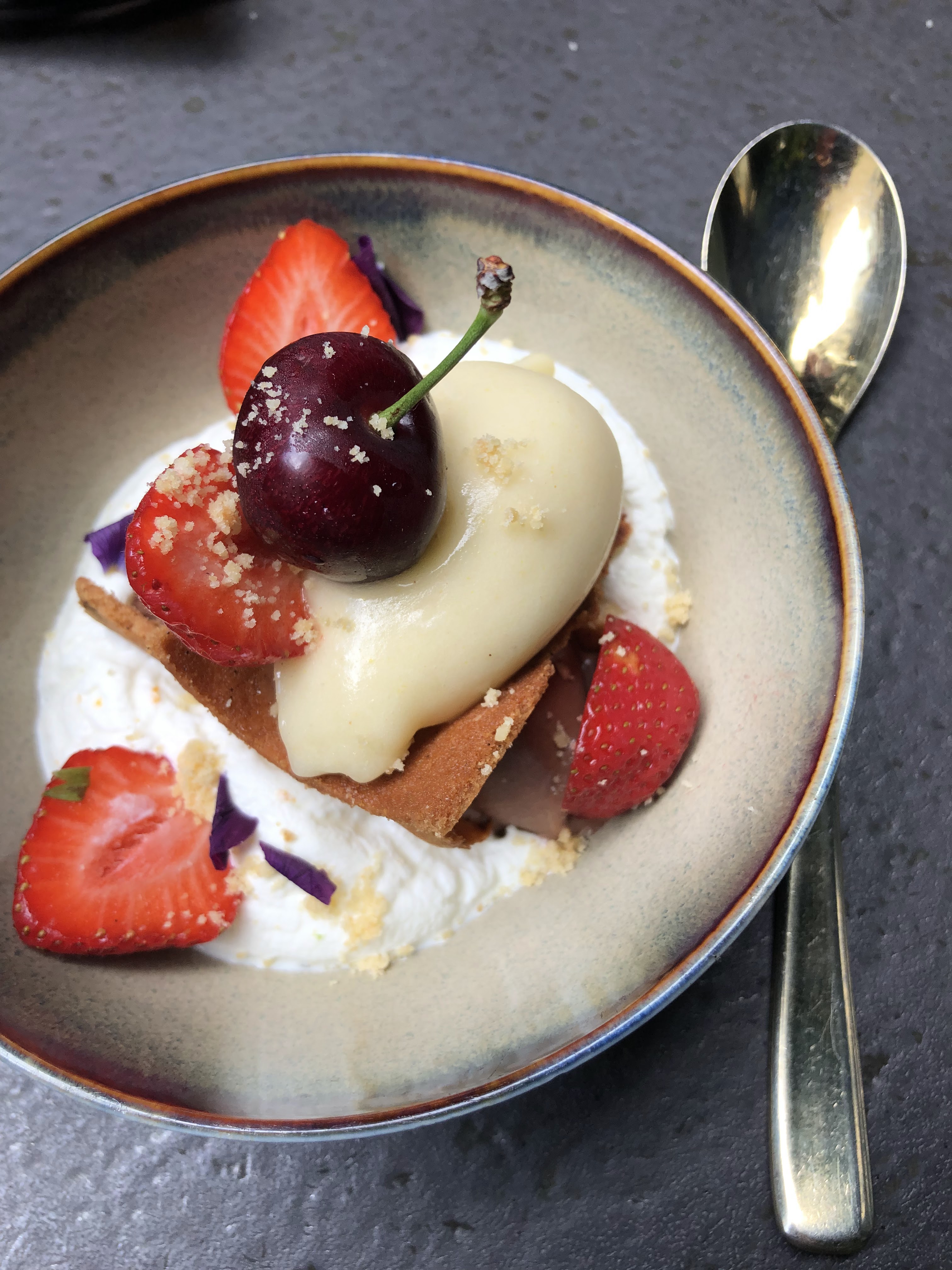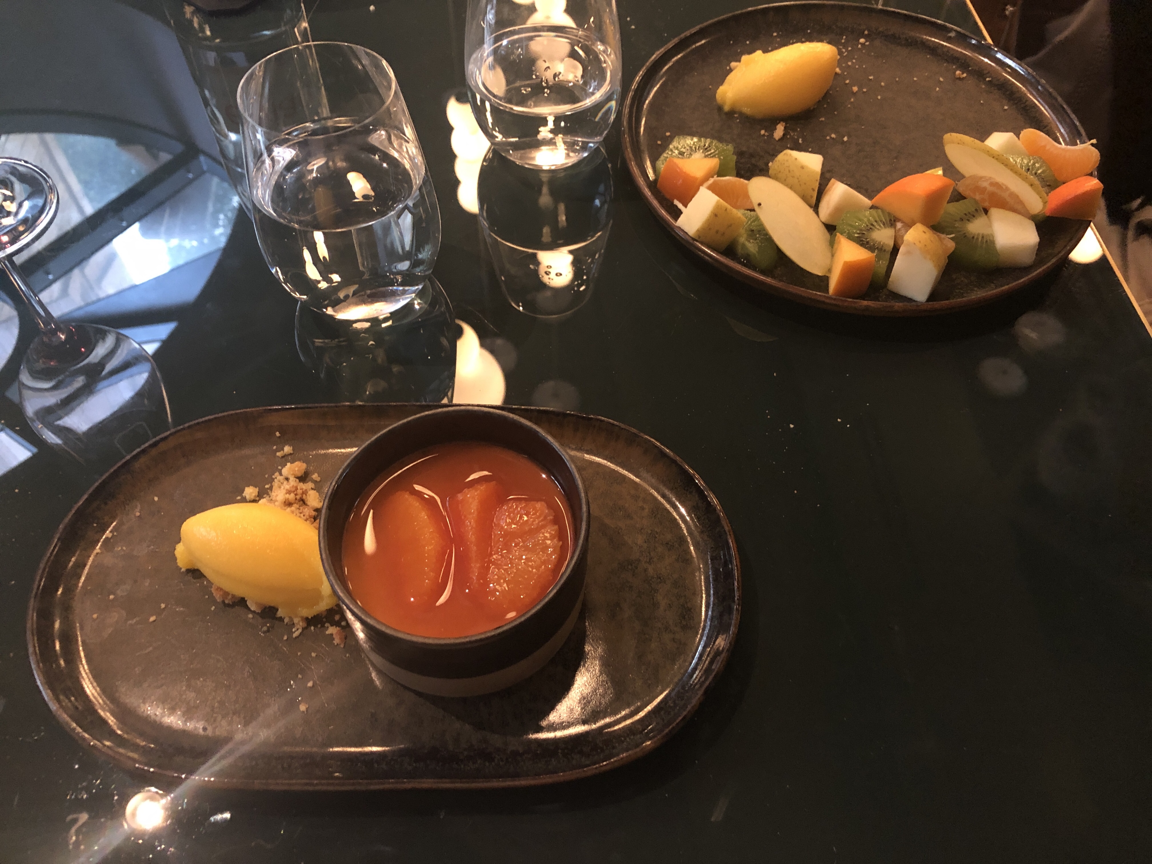 Magnifique terrasse, belle qualité de mets (dessert en dessous)