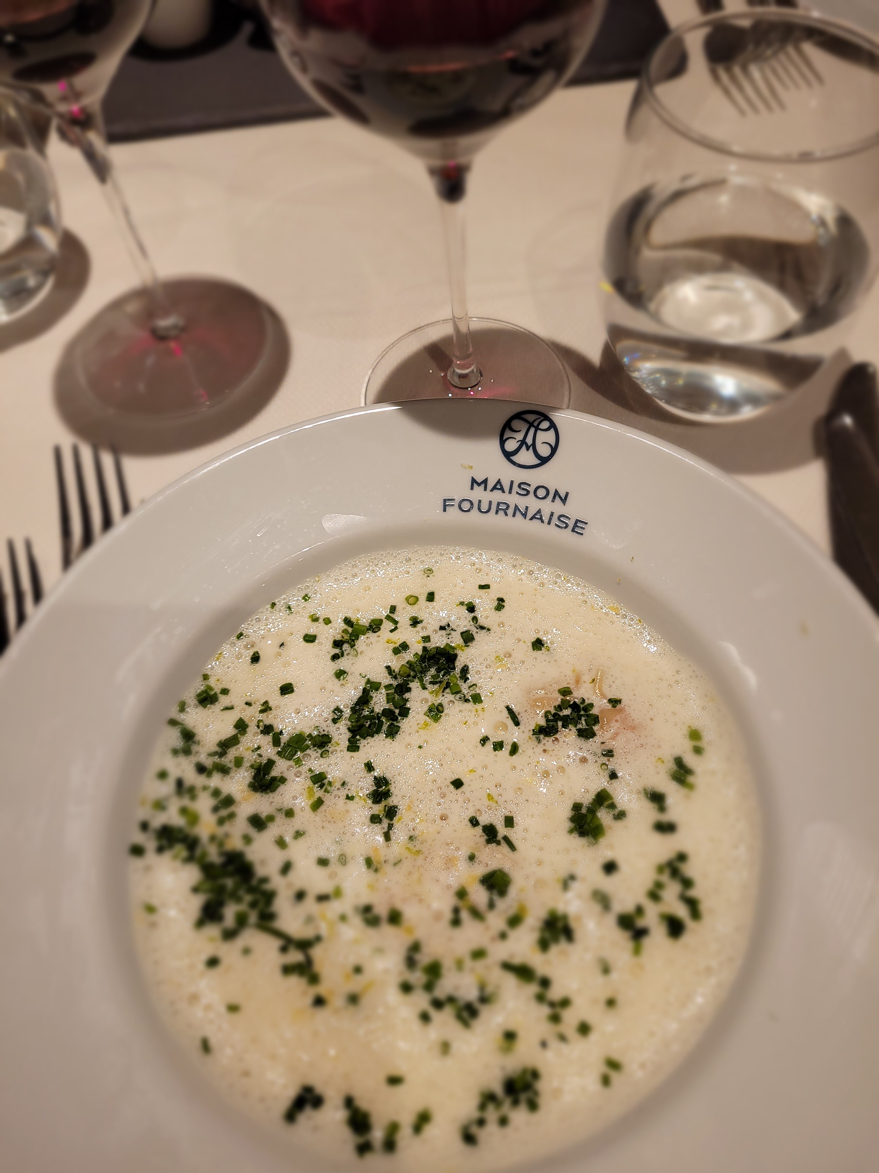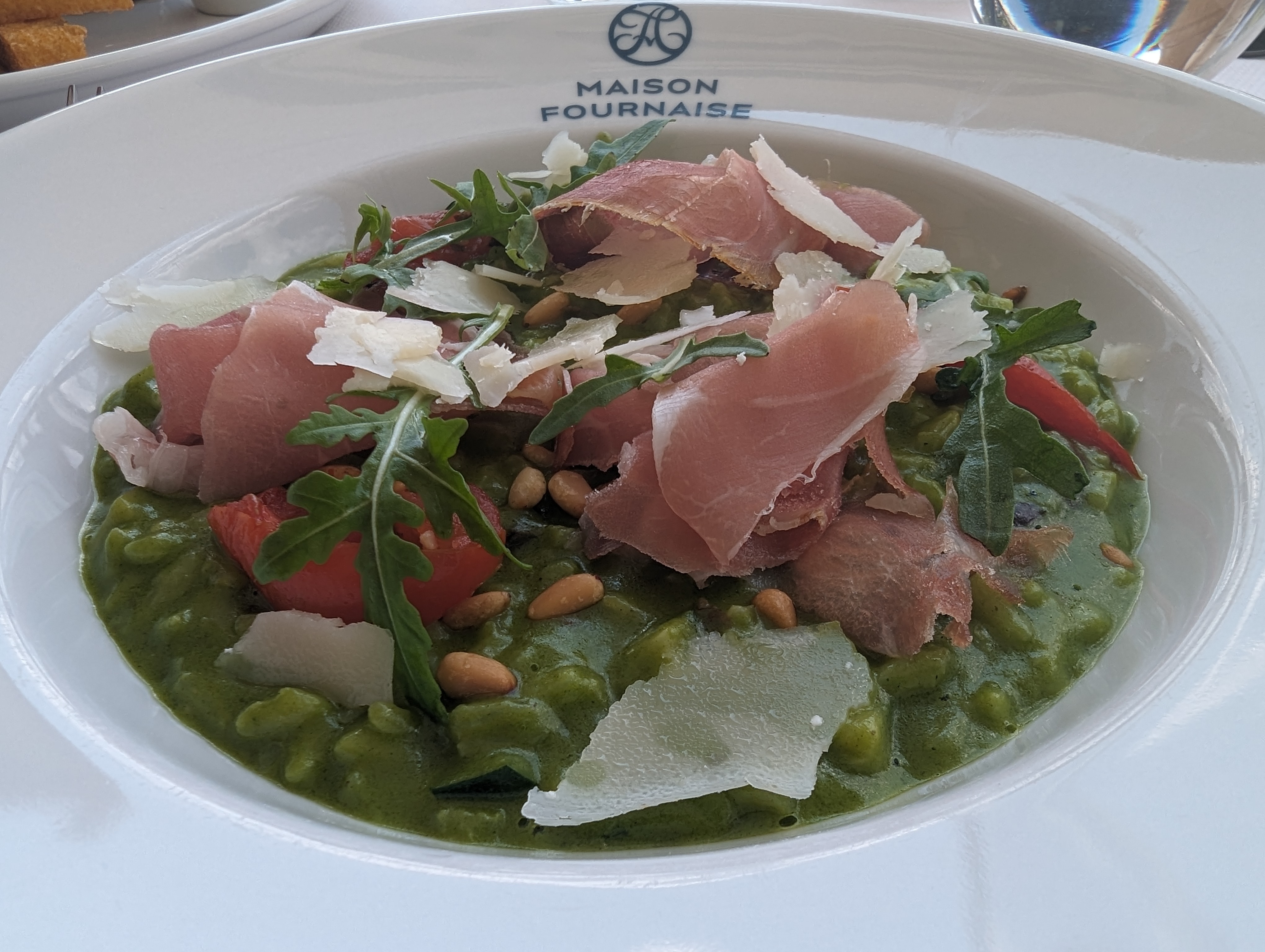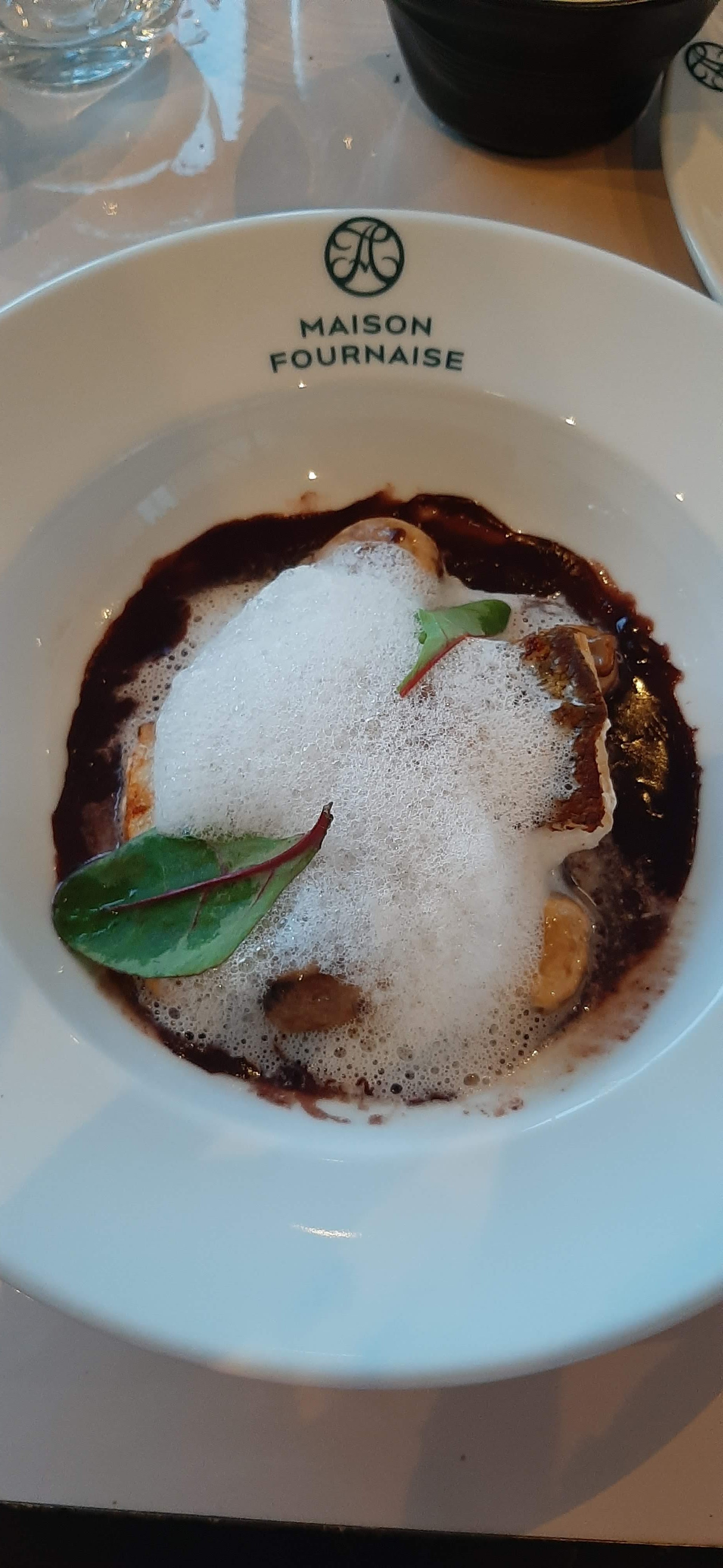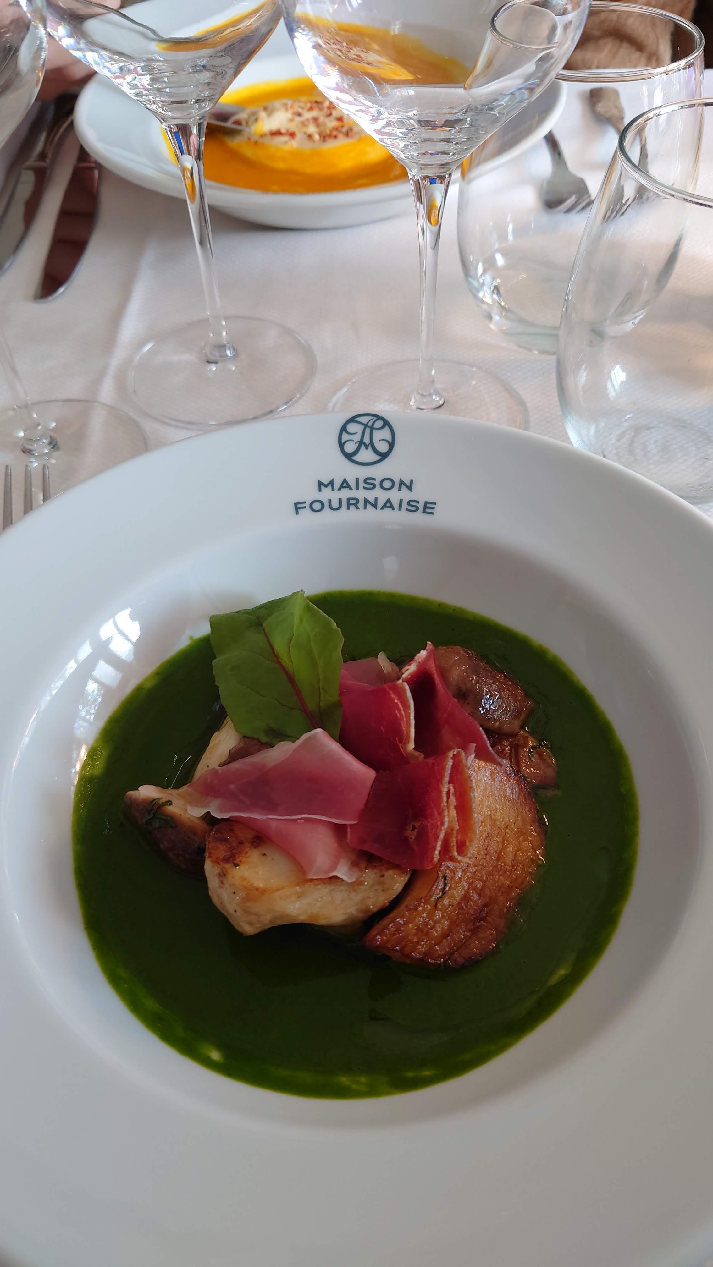 Restaurant gastronomique La Fournaise (L’île de Chatou), j’ai pris une entrée à base de cèpes (désolée je ne sais plus si c’était une crème d’épinards) avec des copeaux de coppa et franchement ce plat était délicieux (photo).