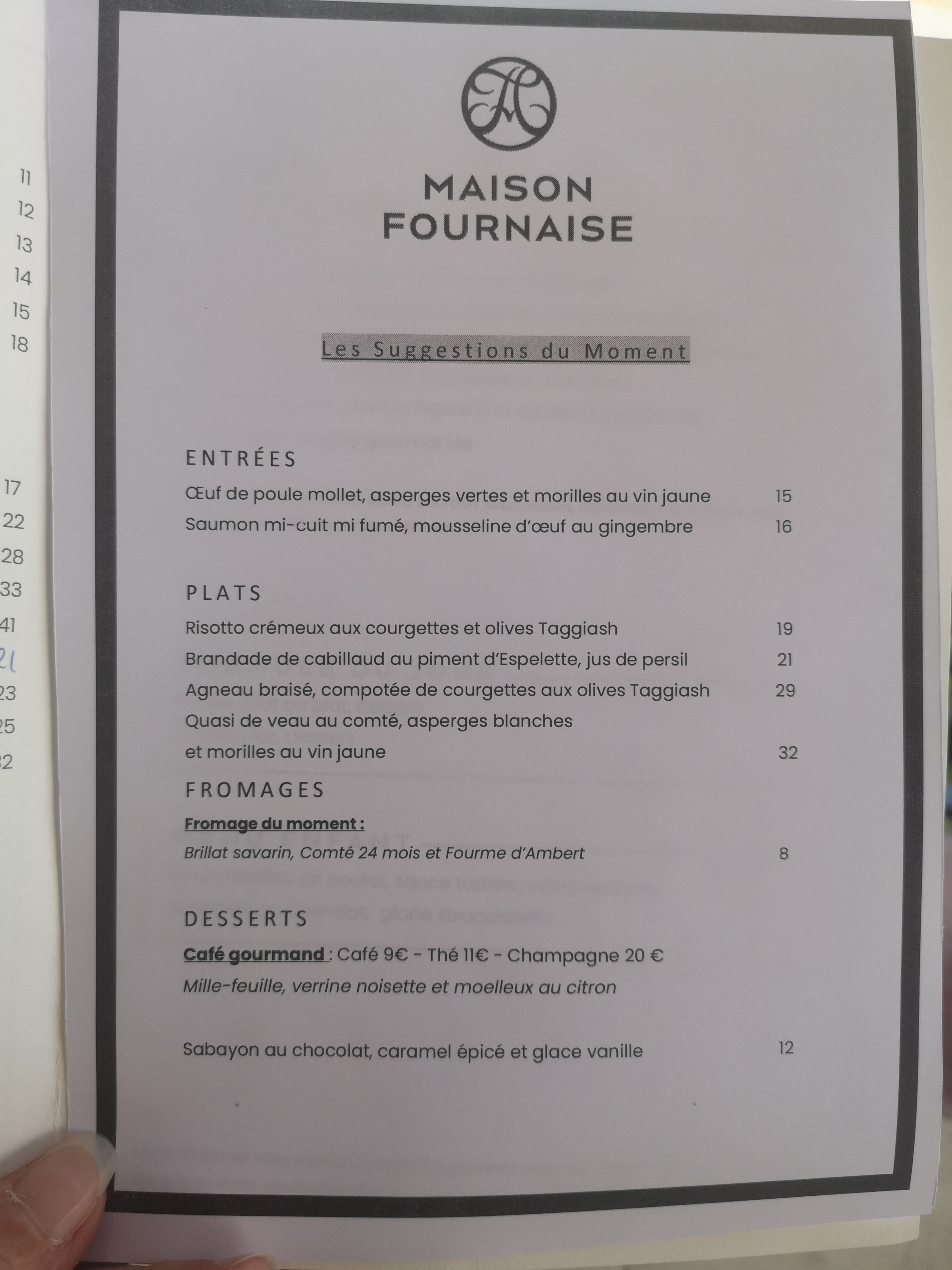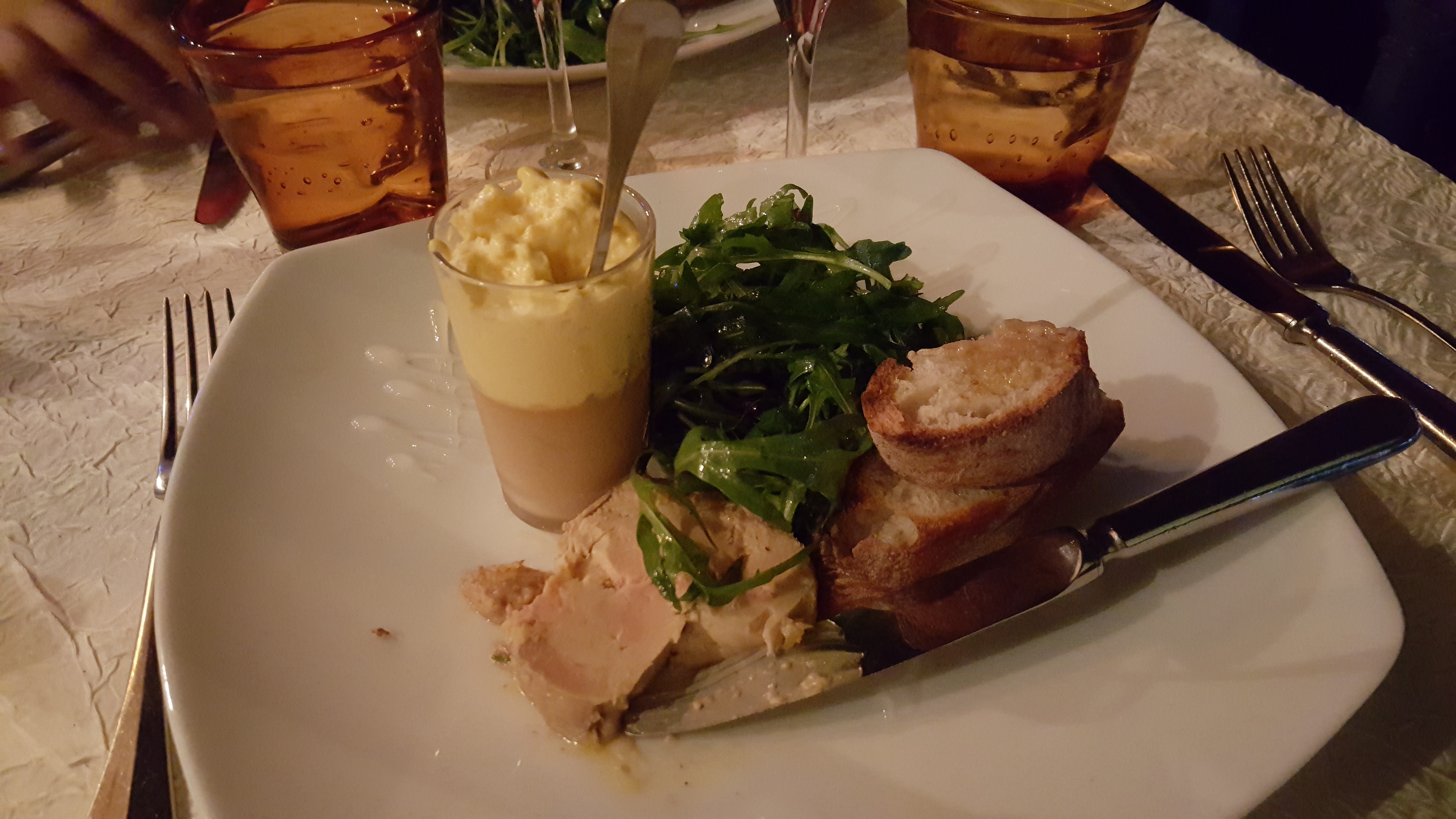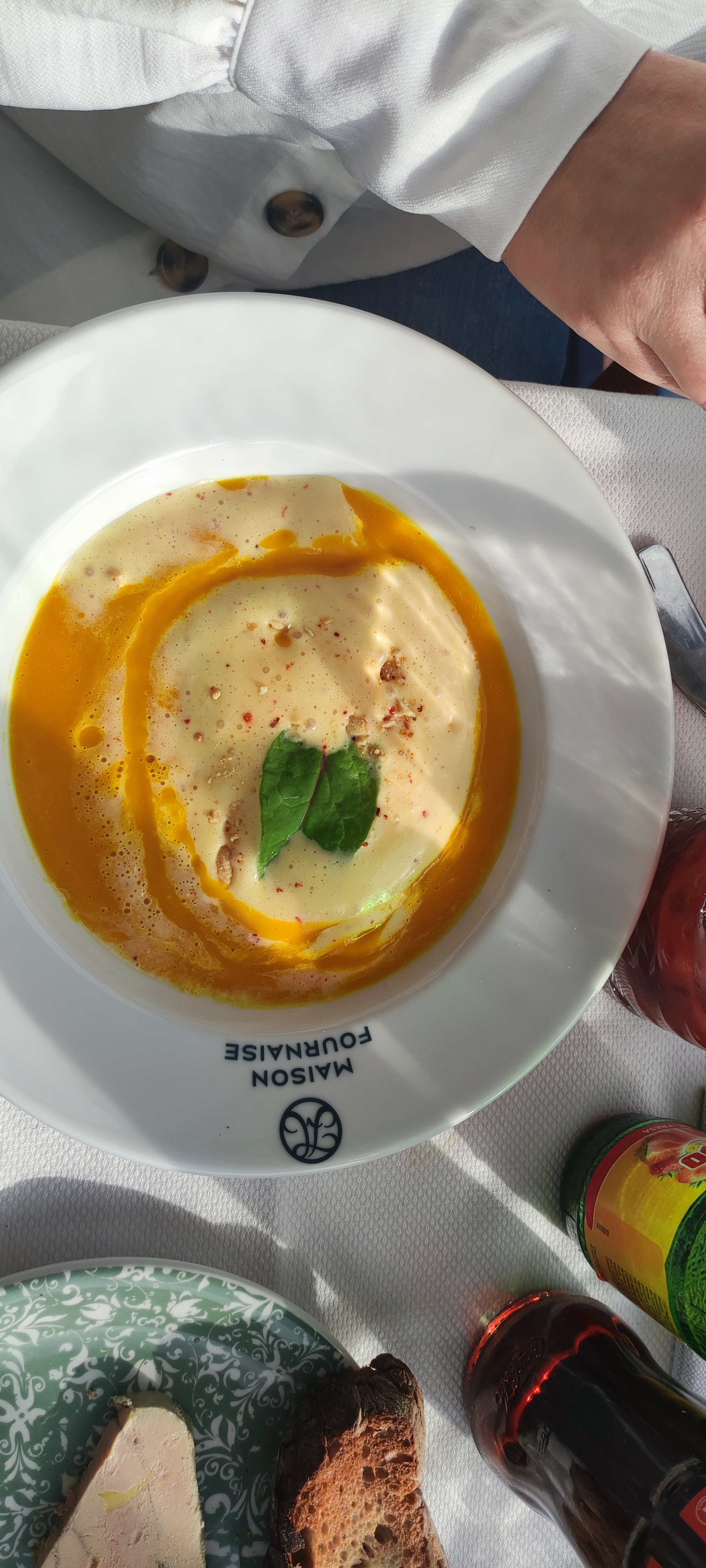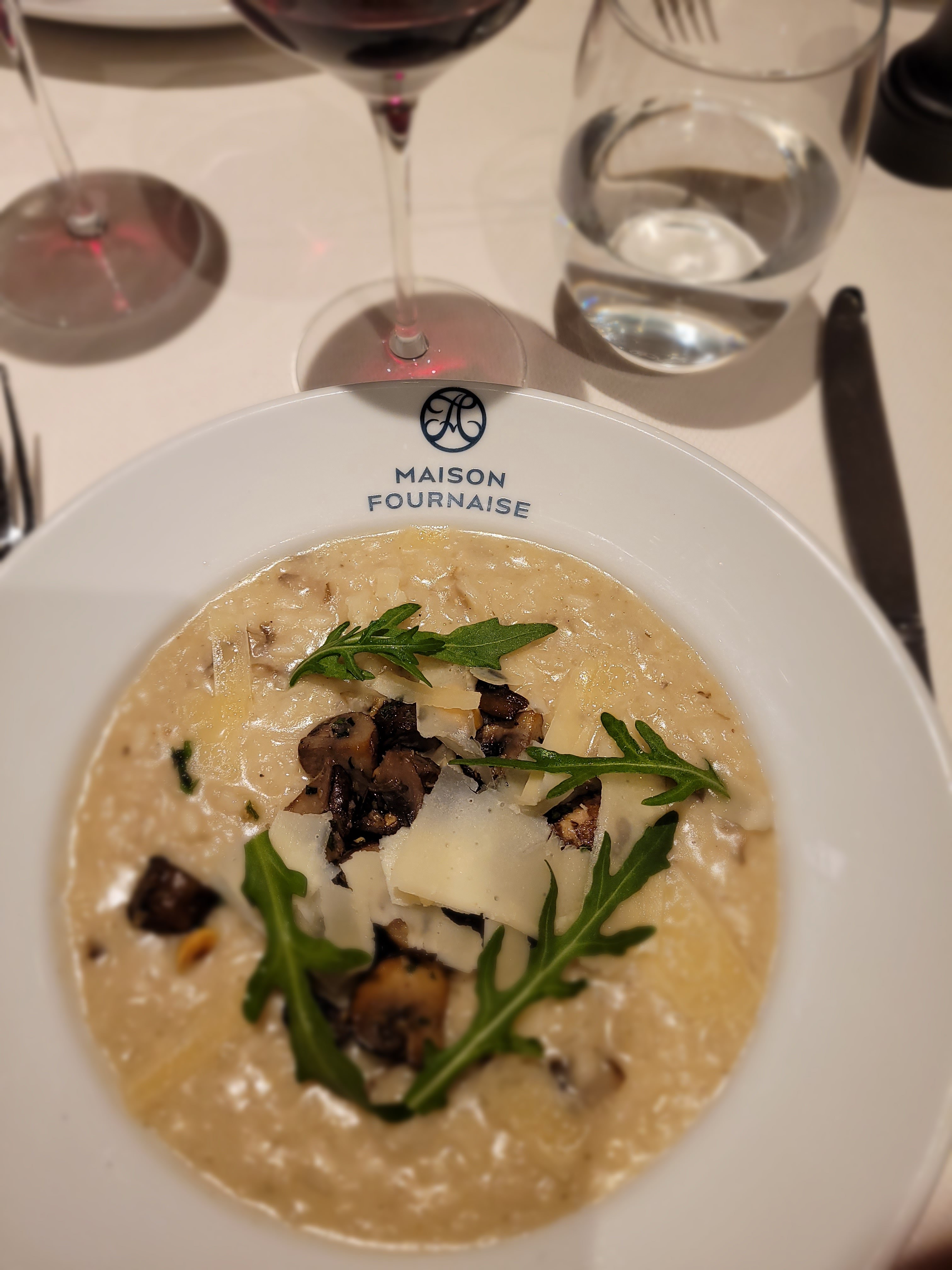 Restaurant gastronomique La Fournaise (L’île de Chatou), j’ai pris une entrée à base de cèpes (désolée je ne sais plus si c’était une crème d’épinards) avec des copeaux de coppa et franchement ce plat était délicieux (photo).