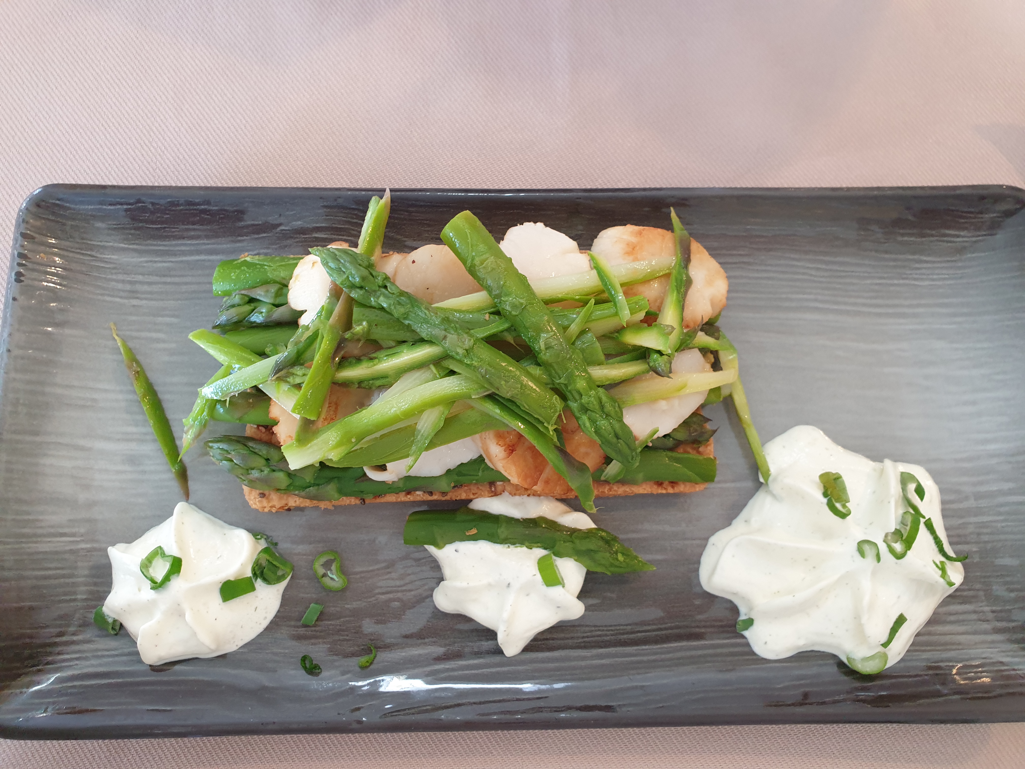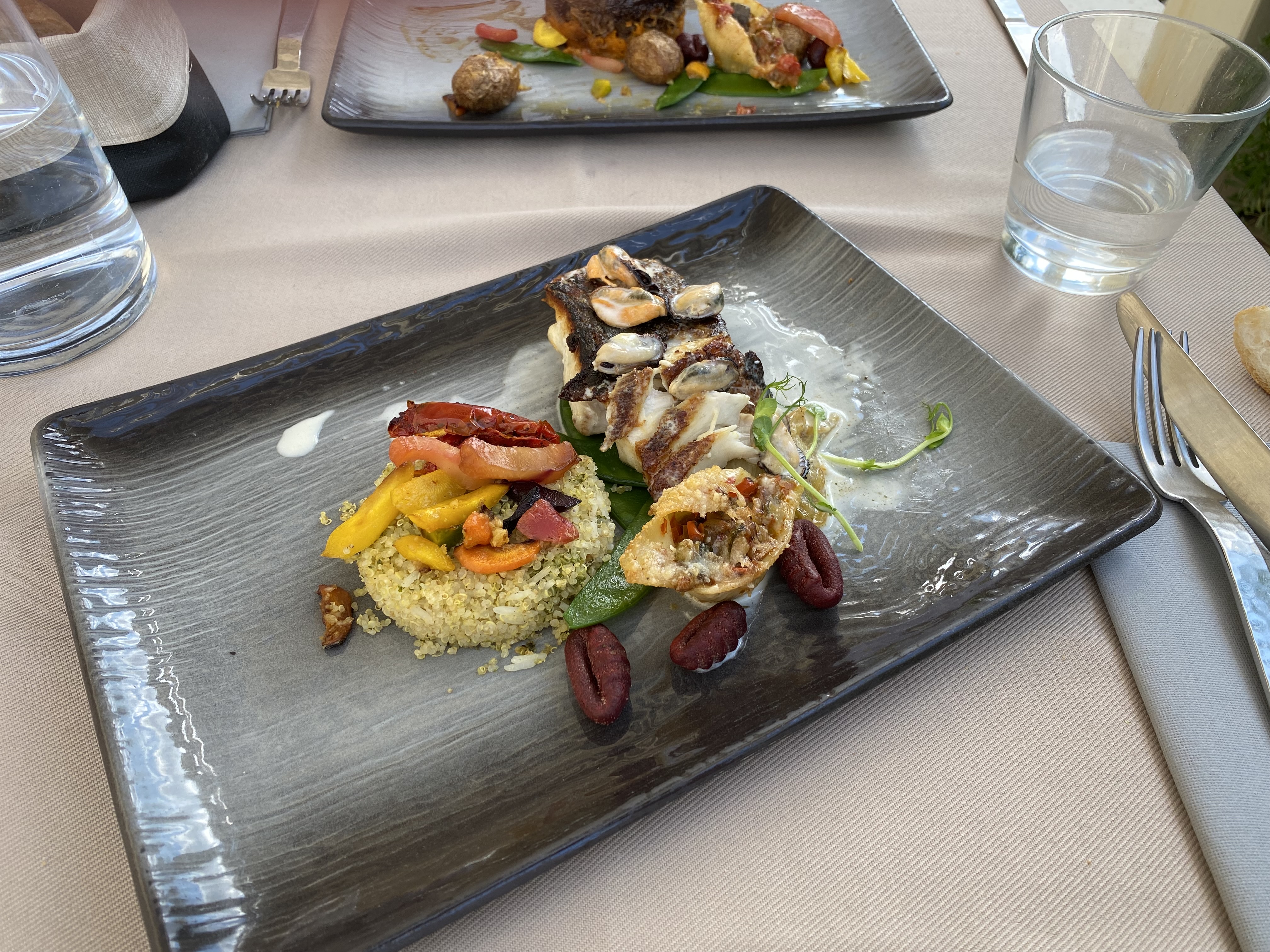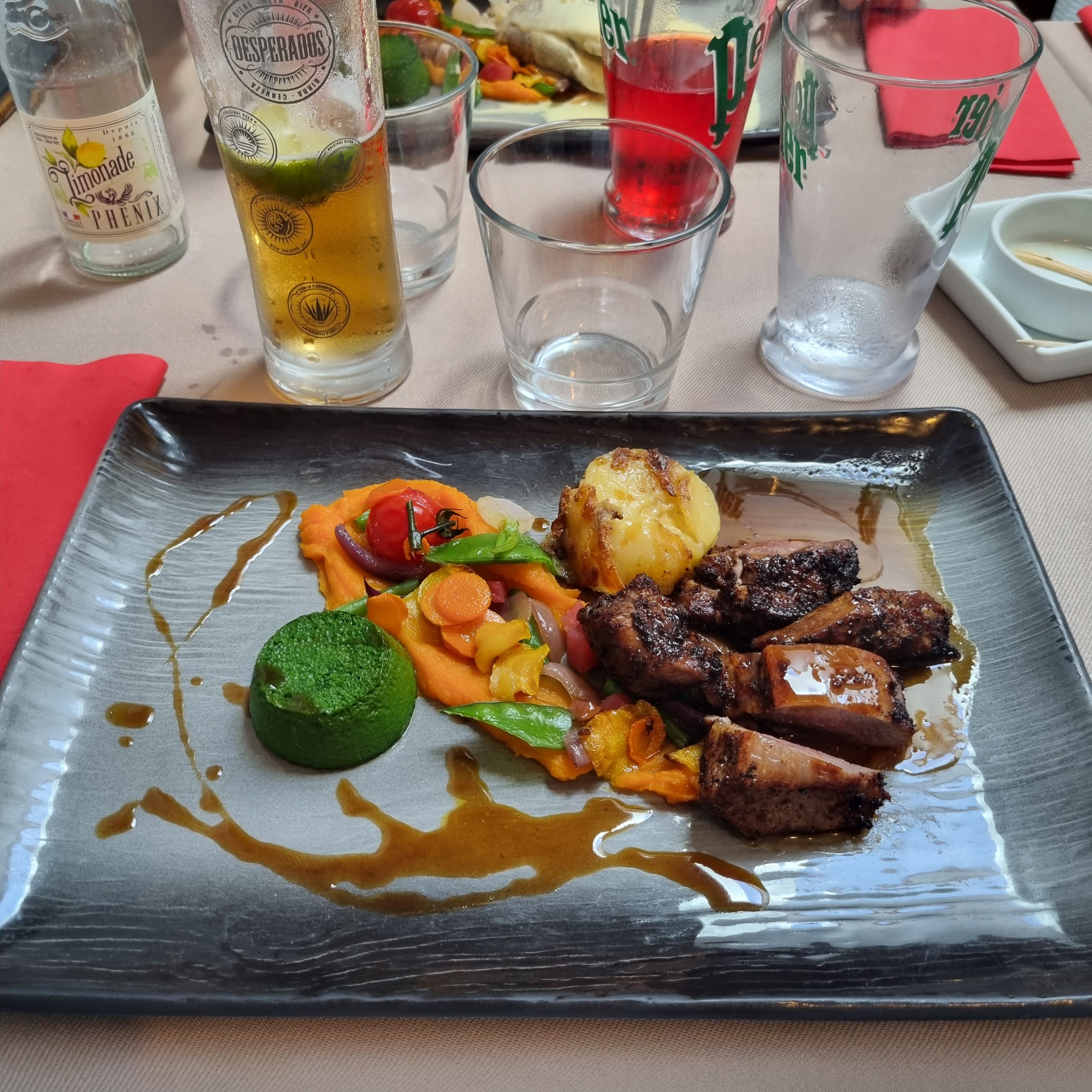 Restaurant attenant au SPA, réservé la veille par notre hôtel. Les serveurs sont très aimables et serviables, ils prennent en compte nos demandes. Les plats sont très beaux et très bons, presque du gastronomique mais en ayant assez à manger 😊 Il manquerait juste un peu plus de légumes type haricot vert (voir photo)