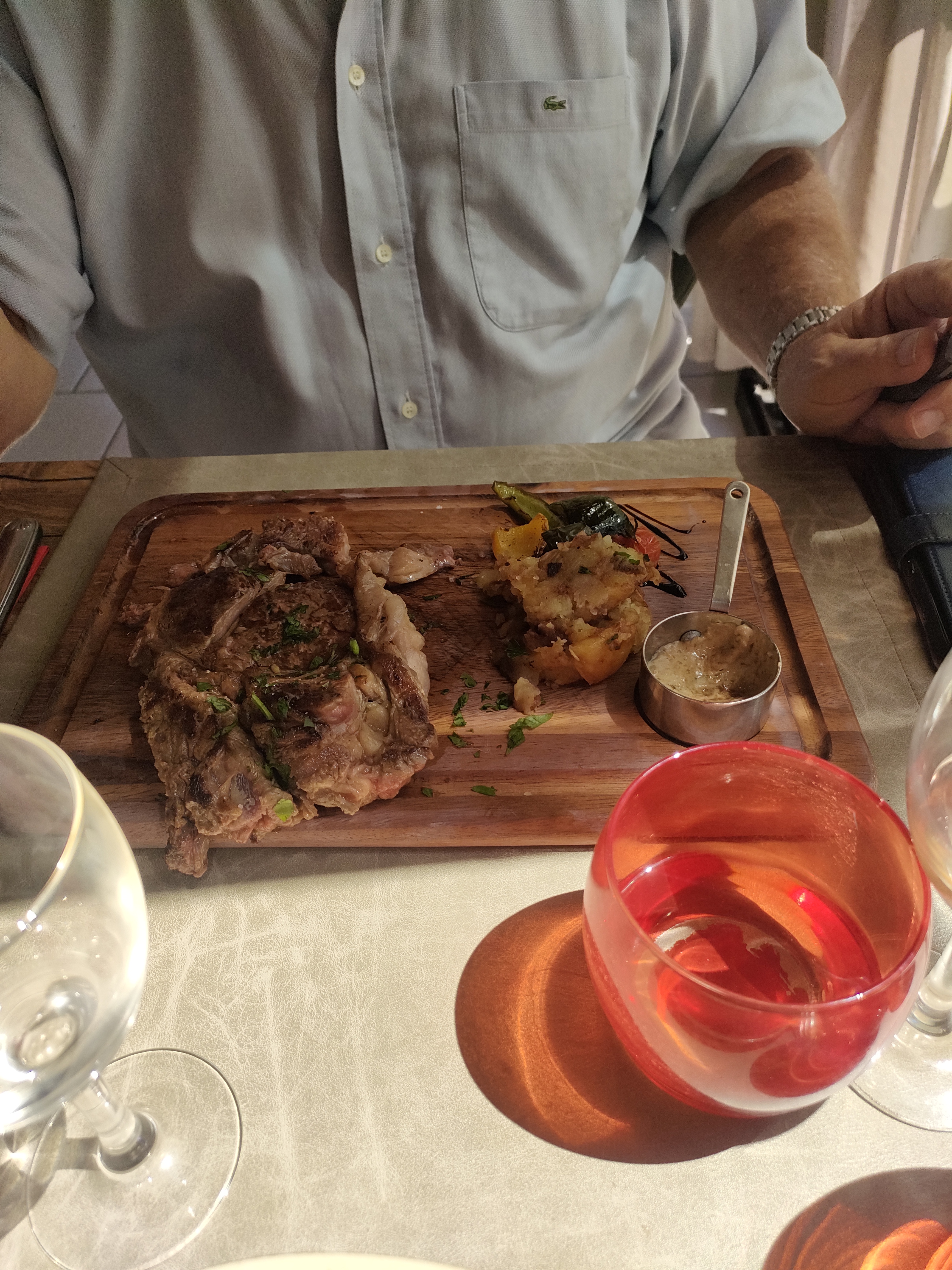 Très bon restaurant, certains avis disaient que ce n'était pas assez copieux pour nous il y en avait largement assez le tartare de saumon était assez copieux pour une entrée, l'entrecôte avait une cuisson parfaite et était vraiment tres bonne, petit changement pour le dessert, d'habitude les restaurants servent plutôt un moelleux au chocolat là c'était un gateau avec un biscuit joconde également délicieux. On n'était pas sûre d'avoir une table en terrasse étant arrivés a 21h mais le serveur nous en a quand même trouvé une.