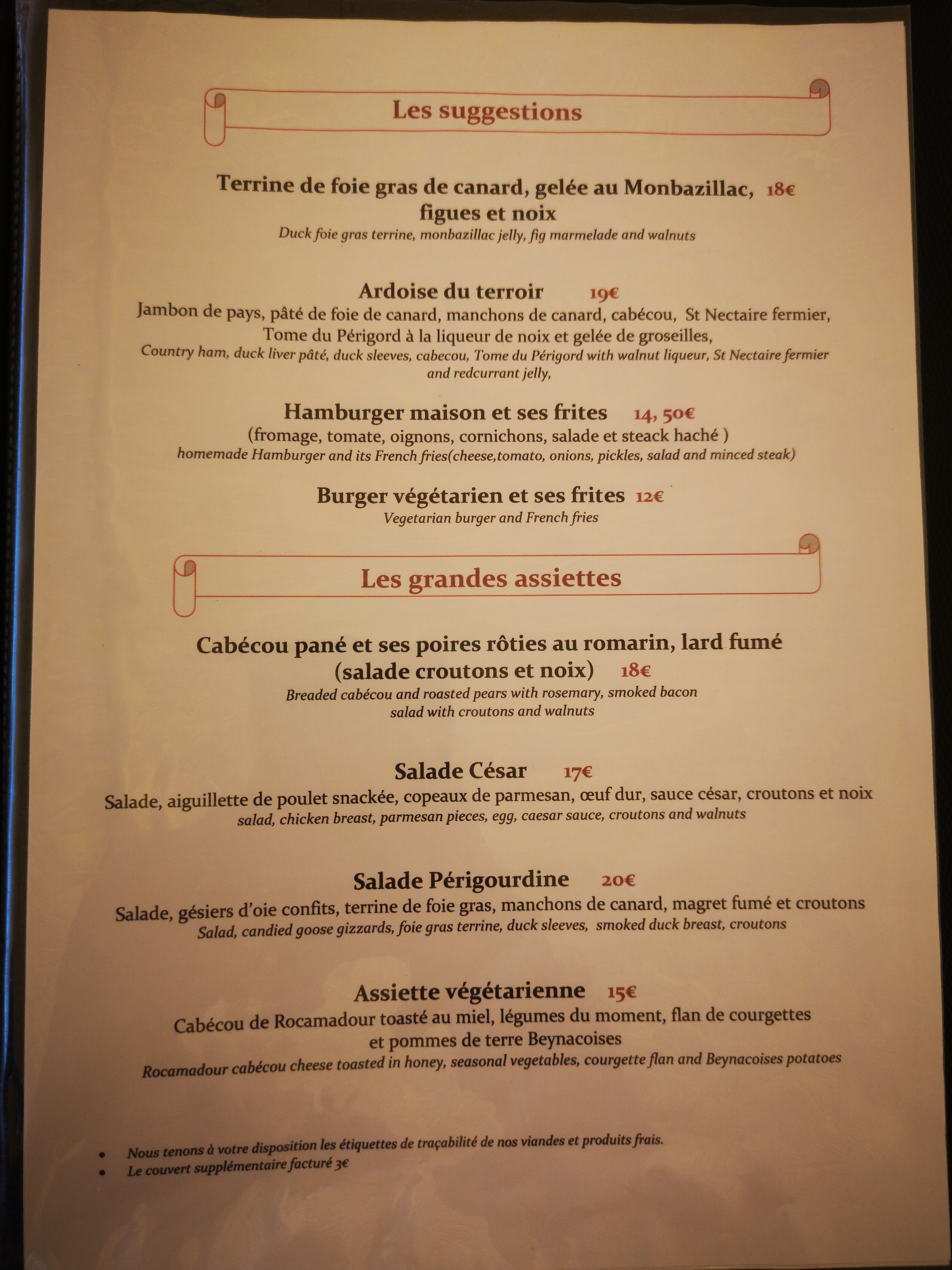 3 personnes mon épouse m'a fille et moi. Entrée 1 terrine de foie gras vraiment décevant, fade et surtout pas maison en plats une entrecôte au poivre sauce industrielle, un amburger maison alors là pain froid,sec sans sauce, une fine tranche de fromage 1/2 cornichon à oublié une salade perigourdine avec du concombre pilon de canard confit 2 tomates cerises vinaigrette absente foie gras en boîte addition74,4o€ restaurant à eviter