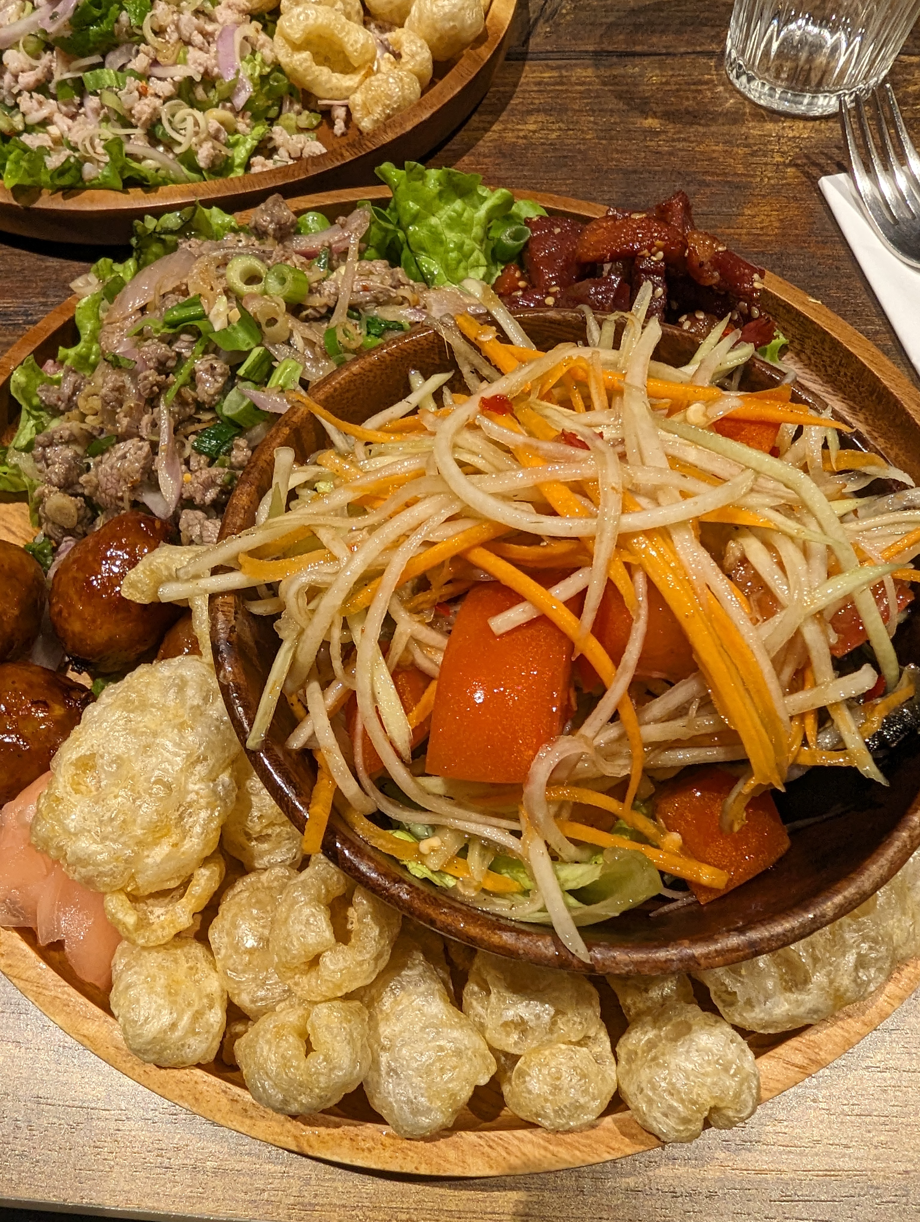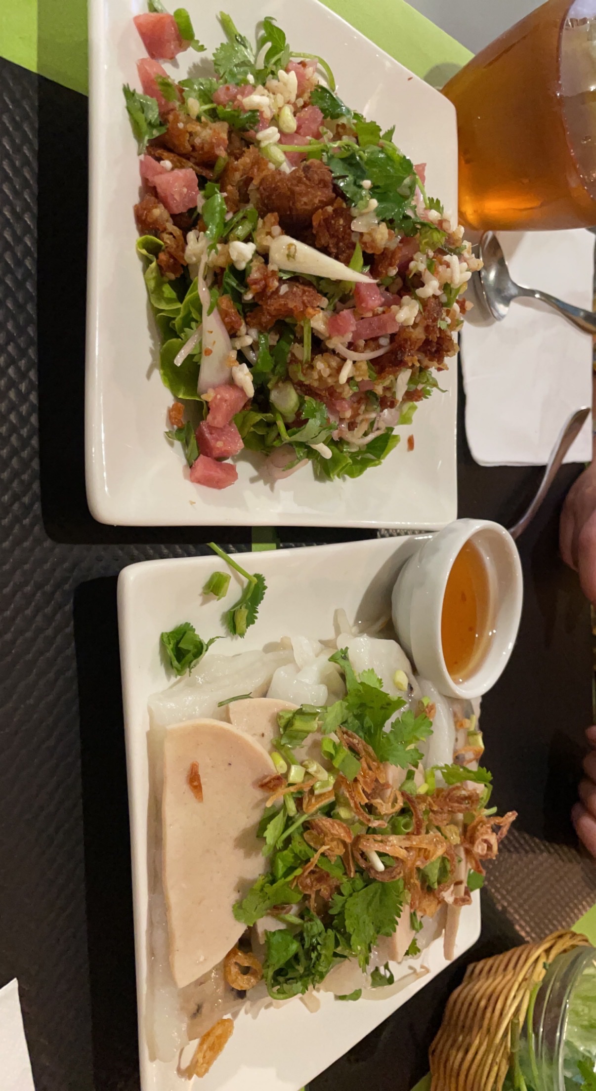 Petit resto thaï comme en Thaïlande. On a testé la salade crevette et mangue verte, liseron d’eau et bœuf grillé. Tout était bon !