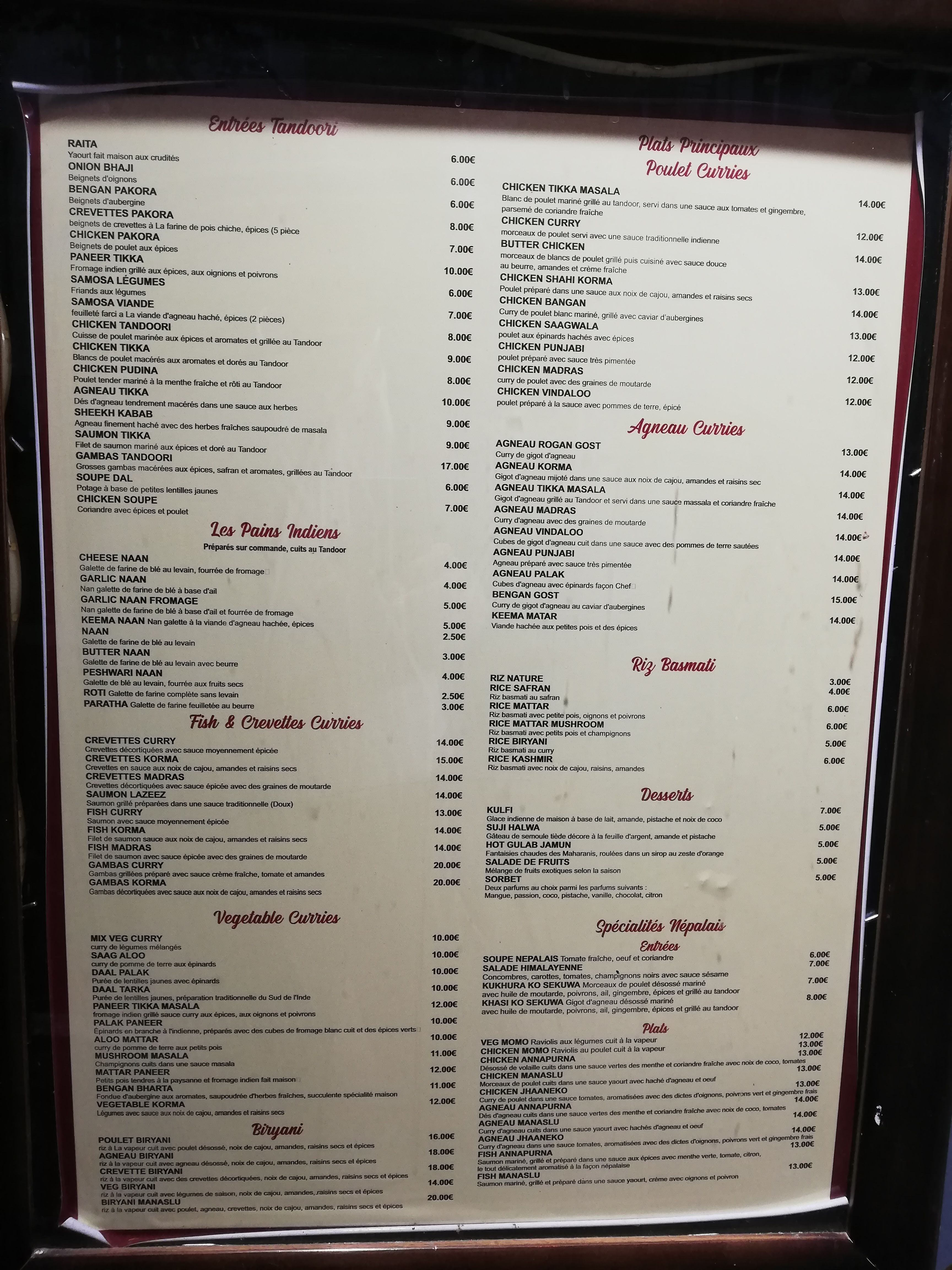 De retour d'Aqua Boulevard tard à 22 heures, nous avons cherché et merci à Google et aux autres commentateurs de m'avoir guidé, moi et ma famille, vers ce merveilleux restaurant. c'est petit mais nous avons passé un très bon moment. ..nous a servi un verre de bienvenue (cocktail sans alcool préparé maison) une assiette de délicieux papads avec 2 tasses de sauce sucrée et verte + cornichon, l'entrée que nous avons commandée était du poulet bhokra 7€ désolé pour la faute d'orthographe et une autre entrée népalaise 13€ ..ils ont servi tous les deux sur une grande assiette avec du citron, un support de carottes décoré, beaucoup de tranches de salade de concombre et de tomate..c'était génial.les ustensiles utilisés pour servir étaient excellents, le curry était chaud jusqu'à ce que nous ayons fini de manger pendant que le bol était servi est sur une petite bougie. le biryani était plutôt sucré avec beaucoup de raisins secs que je ne préfère généralement pas aux enfants et les Européens pourraient le préférer, une sauce complémentaire est fournie avec le biryani.. le naan au fromage et le naan kheema où c'est bon aussi, les poulets momos 9 pièces servies avec une sauce spéciale pour 13 € étaient également excellentes. les prix étaient corrects pour les portions servies 69 € pour 3 adultes et 2 enfants. merci beaucoup, je reviendrai certainement et je le recommanderai à mes amis.