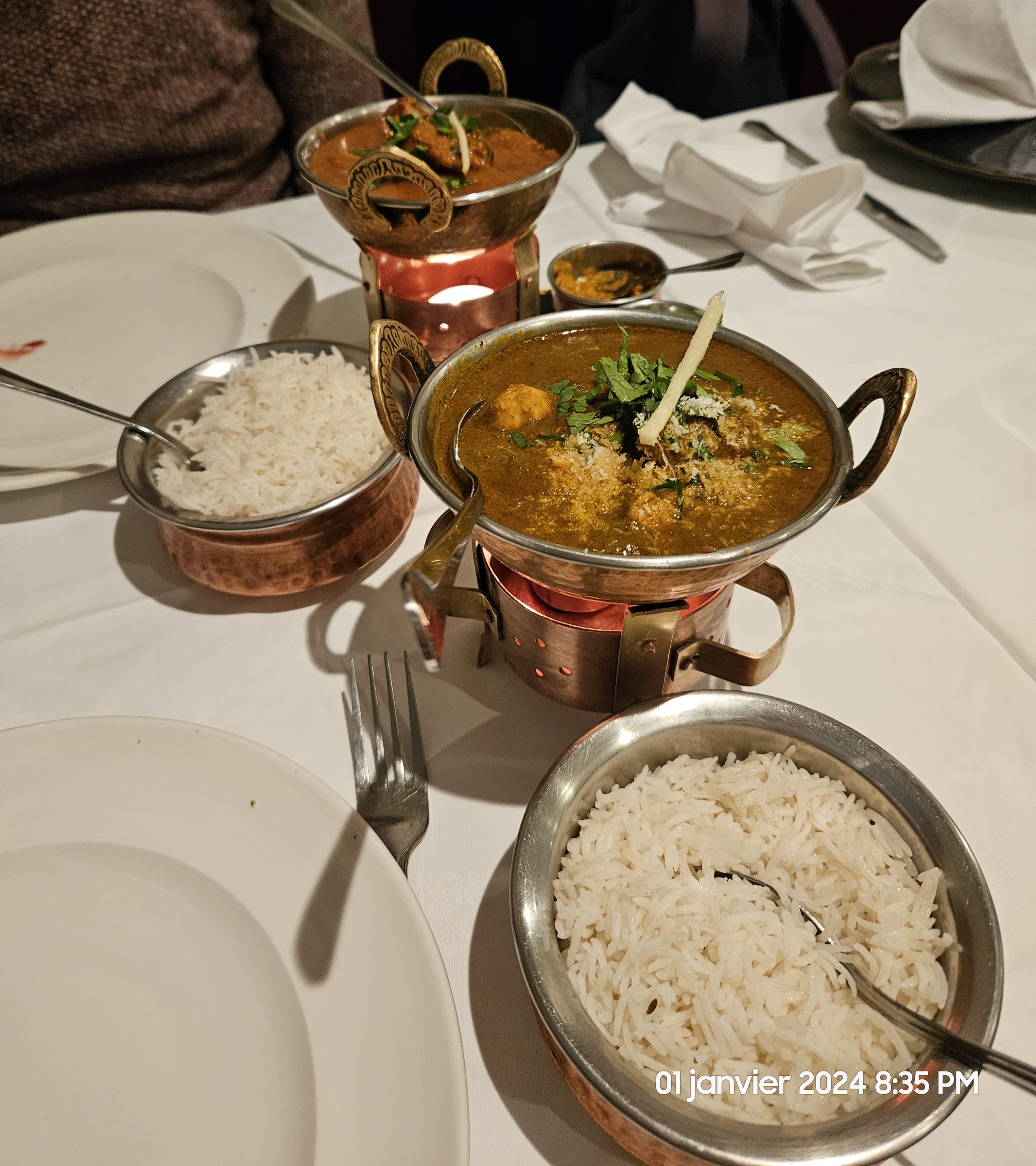 Dîner à 6 personnes. Nous avons passés un très bon moment. Accueil avec le sourire et une pointe d humour. Plat excellent de l entrée au dessert. Mention spéciale pour les naan. Excellent chaud. Chacun est servi dans un petit plat avec bougie chauffe plat. Très bon rapport qualité prix. Belle découverte.