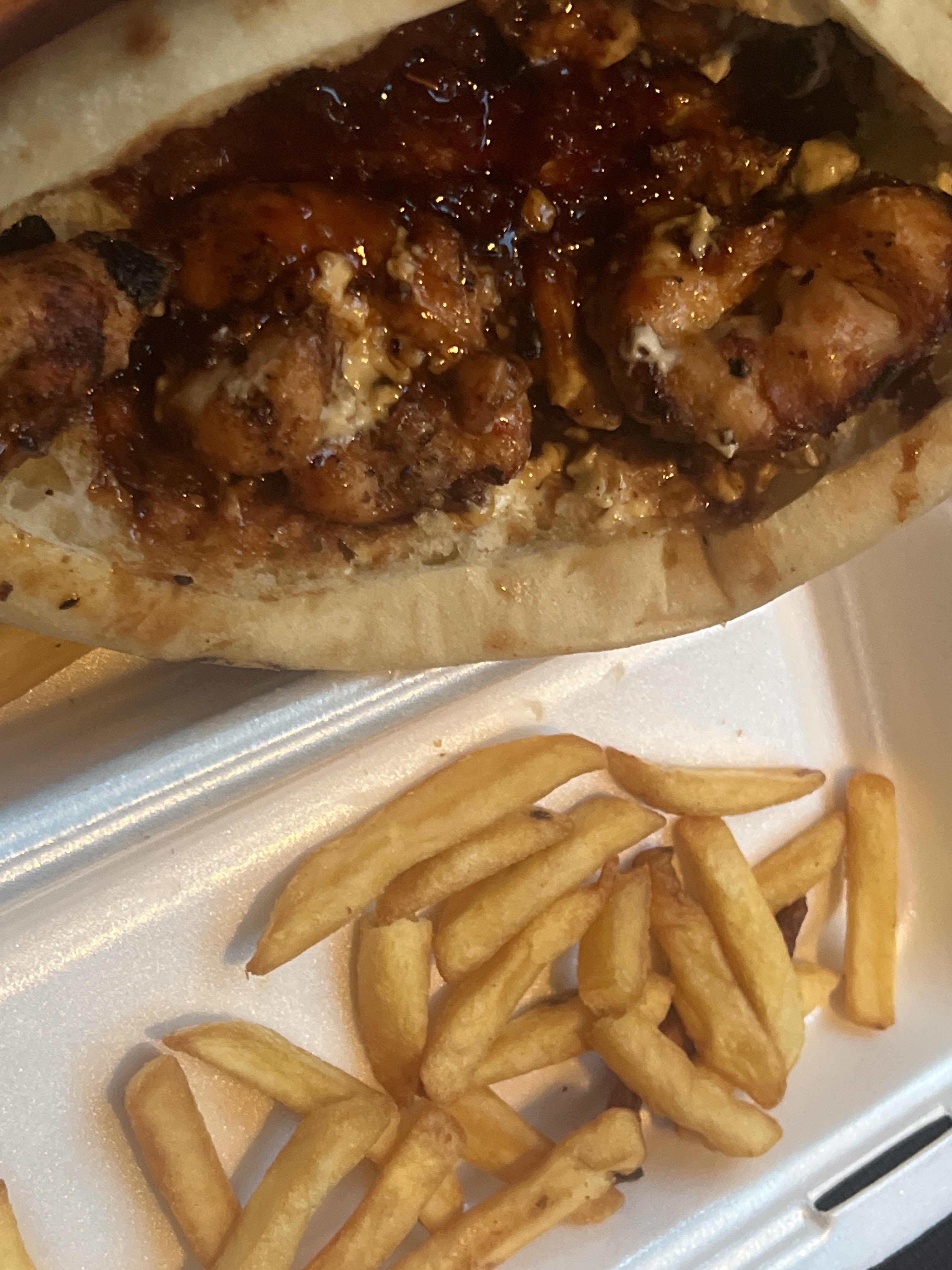 L’image parle d’elle même, sandwich à la sauce barbecue accompagnée de 3 morceau de poulet et des frittes quasiment cramé