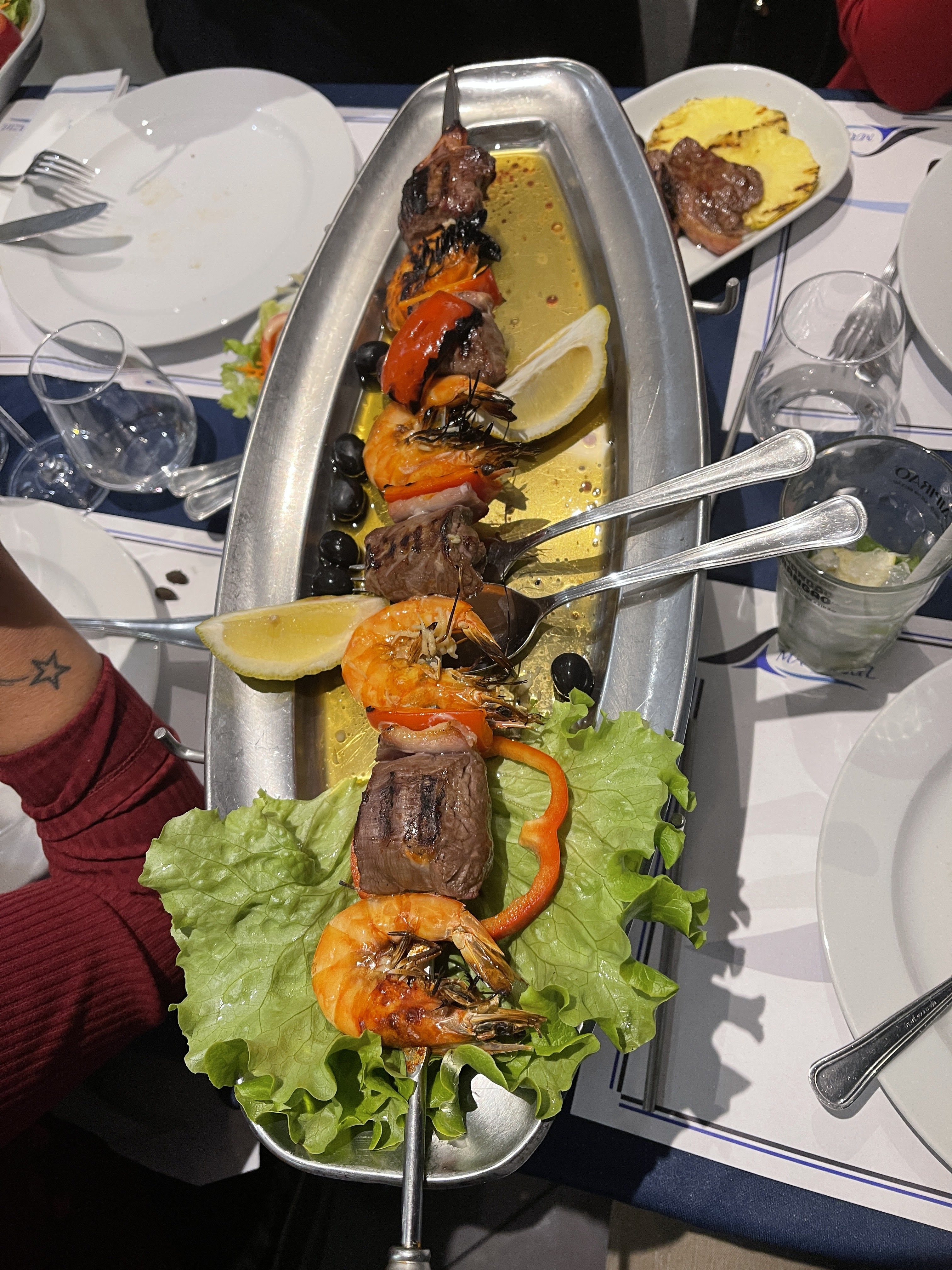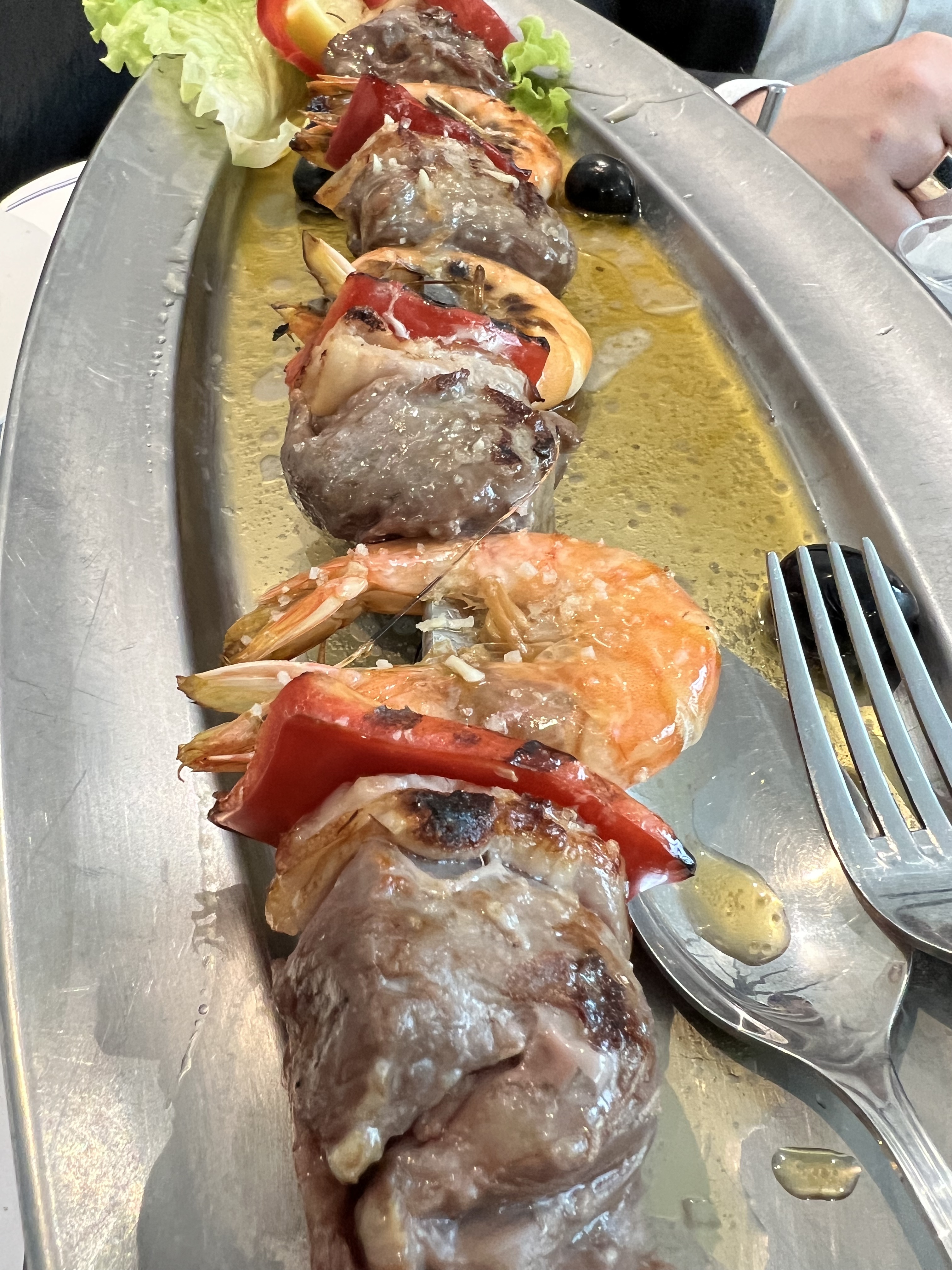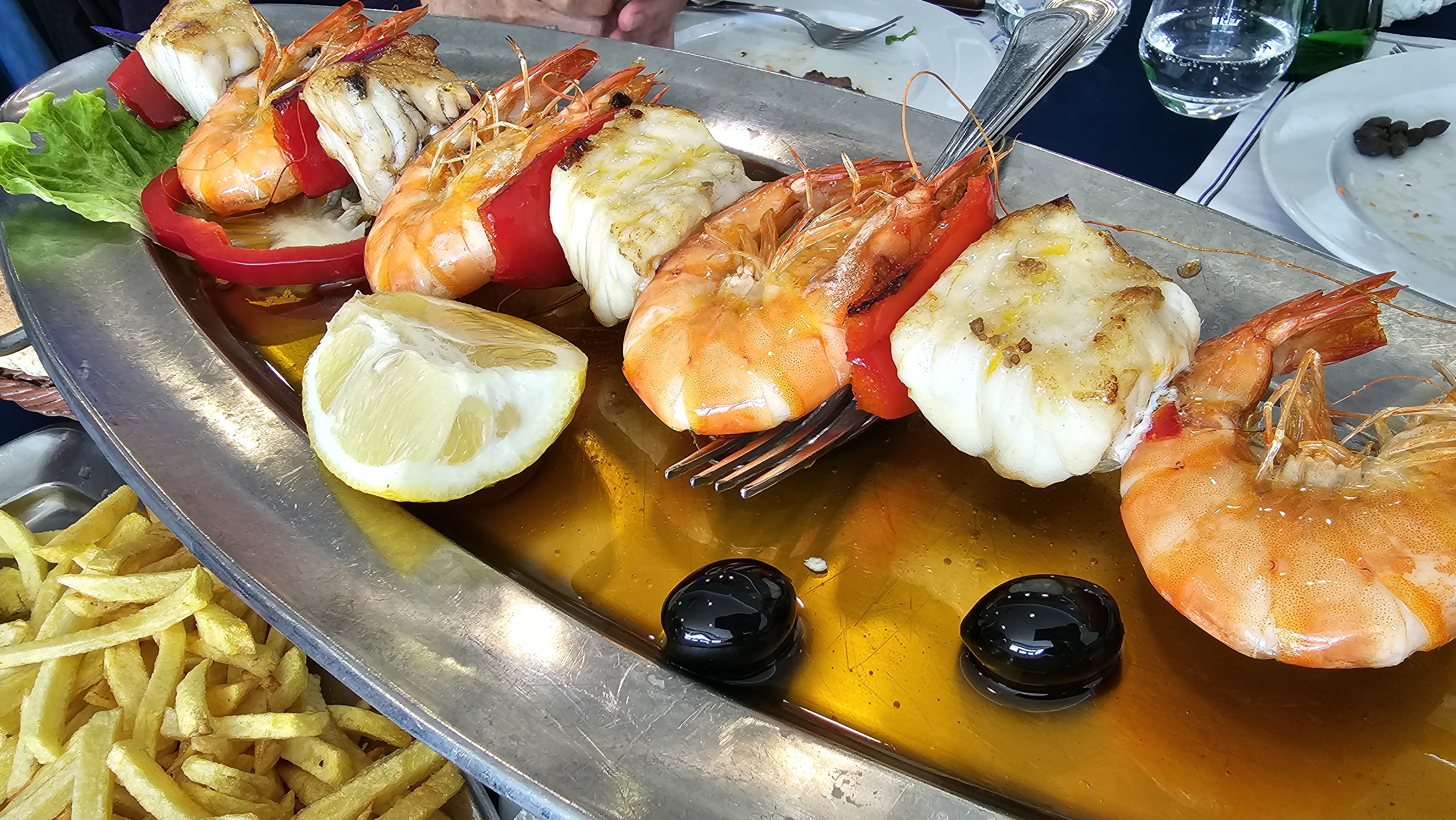 J'aurai pu mettre 4 étoiles, mais je reste sur 3. Nous avions commandé des boissons: 1 litre de Sangria, je ne crois pas qu'il y avait un litre dans le broc de capacité 1 litre: beaucoup trop de fruits. Je pense qu'il y avait 60 ou 70 cl. Les plats présentés sont appétissants (belles brochettes de viandes ou poissons avec crevettes). Un petit souci qui peut être gênant, mes 4 crevettes semblaient un peu affreuses dans la bouche, j'en ai mangé 3 pas top. J'en ai fait goûté une à mon petit frère portugais qui a trouvé effectivement qu'il y avait un drôle de goût. C'est la poisse pour moi. Je ne voulais pas me faire remarquer pour signaler le problème. cela m'a embêté. J'étais inquiet de tomber malade avec ces trois crevettes. Chez moi j'ai mangé beaucoup d'ail cru pour combattre une éventuelle infection. Dans tous les cas, j'y retournerai pour voir si je tombe sur du TOP.