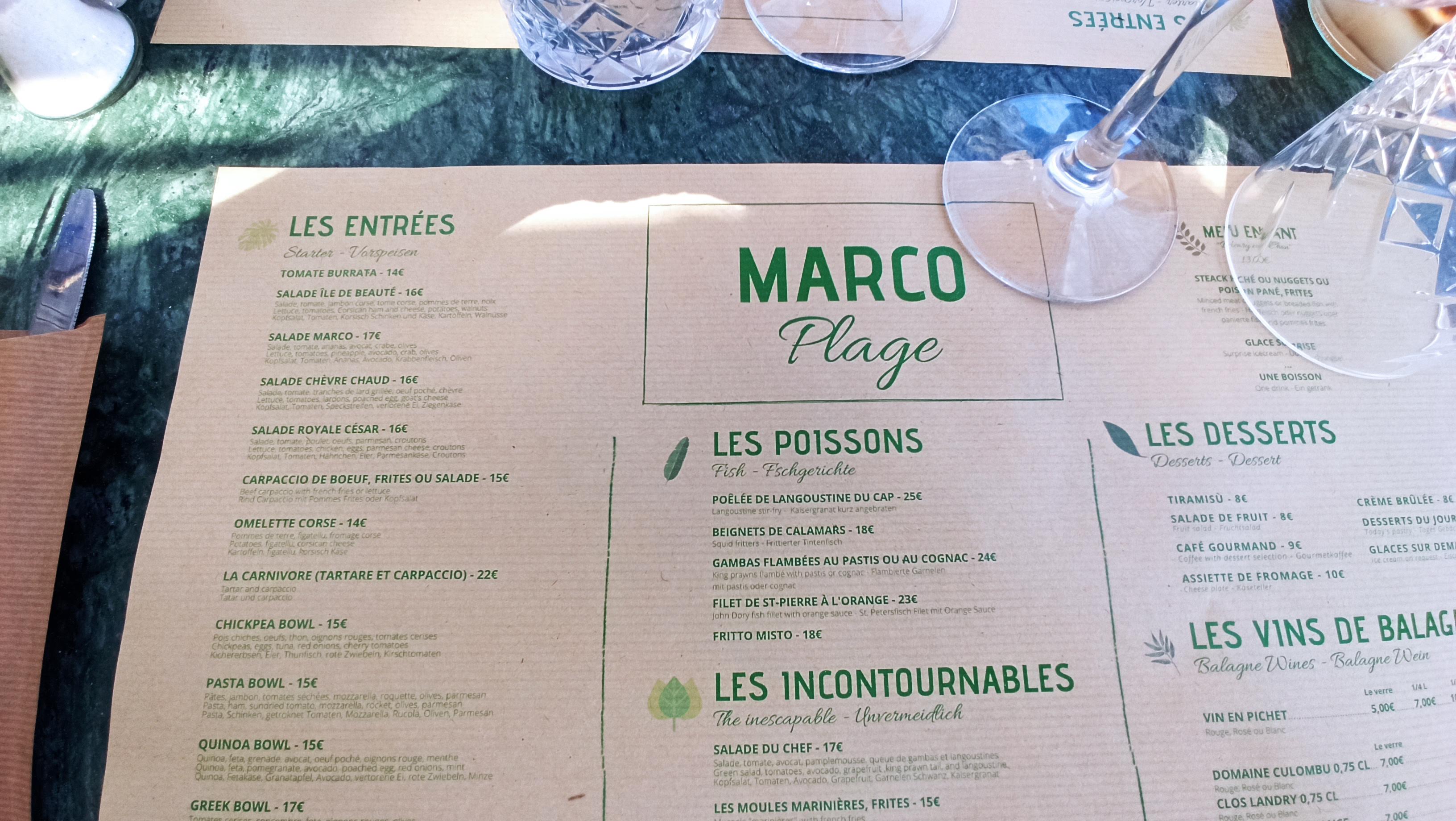 Le Chez Marco Plage est situé directement sur la plage de sable de la ville de Calvi et bénéficie donc d'un emplacement optimal. Cependant, le personnel de service semble souvent débordé et restructuré. Les moules avec des frites étaient correctes, les Penne Bolognese n'étaient pas aussi bonnes. Le rapport qualité-prix n'était pas tout à fait correct, mais il convenait tout à fait pour prendre une boisson fraîche sur la plage de Calvi.
