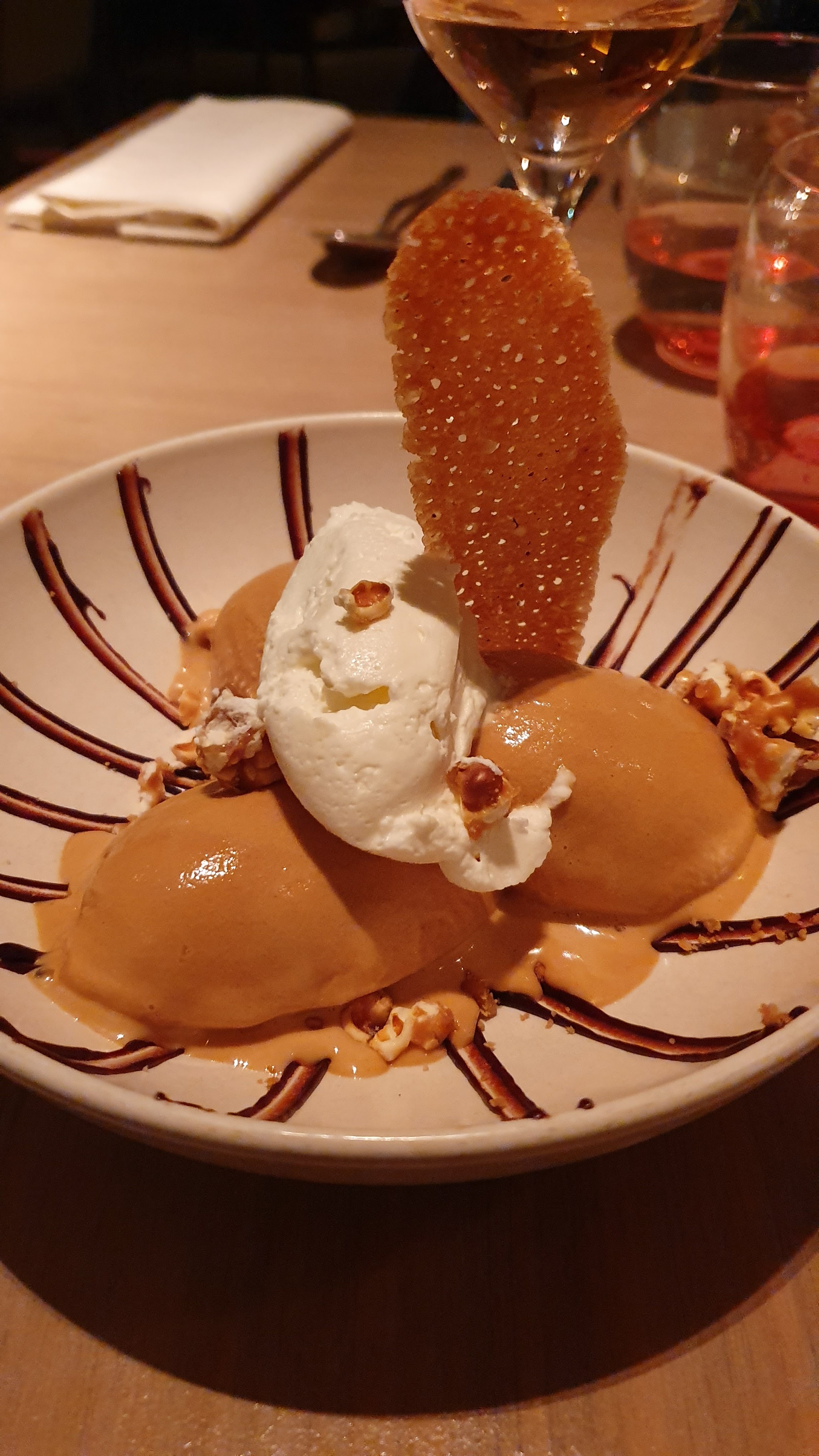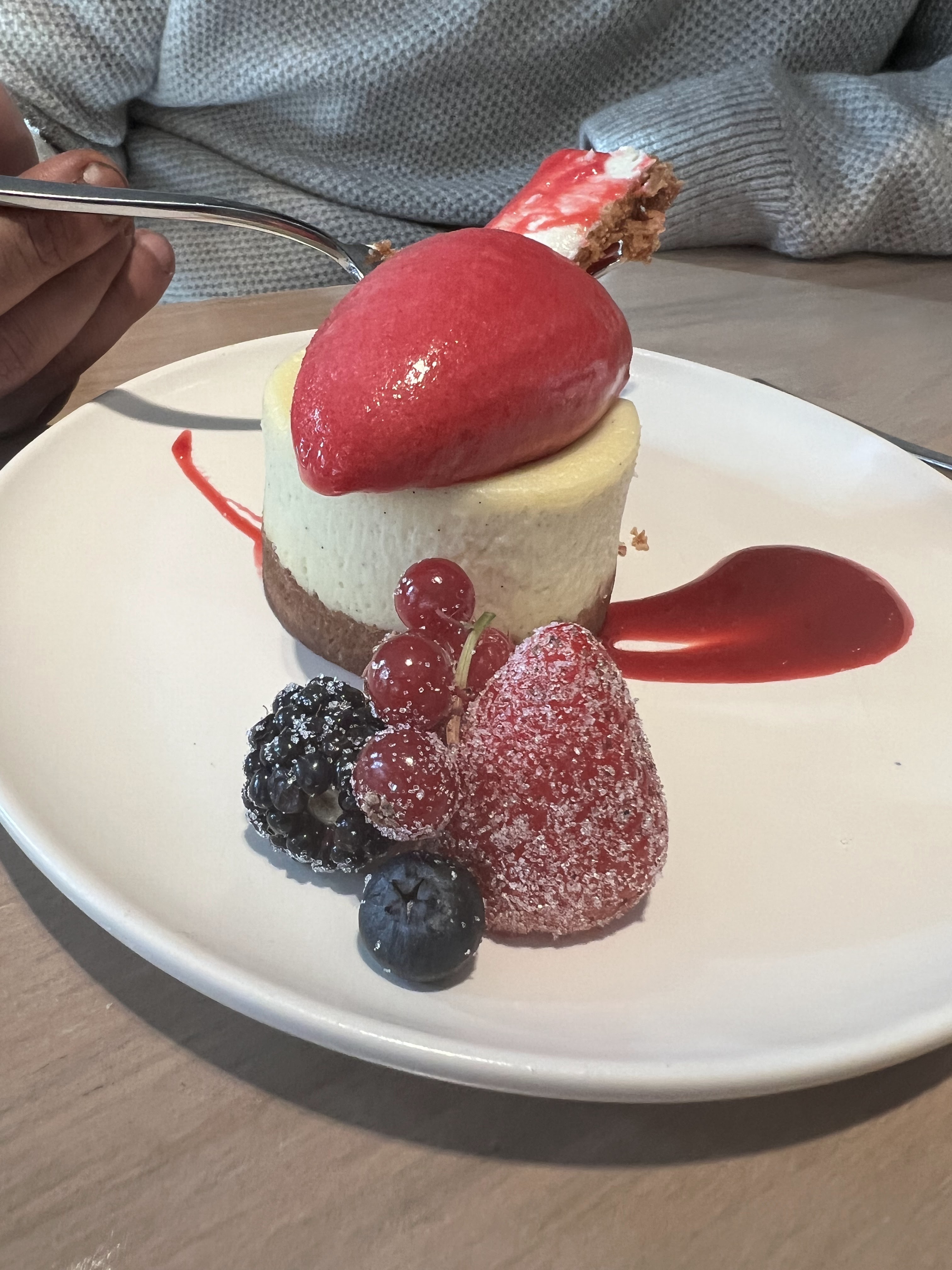 La nourriture était exceptionnelle. Malheureusement, j'avais déjà mangé mon entrée donc pas d'image, mais le carpaccio de thon sauce gingembre était incroyable. Les deux plats principaux étaient excellents et la pièce de résistance était le gâteau au fromage avec sorbet à l'orange. Un excellent mélange d'ingrédients que je recommanderais sans hésiter. Les serveurs étaient serviables et recommandent un vin délicieux. Il convient de noter que la table près de chez nous était plutôt difficile et que les serveurs semblaient heureux de s'adapter continuellement. Ça vaut vraiment le détour... N.-B. c'est cher.