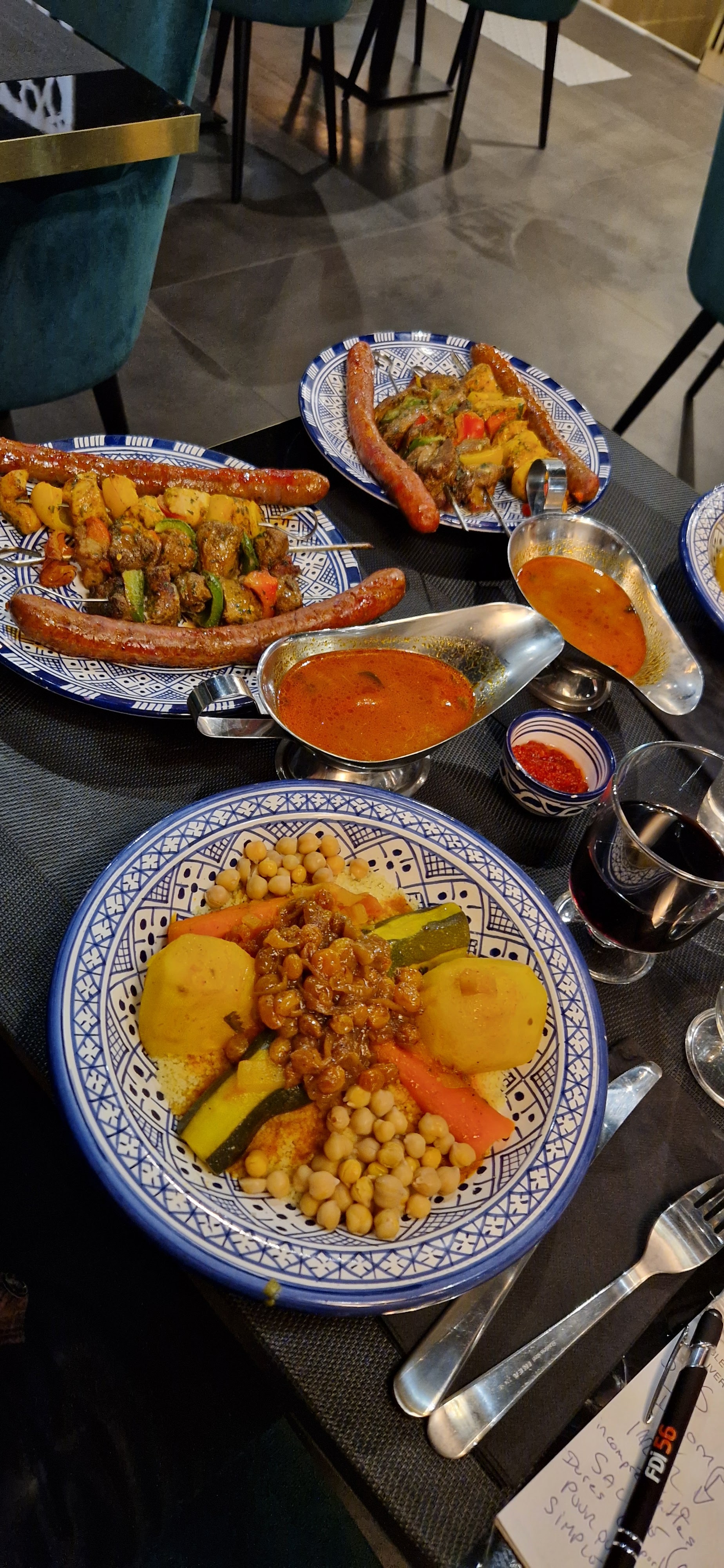 Malheureusement nous ne sommes que de passage dans la région mais quel régal ! Couscous royal pour mon collègue et trio de brochettes pour moi avec la salades de poivrons : il ne reste rien dans nos assiettes ! C'est un régal pour les papilles mais également pour les yeux avec un restaurant très joli et cosy où l'accueil est chaleureux