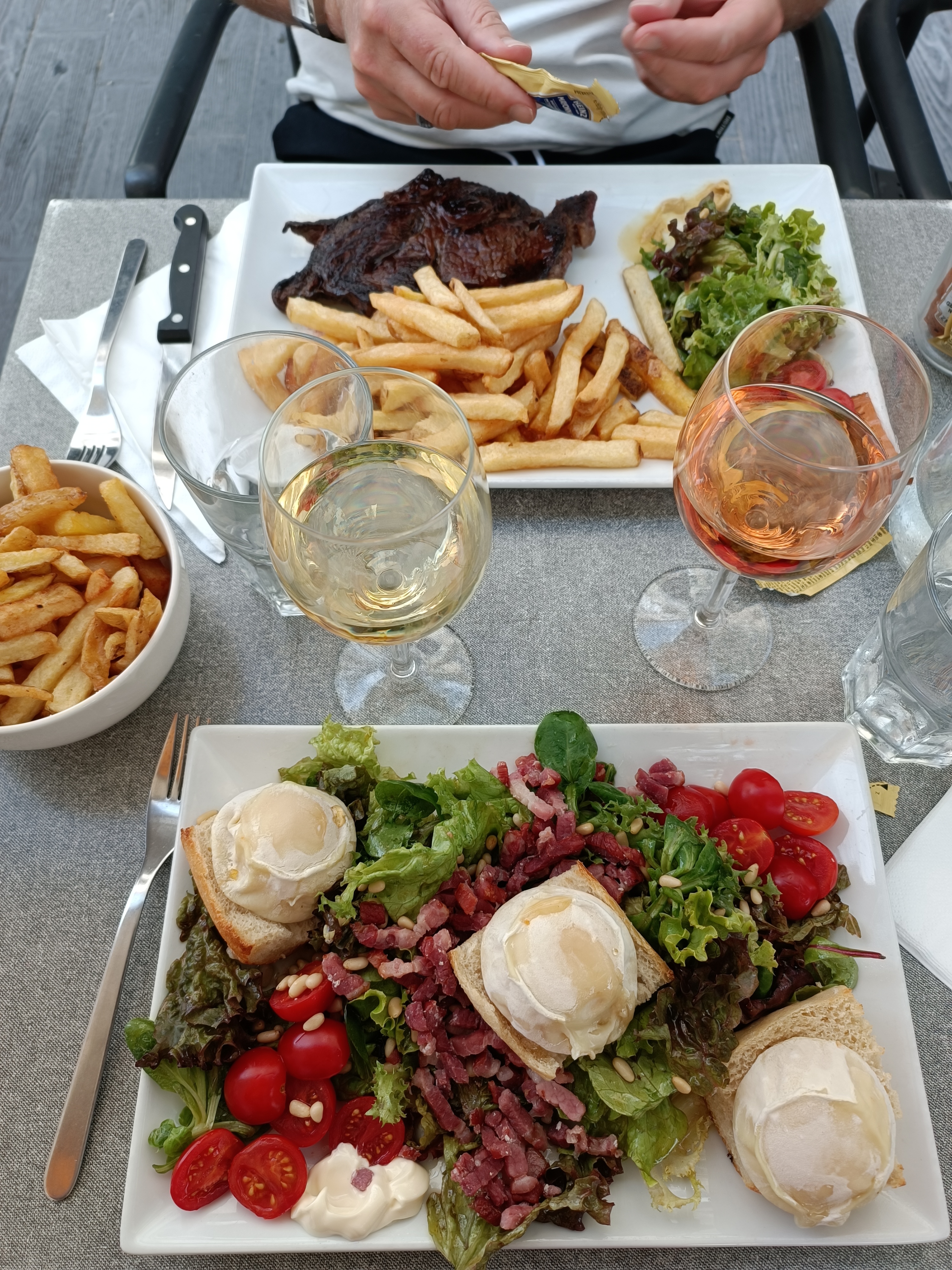 3 ou 4, bénéfice du doute. Il y avait beaucoup de monde quand nous sommes arrivés pour le déjeuner, le personnel était stressé ou nous ignorait. Pénurie accidentelle de personnel aujourd'hui ou norme au déjeuner ? Ma salade n'était pas bonne, trop de morceaux de bacon accrochés ensemble, trop de vinaigrette. Le vin était chaud et on vous a donné un seau de glaçons. Les frites, en revanche, étaient délicieuses, et le faux-filet de mon compagnon de table sauce roquefort était apparemment aussi très bon. Le dessert est également délicieux. Après le déjeuner, le gérant s'est à nouveau détendu et a plaisanté avec ceux qui venaient boire un verre. Nous avons passé un très bon moment sous le parasol, donc on ne peut pas se plaindre.