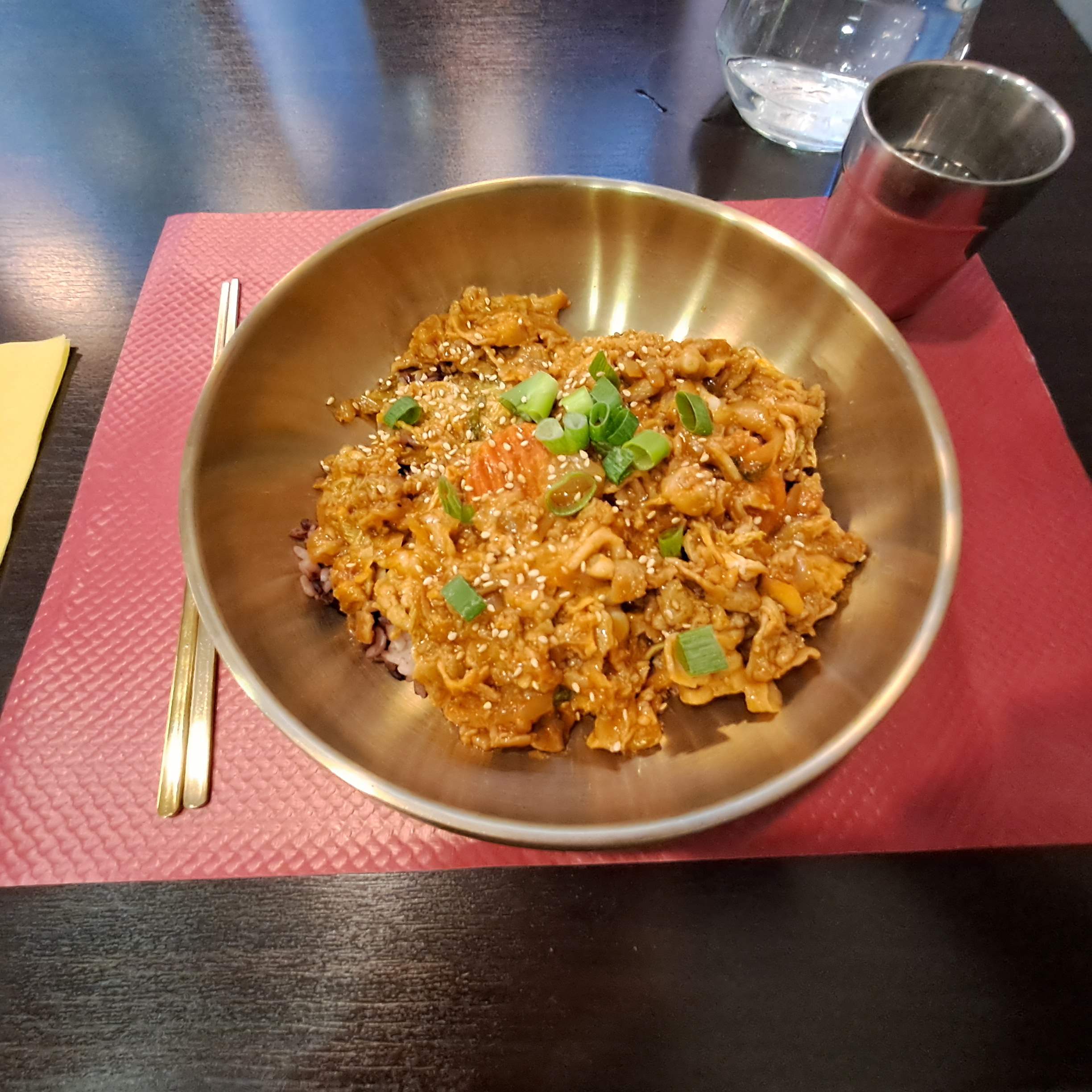 Commande sur internet (Ubereats), c'était assez cher mais je pensais en avoir pour mon argent. La commande a mise longtemps à arriver, j'ai pris un bibimbap et le menu avec du poulet frit. Le poulet frit était plein de nerfs, vraiment pas de bonne qualité et les portions du bibimbap était insignifiantes, dommage car c'était très bon. Il y a à peine une cuillère de riz et 3 lamelles de boeuf. C'était cher, ca à mit longtemps à arriver, et j'avais toujours très faim. Il y a de bien meilleurs restaurants coréen pour le même prix, je déconseille, c'est décevant.
