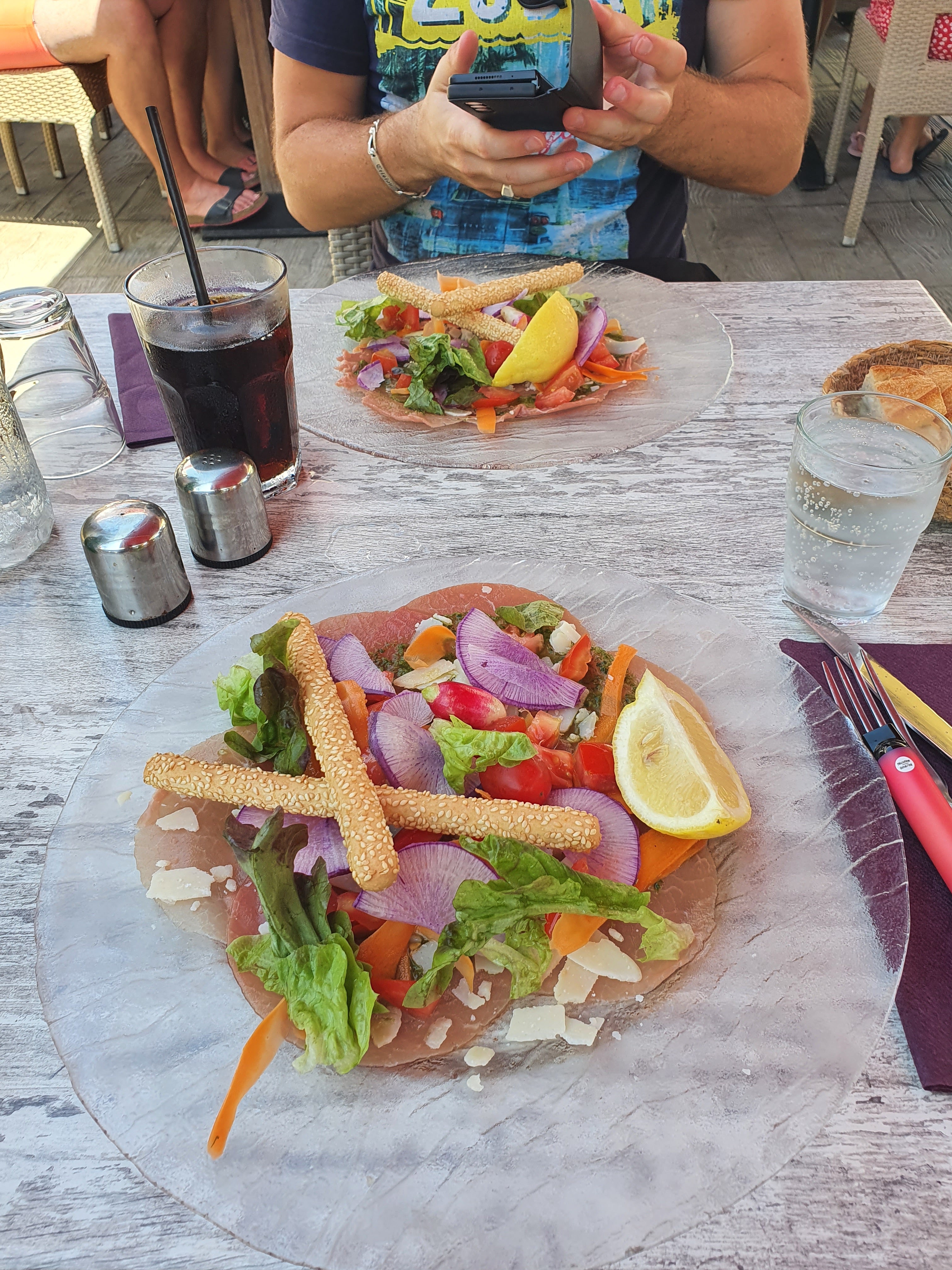 Nous avons commandé un menu enfant et des moules au roquefort c'était bon et frais :) Lieu propre chaises et table désinfectées toilettes nikel ! De nombreuses places à l'ombre. Agréable lieu pour déjeuner au port à bon prix.