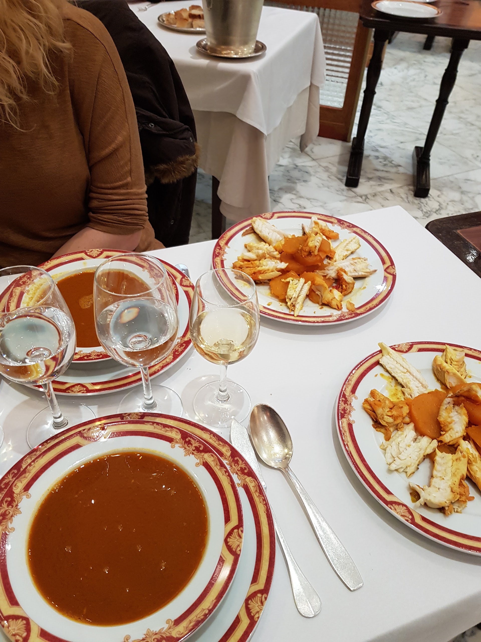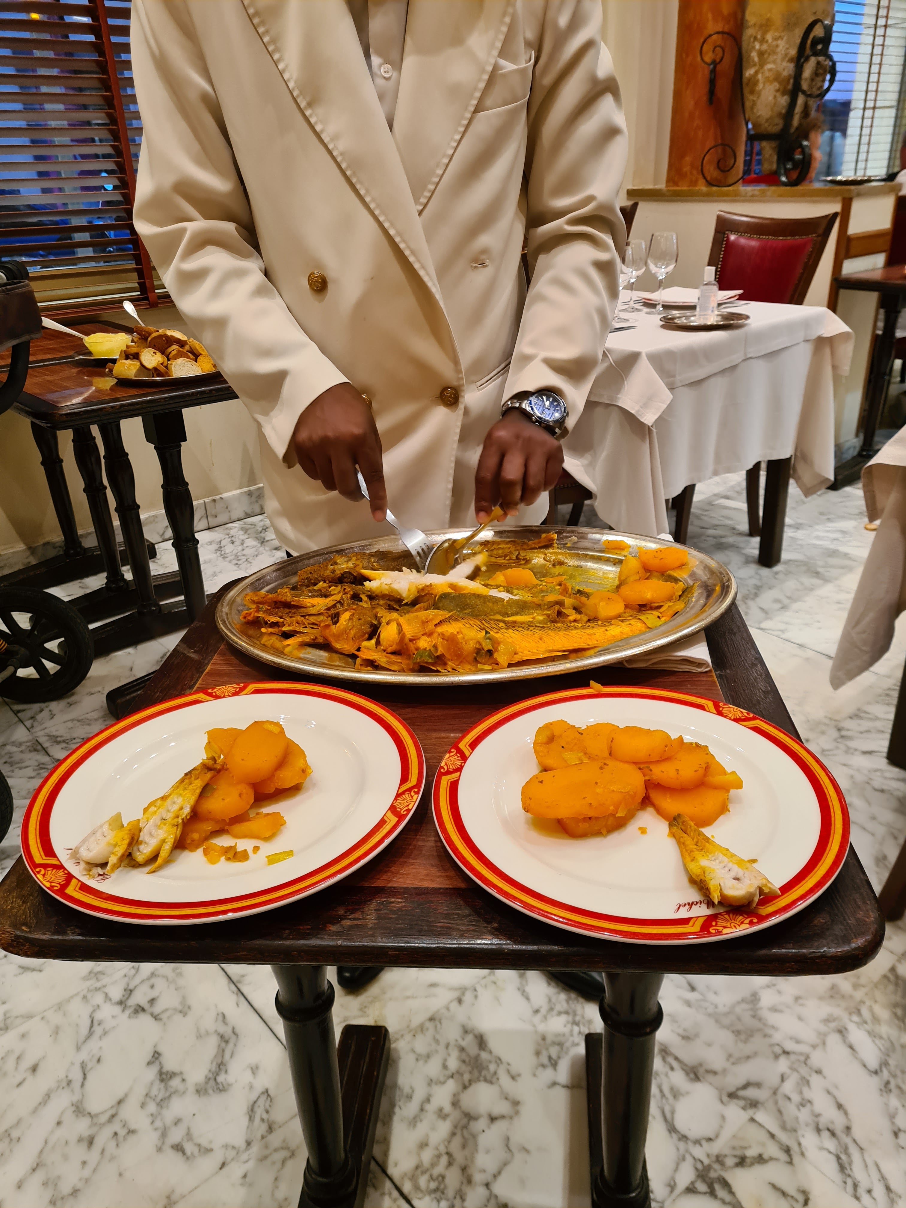 oui tout parait très bien mais... beaucoup de frime du patron, des serveurs que des hommes qui ne regardent pas le client et qui parle foot pendant la préparation des filets devant la table. beaucoup de gaspillage: dans l'assiette pas d'arrêtes mais la moitié du poisson et des pommes de terres repartent à la benne! pourquoi pas un tri plus fin pour qu'on mange plus ou qu'on jette moins? tout cela est bien cher et je ne comprends pas la différence de 20€ avec FONFON qui propose une bonne bouillabaisse pour 55€ au lieu de 75