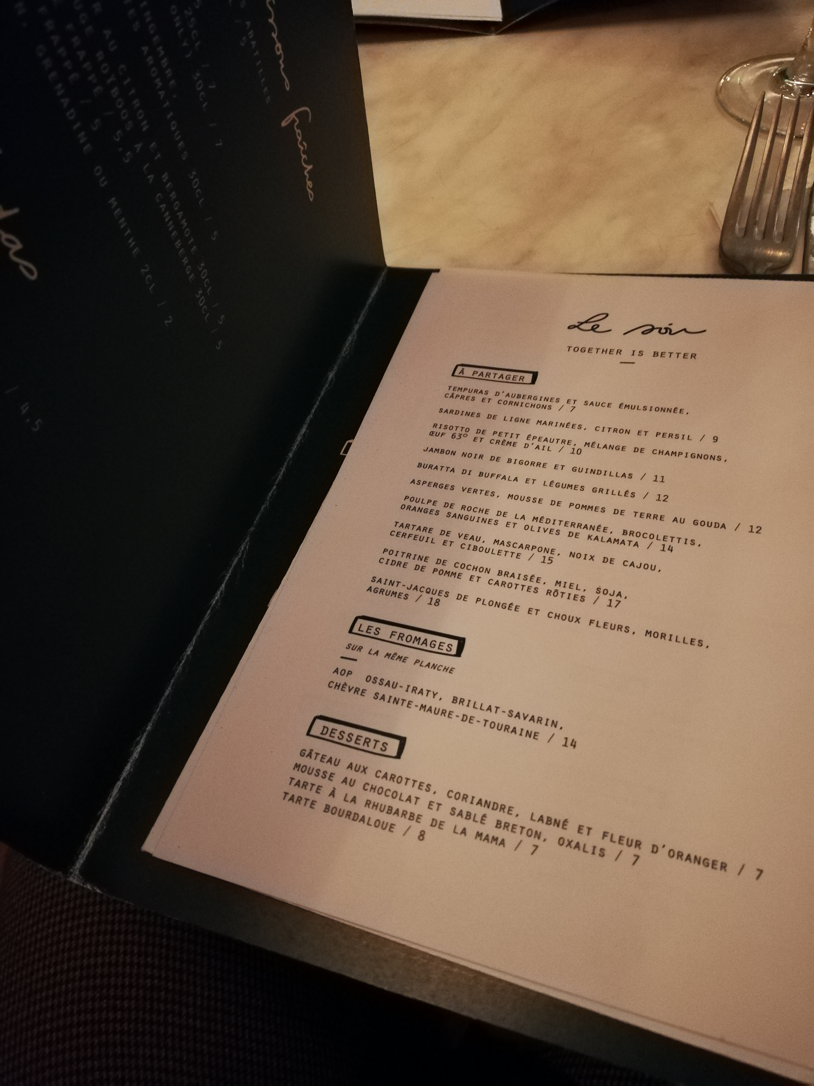 A première vue on pourrait se dire qu'on est tombé sur une énième proposition de bistronomie à Paris, qu'on aura déjà vu la carte partout ailleurs avec les mêmes vins qu'on voit un peu partout et les mêmes types de plat mais non, pas du tout. Une belle découverte au coeur de Paris ! Dans un cadre très agréable, avec un menu qui change tous les jours en fonction des arrivages et des saisons, une belle carte des vins - et de digestifs -, une équipe de bons conseils, on est plus bien plus proches d'une expérience gastronomique aux prix pas astronomiques. Des produits magnifiés et travaillés pour un résultat excellent avec une très belle présentation, une belle recommandation sur les vins et une très bonne poire après le dessert - il est rare de trouver de bons digestifs à Paris je trouve, c'est donc assez exceptionnel pour être relevé. J'ai presque envie de conclure : qui peut faire Mieux ? Très bon rapport qualité / prix, foncez ! N.B.: la réservation est obligatoire / fortement conseillée. - et désolé c'était tellement bon et dans une belle ambiance que je n'ai pas pris de photos cette fois-ci.