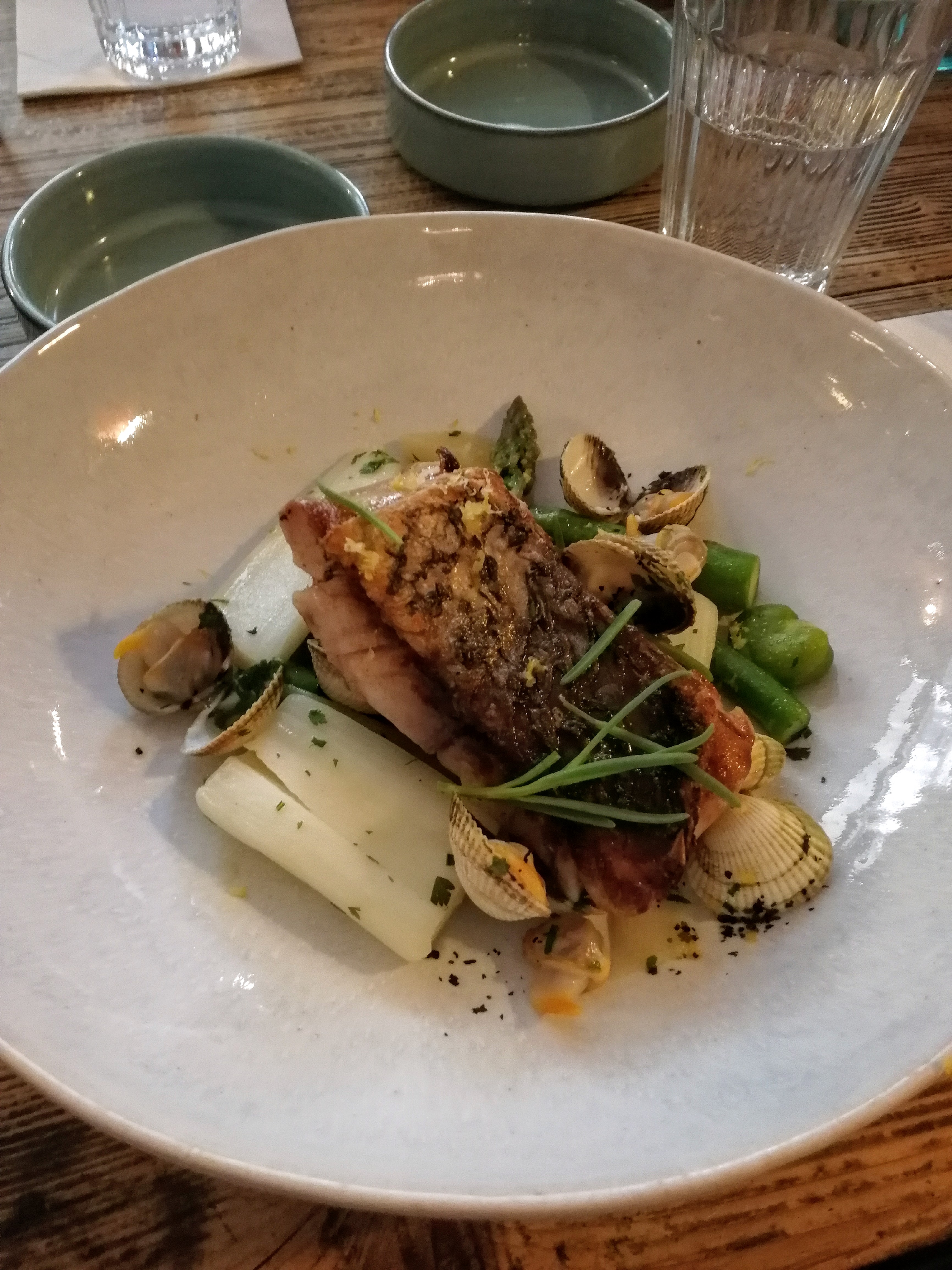 Accueil très plaisant. Service excellent. Serveur souriant, attentionné, parfait. Cadre style bistrot, chaleureux. La déco mélange le style loft et l'ambiance à l'ancienne. (Attention à ne pas aller trop loin dans le genre brocante). La cuisine est très bien. Le plat (du bar) aurait pu être un peu plus copieux mais il était bon, comme l'entrée et le dessert. Tout était savoureux. Bonne sélection de vins Prix corrects, un petit peu élevés si on prend trois olats et un peu de vin. Au final, une bonne adresse, sympa, où on passe une bonne soirée.
