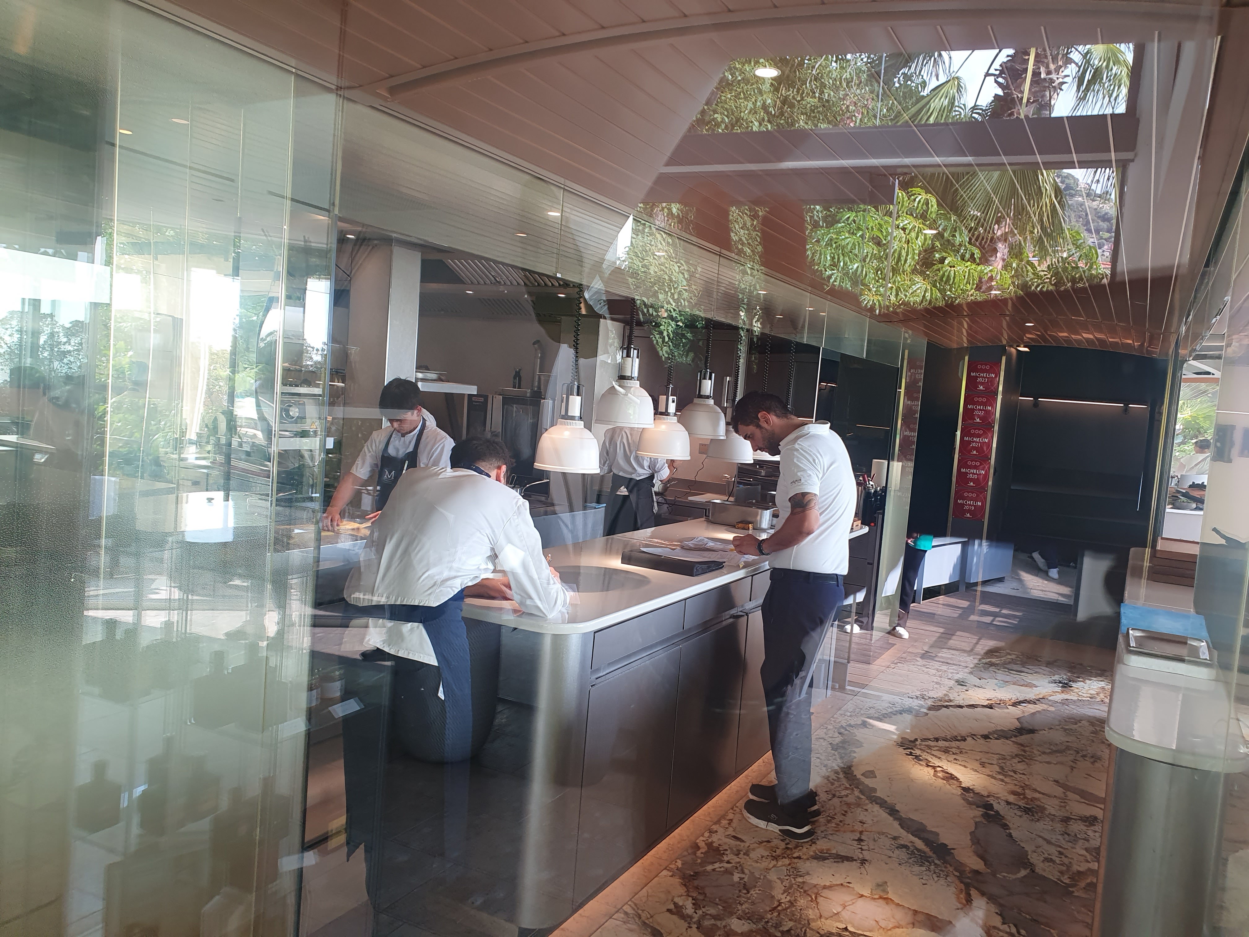 Premier restaurant du monde sans plastiques jetables... Une cuisine neuve et incroyablement propre, animée par un Chef et une équipe passionnés par leur métier. Ils travaillent avec une vue magnifique sur la Méditerranée, ce qui ne manquera pas de les inspirer, et la vue depuis la salle est encore plus belle. Bravo.