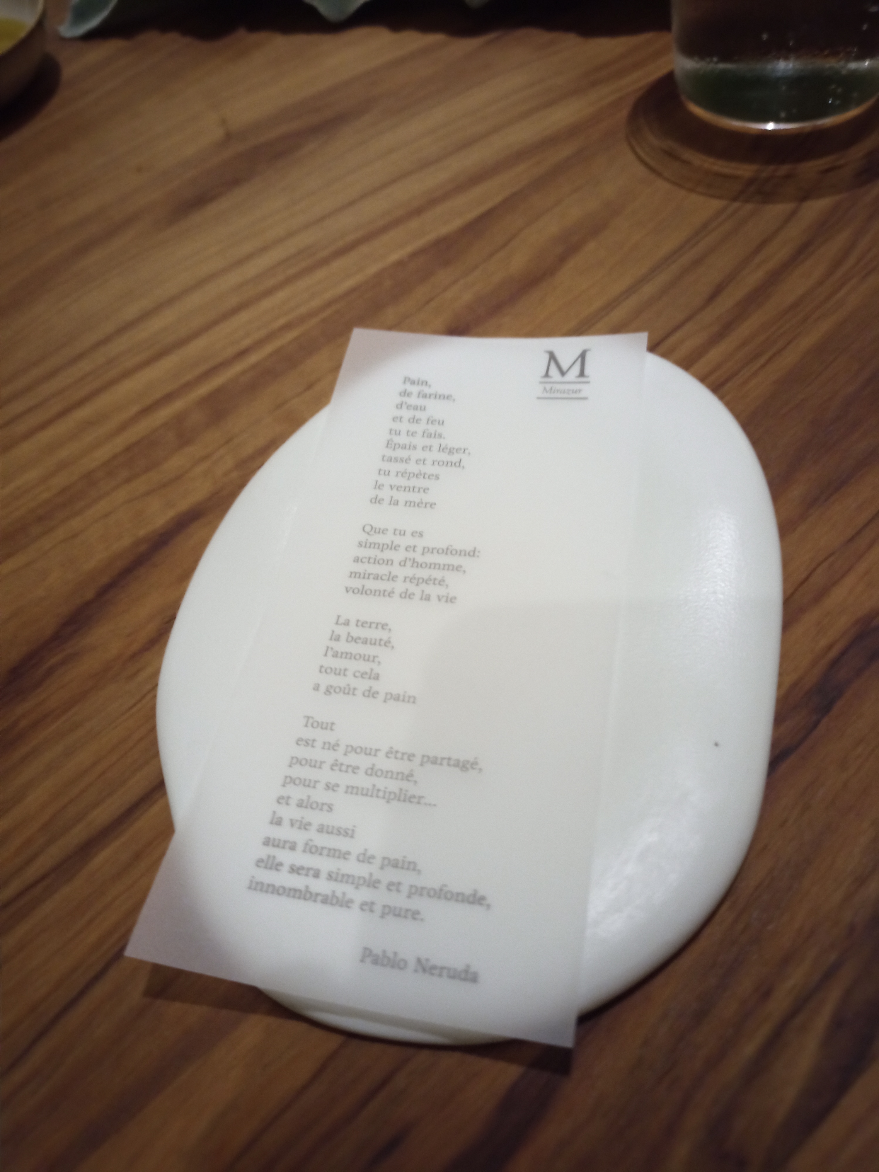 Quand on va au mirazur, on part en expérience culinaire et gustative assez remarquable. Selon le calendrier lunaire vous allez avoir le thème de feuilles, fruits, racines,… mais vous ne serez pas déçus. Pour un restaurant largement étoilé l’accueil est agréable toute en simplicité et délicatesse. Ici pas toujours de nappe blanche; on mange sur la table en bois, et pourquoi pas ( pour certains plats) avec les doigts, ce qui nous sort du classique restaurant étoilé un peu rigide et coincé. L’accord du vin est parfait ( bravo à l’équipe de sommeliers ). Comptez 2h30 à 3 heures pour vivre pleinement l’expérience puis pourquoi pas une pause dans une des terrasses à contrebas très agréables. Vous allez peut-être partir avec le menu et un encas pour le lendemain afin de prolonger le souvenir gustatif assez exceptionnel où la qualité des produits épouse si bien la créativité du chef.