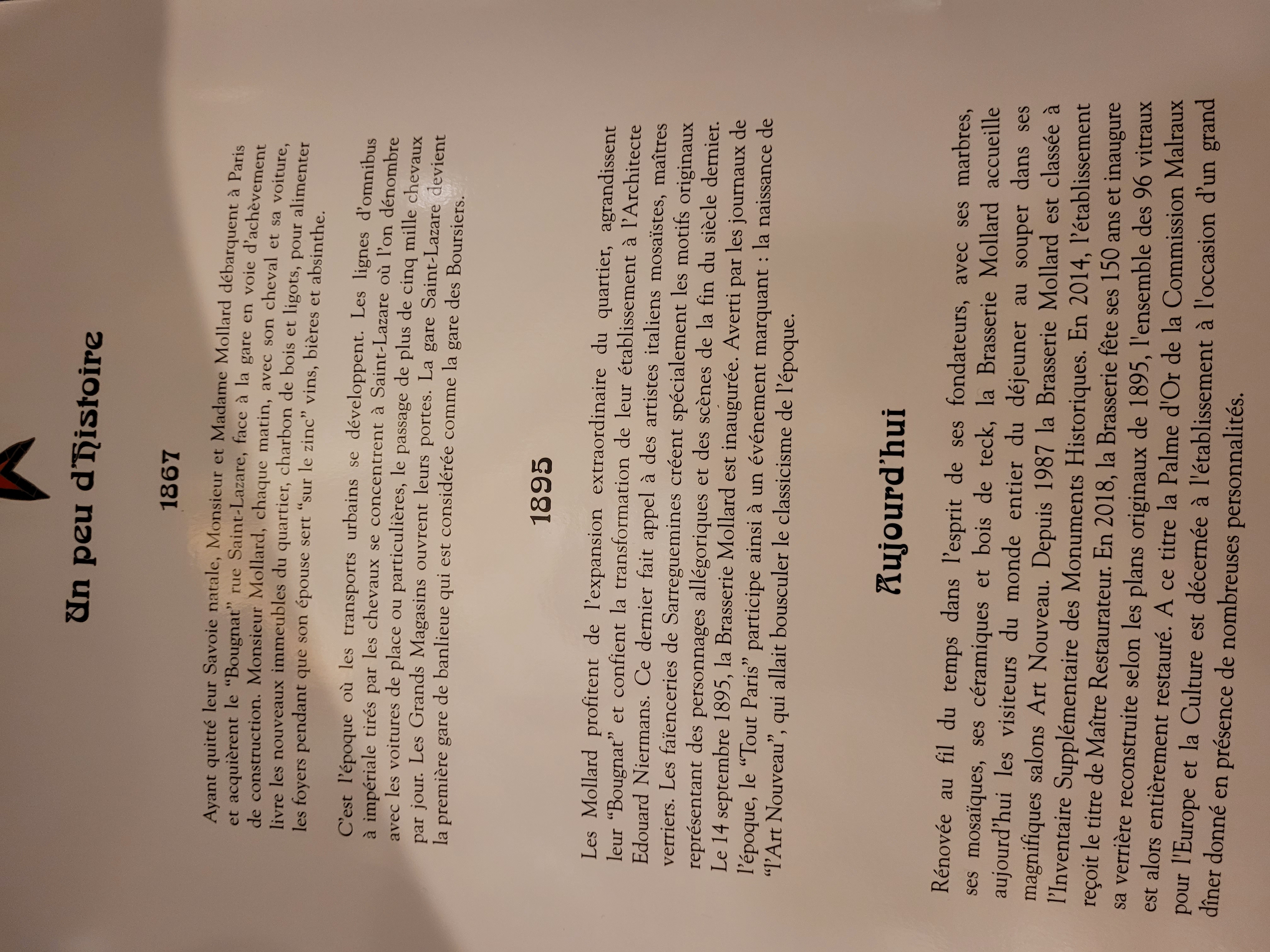 C'est en 1867 que Mr et Mme Mollard acquièrent le Bougnat. Pendant que monsieur livre le charbon de bois, madame sert vins, bières et absinthe sur le zinc. En 1895, la brasserie Mollard, à quelques pas de la gare Saint-Lazare et des grands magasins (Galeries Lafayette, Printemps...) sera agrandie avec des faïences de Sarreguemines, dans un style nouveau. Si l'esprit de l'époque, quant à l'ambiance de cet établissement est perceptible, la modernité dicté par l'intérêt est de mise. Hélas ! Plusieurs menus, une carte bien fournie basée surtout sur le poisson, les coquillages et les crustacés, une sélection de vins de qualité, des apéritifs variés mais à des prix prohibitifs. Nous avons choisi le menu à 33.50€, avec en entrée, des asperges vertes, deux exactement, sur deux petites quenelles de crabe épicé et un peu de salade. Le plat principal est composé d'un filet de mérou braisé à la sauce poivrons doux et du riz. En dessert, des crêpes suzette, à l'extrait de Grand-Marnier. Rien à voir avec la recette originale. Grosse déception. D'où une sauce amère, au goût prononcé d'alcool.... de mauvaise qualité ! Les portions sont mesurées et inégales, selon les assiettes. J'ai connu mieux pour moins cher....