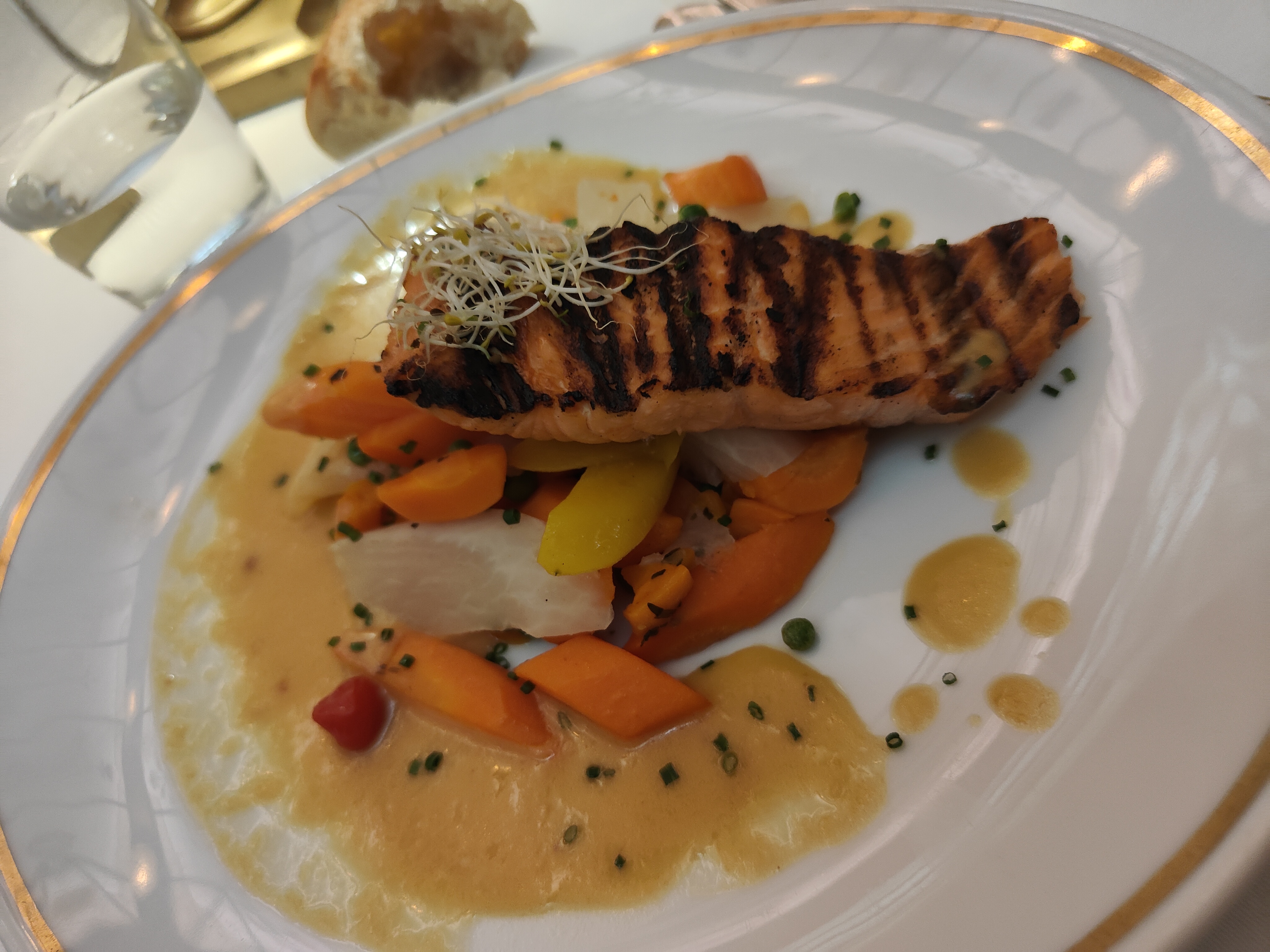 Lieu extraordinaire. Service à l’ancienne. Mais quel dommage que le saumon soit arrivé à table plus que tiède. Difficile d’apprécier le poisson et les légumes entre le froid et le tiède. Le four à micro onde est en panne, l’assiette a été oubliée? Pourtant soirée chaude et aucune raison que le plat refroidisse ainsi entre la cuisine et la table. Invitée je n’ai rien pu dire. Mais heureusement le dessert était délicieux._