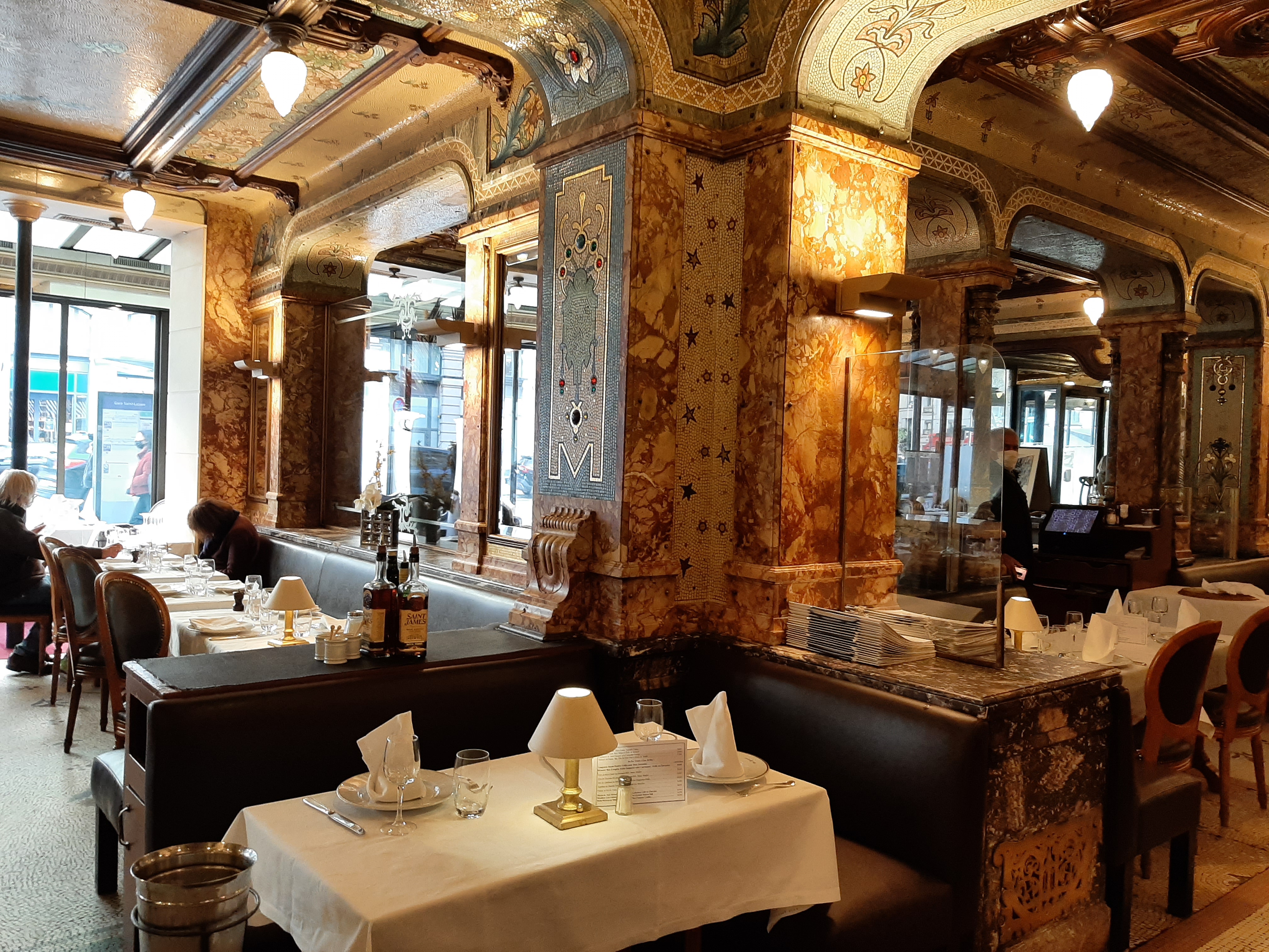 Brasserie renommée pour sa magnifique décoration « art nouveau » , ses mosaïques et sa verrière. L’atmosphère feutrée et les différents recoins de la salle rendent l’endroit très agréable. Les plats restent traditionnels et corrects. Beaucoup de plats avec supplément et il faut compter 40 euros par personne au déjeuner sans boisson. En face de la gare Saint-Lazare , l’adresse est pratique et même calme et confortable malgré le nombre impressionnants de couverts.