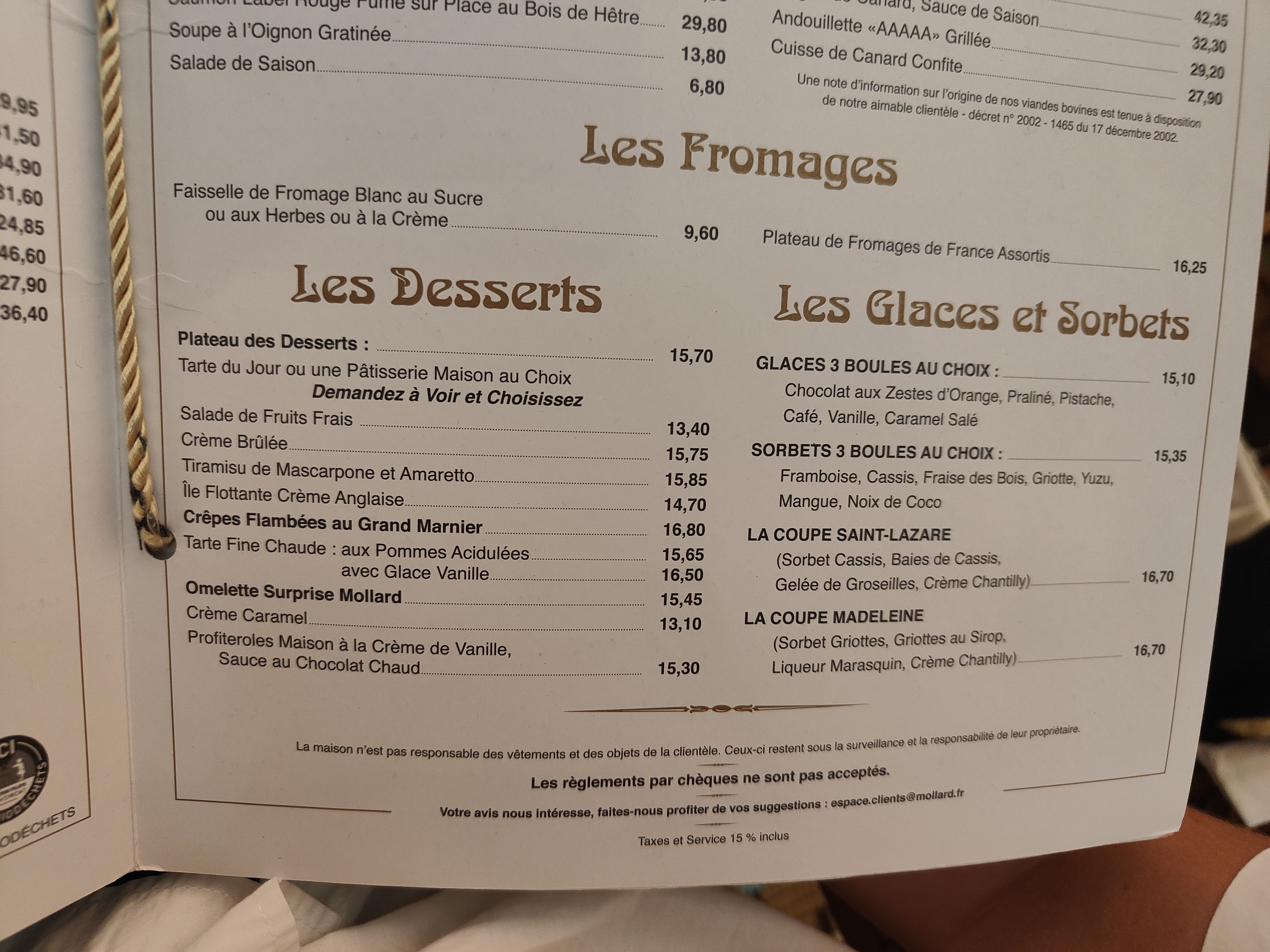 Des crêpes au Grand Marnier préparées à côté des assiettes sales c’est un peu ragoûtant lorsque vous vous trouvez juste en face et l’on ne s’y attend pas chez Mollard. Un serveur un poil trop dirigiste. Mais bon…