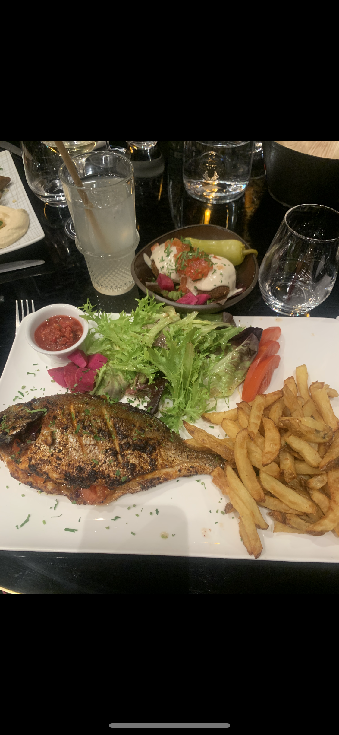 J'y suis allé avec ma famille pour y manger. , la meilleure chose à propos de cet endroit il y avait un menu anglais. à partir du moment où nous avons commandé, nous avons demandé d'apporter la nourriture dès qu'elle est prête, nous avons attendu *40* minutes, avons demandé au serveur et il a dit que le poisson n'était pas encore prêt..., la brochette de kebab était sèche, le l'humus pâteux, le falafel dur comme de la pierre et le café noir très amer, même le baklava n'était pas bon. Et c'est cher, donc ça n'en vaut pas la peine, à mon humble avis.