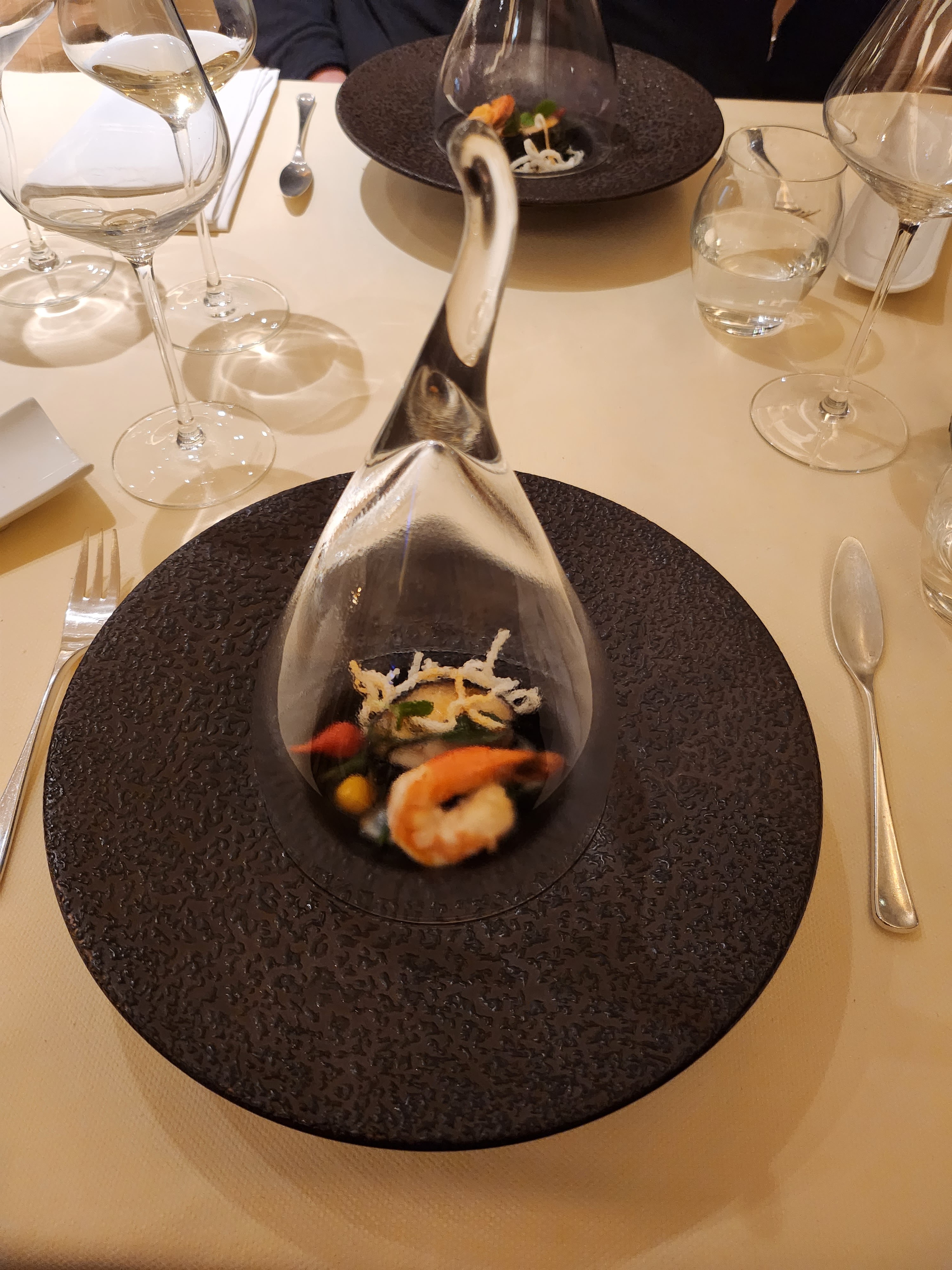 Pour mon compagnon et moi même, c'est la première fois qu'on mangeait dans un restaurant aussi gastronomique. Le cadre est très beau, très sophistiqué. Le décor est sobre et épuré. Les tables et la vaisselle sont très bien. L'ambiance est un peu guindée. Il faisait trop chaud malgré les fenêtres entre ouvertes. Les toilettes sont magnifique et d'une très grande propreté. L'accueil où il y a un petit salon est très sympa, très cosy, ambiance feutrée. Notre serveuse était gentille et agréable, en revanche nous n'avons pas aimé le fait que le personnel soit tout habillé en noir, un peu de couleurs serait plus avenant et plus gai. Aussi le personnel est trop vieillissant, ce serait bien d'apporter un peu de jeunesse. En revanche, et n'est ce pas là l'essentiel, tout ce qu'on a mangé était merveilleux, magique. Nous avons tout adoré. Cuisine extrêmement goûteuse, recherchée, raffinée et merveilleusement bien présentée. Les assiettes sont si jolies et colorées, on dirait des tableaux. Tout est un régal pour le palais, délicieux et très fin. On sent bien que tout est fait maison et que tout est étudié et pensé dans les moindres détails, pour que chaque plat soit une aventure . Bref, une magnifique expérience culinaire, très apprécié. Nous avions peur de sortir avec la faim, vu que tout est en petites quantités. Ce fût tout le contraire, on est sorti repu et finalement impressionné de la quantité de ce qu'on a mangé. De plus, on a plusieurs petits amuses bouches entre chaque plats ( pour faire patienter) bien agréable. C'est ludique et de grande qualité. Les prix sont, ma foi, assez élevés par rapport à ce qu'on a l'habitude de payer lorsqu'on va dans un restaurant classique, ( 10 euros la demi bouteille d'eau minérale, c'est un peu abusé), mais au vu de la qualité et de la quantité, finalement, c'est plutôt correct. Par contre, c'est pas évident de rester 5 heures de temps à table, c'est quand même super long. Nous sommes arrivés à 12h15, reparti à 17h. Mais vue tout ce qu'il y a à manger, on comprend aussi que ça ne peut pas se faire en 1h !!!! Pour conclure, merveilleuse expérience culinaire, nous avons passé un très bon repas. Il faut aussi signaler que les gestes barrières sont bien respectés, distance entre les gens correct, produits d'hygiène à disposition. Par contre, la patronne passe constamment son temps à soulever, voire carrément enlevé sa visière, alors même qu'elle est proche dès clients en train de les servir et de leur parler. À revoir !! ( pour la sécurité de tous).