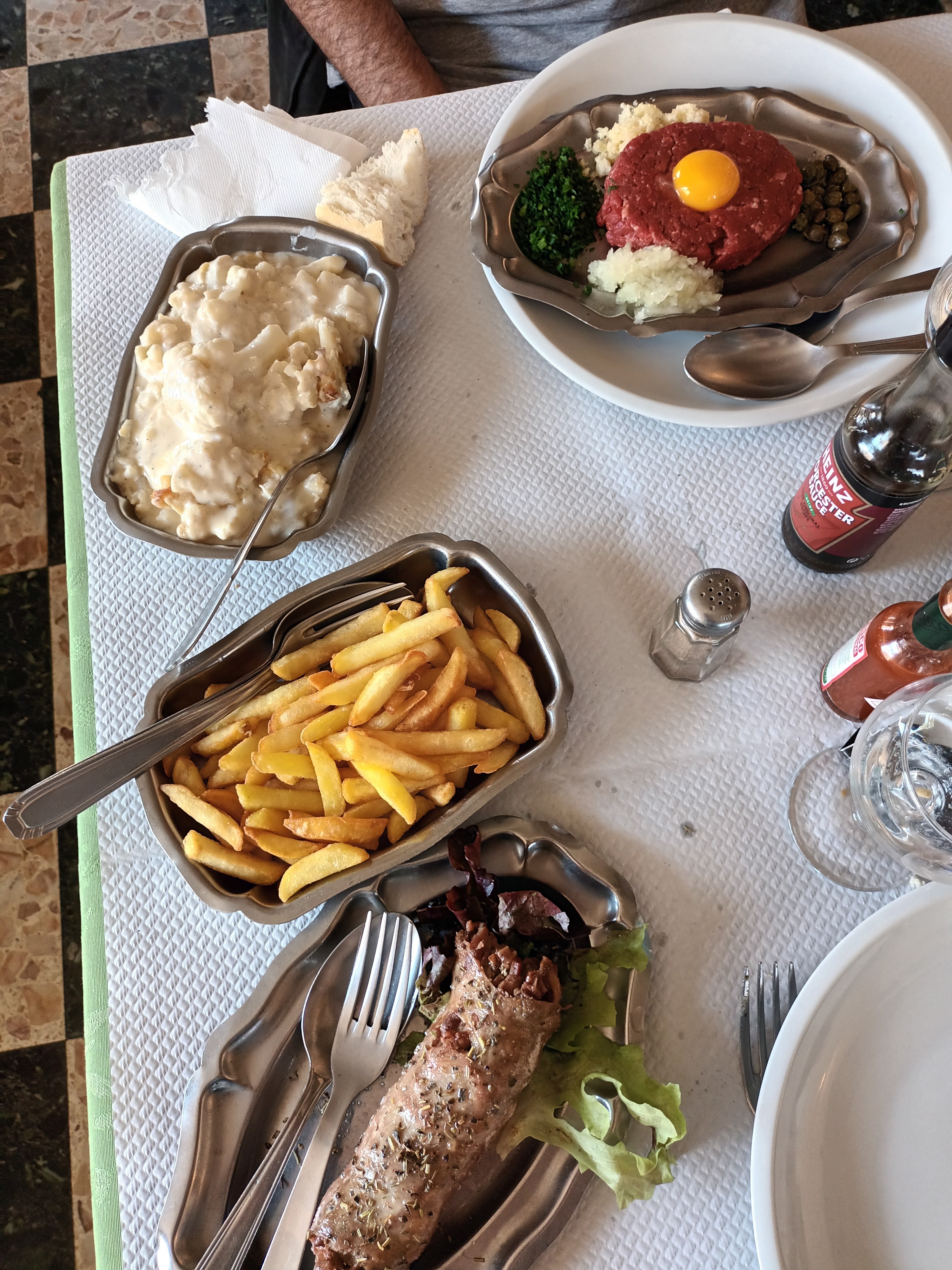 Très bon accueil Service impeccable, rapide et efficace Les plats sont copieux et excellents Entrée : jambon cru (pas papier à cigarette)+salade Milieu : cuisses de grenouilles ail et persil Plats : steak tartare bien rouge avec un œuf Andouillette Garnitures : gratin de choux fleurs (comme celui de grand-mère) , frites Fromage et dessert Le tout pour 25 euros par personne Très bon rapport qualité/prix