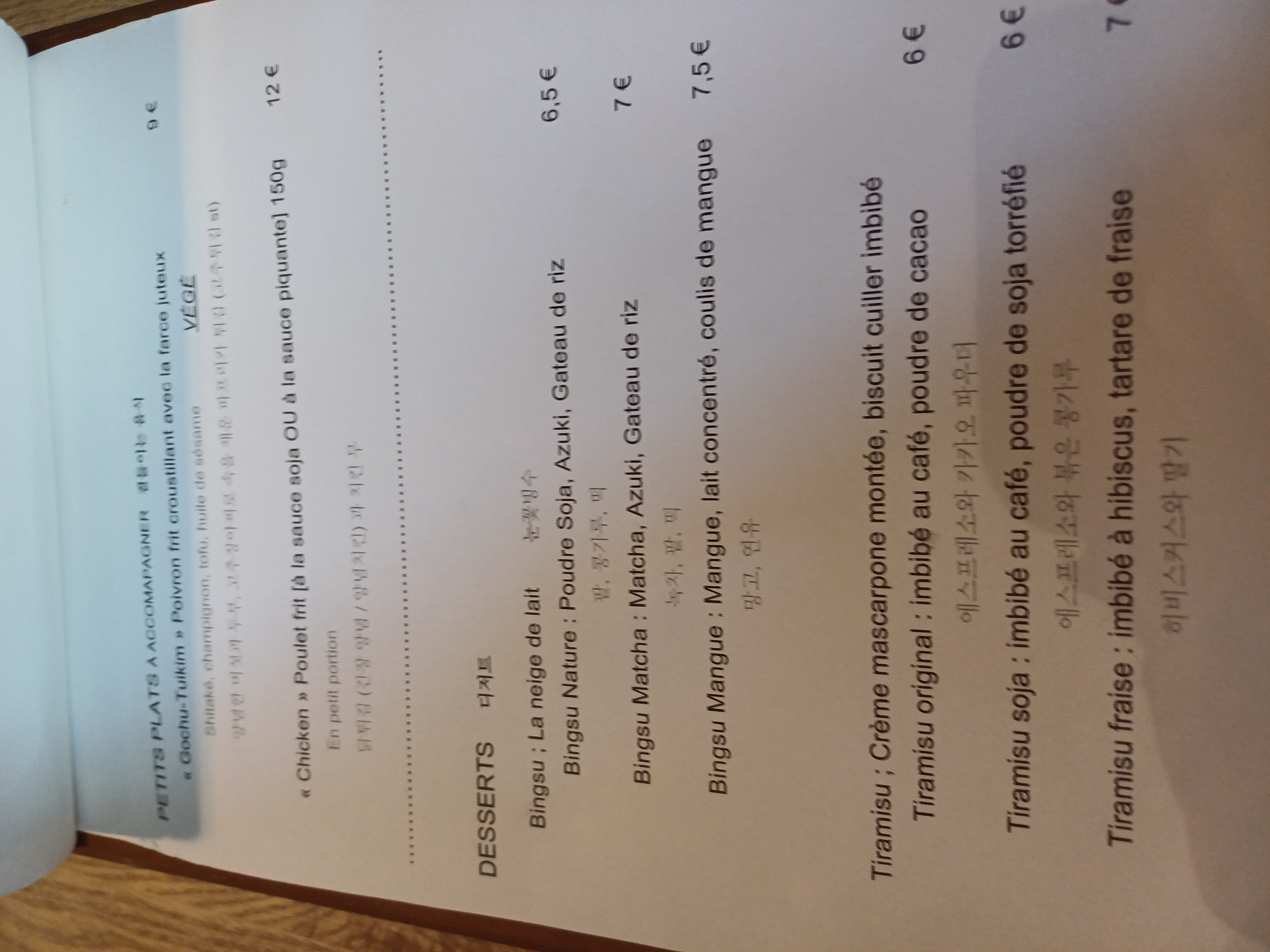Excellent repas coréen ! Le poulet frit sauce piquante en entrée bien croustillant et pas piquant du tout mais plus sucré/salé. On a bien aimé les plats bulgogi et poulet au 7 saveurs . Niveau dessert on a testé les 3 types de tiramisu (matcha , cacao , soja ), la crème est un peu trop compacte à mon goût un peu trop lourd . Mais dans l’ensemble un très bon restaurant coréen !