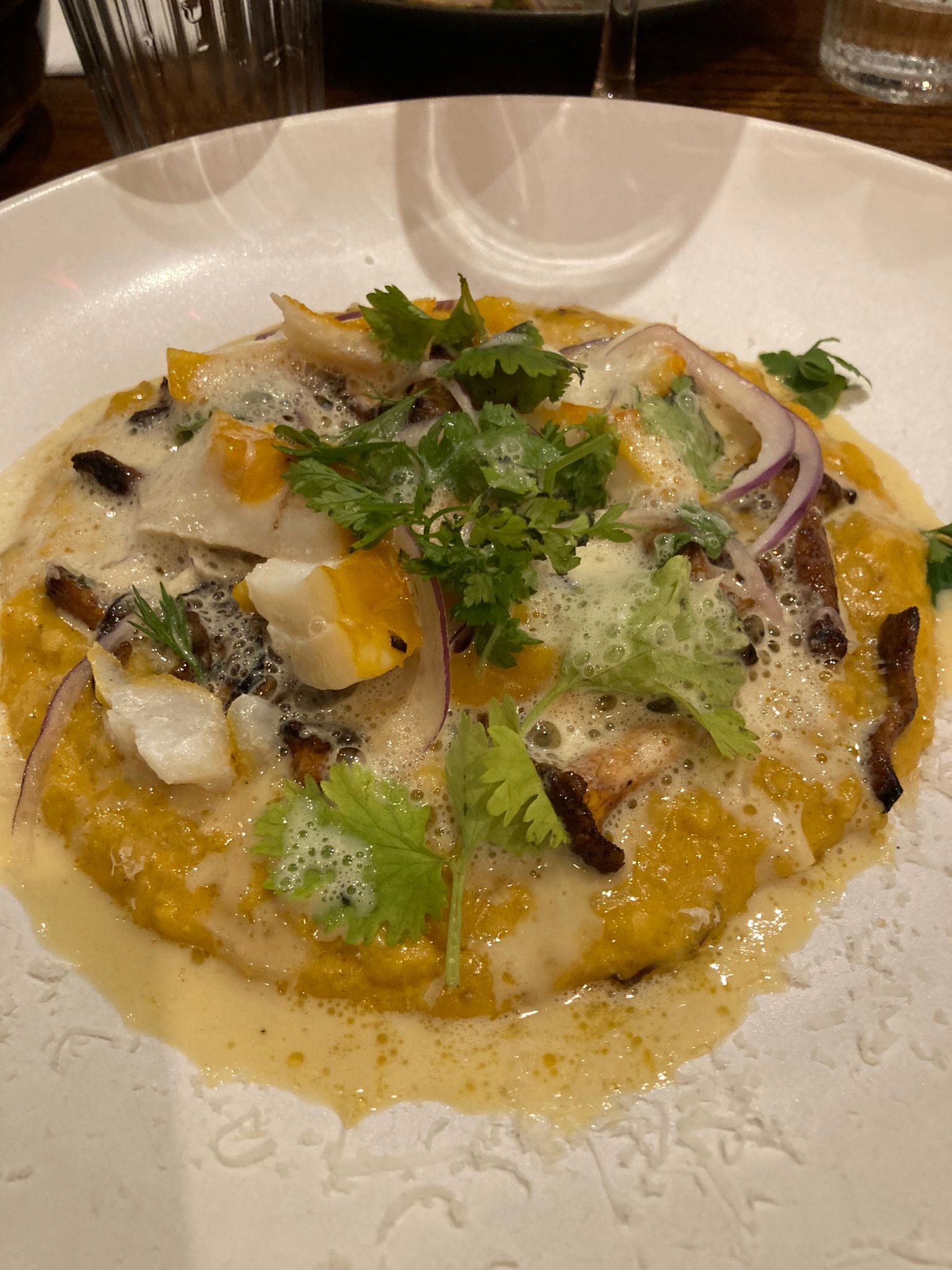 Ce restaurant est incroyable ! Nous avions prévu d'y aller deux fois car le menu change fréquemment, mais nous n'avons pu y aller qu'une seule fois. Mon premier plat était de la chair de crabe avec une purée d'aubergines, ce qui était parfaitement cuit, mais ne correspondait pas à mon goût particulier. Malgré tout, c'était plutôt bien et je ne peux pas me plaindre car l'exécution était impeccable. Le vin était excellent et parfaitement adapté au repas. Pour mon entrée, j'avais un steak d'aubergine et de thon à l'encre de seiche. Au début, j’étais quelque peu déçu – ni l’un ni l’autre n’étaient exceptionnels. - cependant, après quelques bouchées, j'ai réalisé que l'aubergine et le thon étaient faits pour être vécus ensemble et l'incroyable mariage des deux saveurs dans ma bouche a complètement changé mon expérience.
