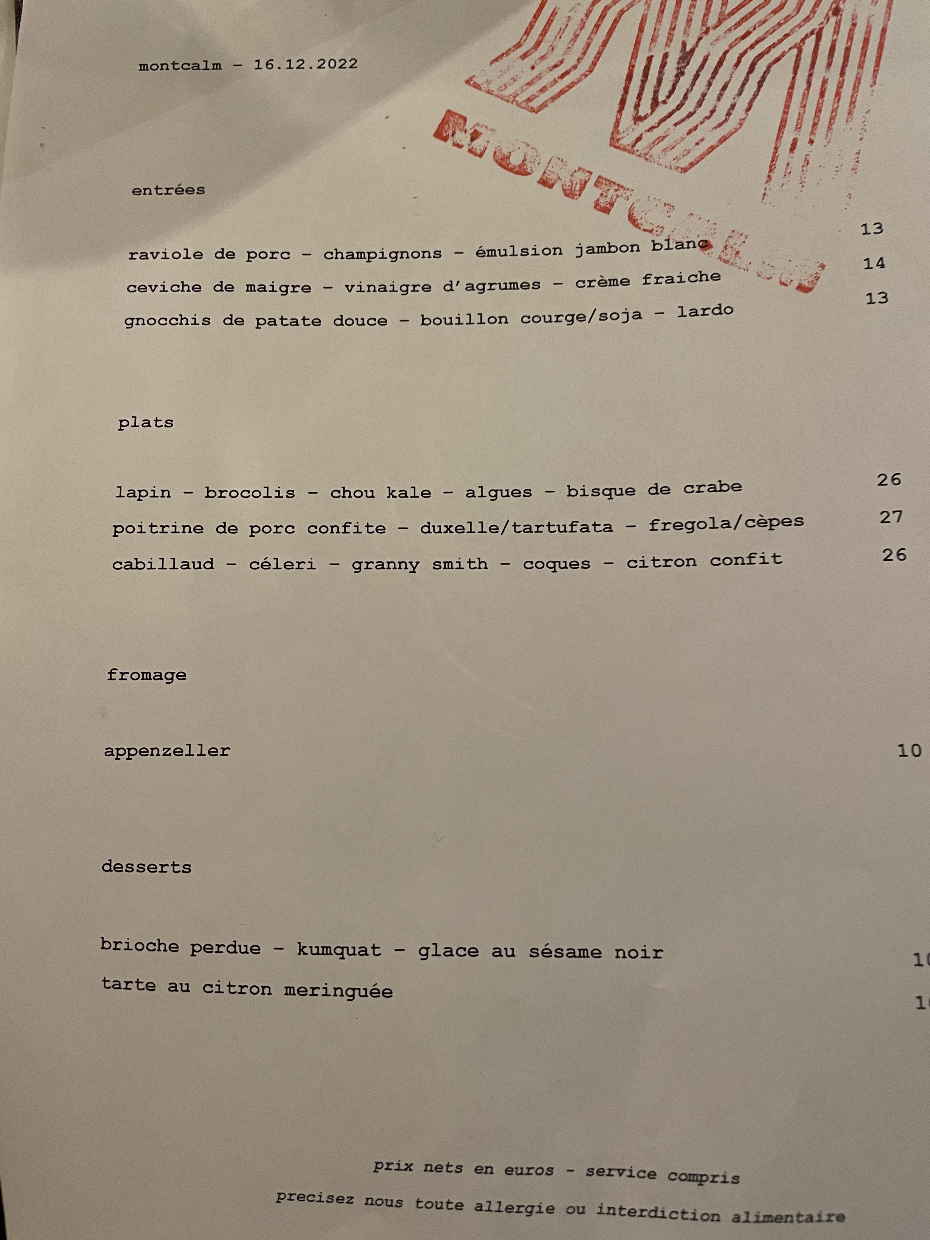 J’ai découvert le restaurant Montcalm avec mes amis du CLAP. Le cadre est sobre, inversement proportionnel du festival de goût et saveurs dans les assiettes ! Tout est soigné à table : les vins, les excellents plats, le service. Des cuissons et associations surprenantes et délicieuses et une ambiance conviviale à la montmartroise ! Bref Un must dans le quartier et à paris pour une addition d’autant plus raisonnable! La carte change tous les 10 jours donc nous y retournons après Noël !