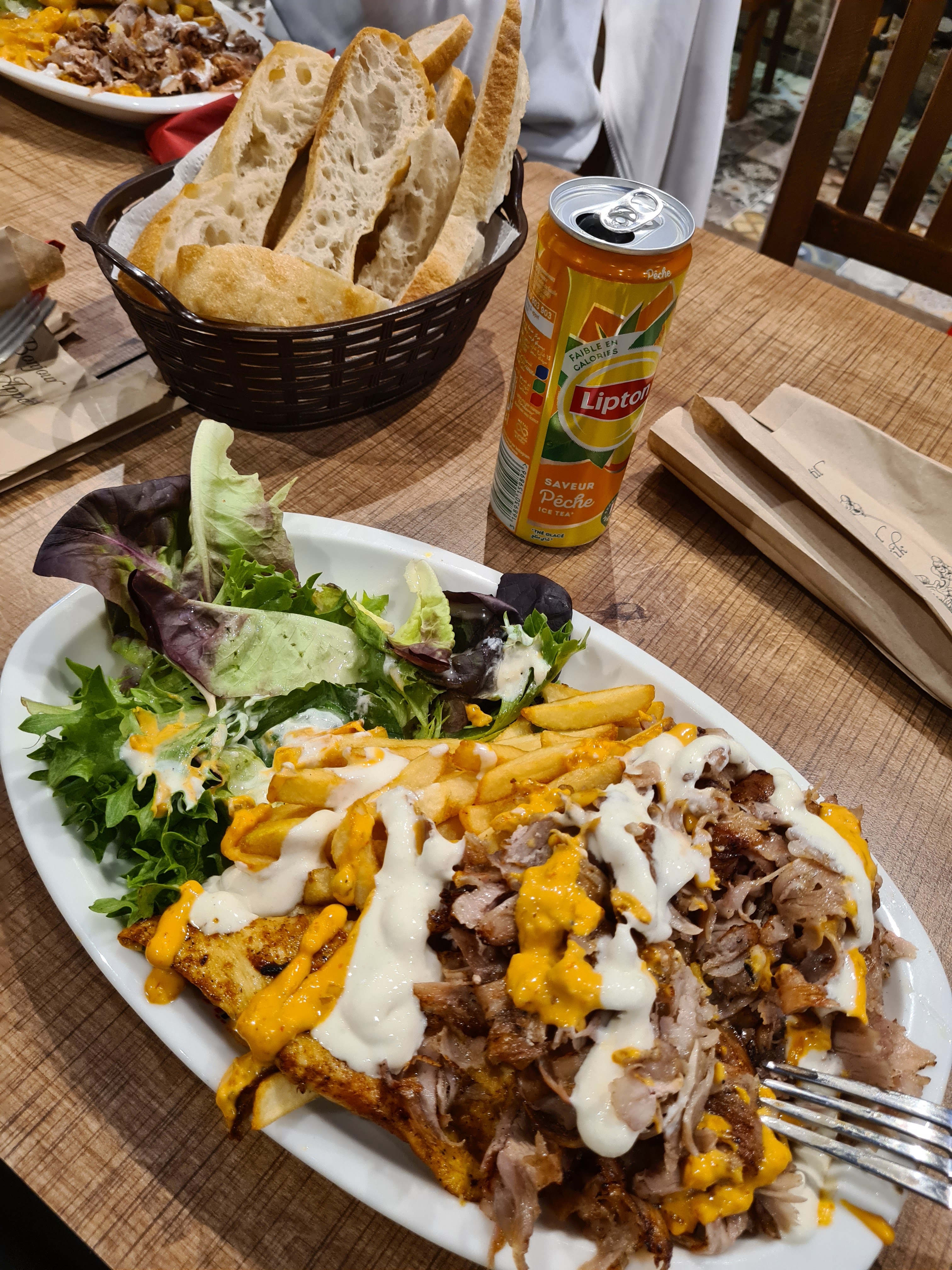 Accueil froid, sourire absent. Il vous est recommandé de payer avant de consommer. Sandwich mal fait (trop d’harissa à un endroit, pas du tout ailleurs), arrachage de palais assuré. Kofte surgelés (pas fait maison) ? Frites pas assez cuites. Vous « devez » débarrasser votre plateau comme au mcdo. Cadre agréable, propre et spacieux. Des petits détails à améliorer qui ont leur importance.