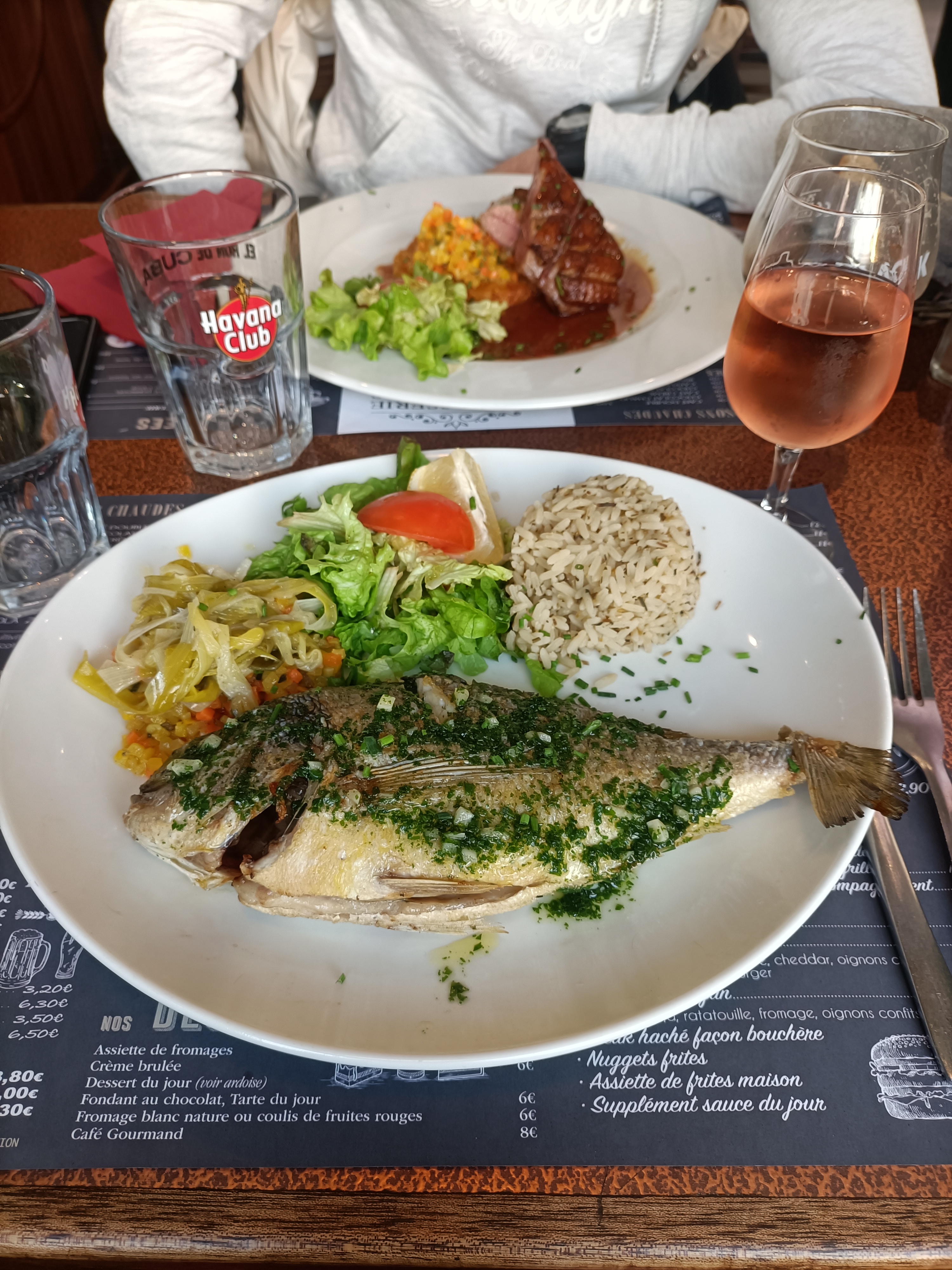 Déjeuner : Filet de Limande, accompagné de riz succulent, légumes et salade. Vin Blanc moëlleux et pour finir Glace. Vraiment excellent, Serveuses, sympathiques, gentilles, souriantes, réactives et courageuses. Merci pour cet agréable moment de détente.