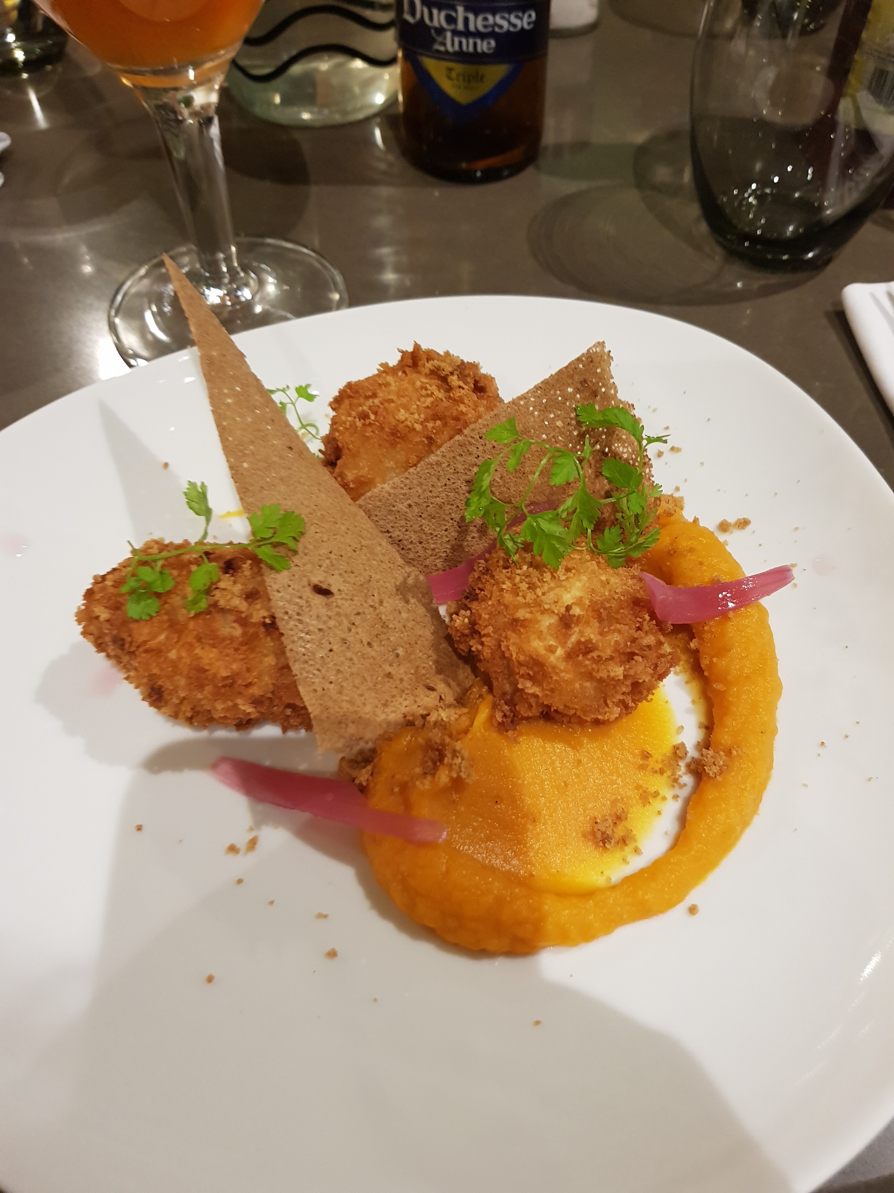 C'était formidable...de l'entrée au dessert..tout était parfait. Brie pané et son chutney abricot, merlu crumble citron et à la fin trilogie de fraises. On s'est régalé...on conseille vivement et en plus le personnel est gentil et serviable....
