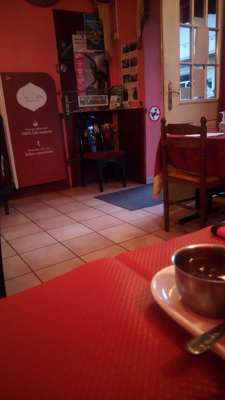 Possible de réserver 1h30 avant le service pour le jour même. Super. Le restaurant se trouve dans la rue de la gare donc prévoir du temps pour se garer (on n avait pas pensé à ça donc 5 min de retard 19h50...). Accueil très sympathique. Apparemment tenu en famille. C était le soir du lundi de Pâques et tout le monde était débordé. L'eau et le Lassi sont arrivés après les entrées (Après réclamation et après avoir mangé les entrées la gorge sèche du coup). Entre la fin de dégustation des plats et la venue de la dame pour débarrasser 45 minutes se sont écoulées...Mon ami voulait partir mais m'a accordé un dessert quand même ! Puis il est allé payer directement au bar pour ne plus avoir à attendre... Je ne me serais pas levée à 3h20 je me serais improvisée serveuse de dernière minute car c'était la même chose pour tout le monde. Une personne de plus en salle aurait été bien (peut être qu' elles sont 3 en temps normal). Cuisine assez bonne et copieuse pour le prix. Il me semble avoir déjà payé plus en commandant moins de choses variées dans d autres restaurants indiens et forcément d'en repartir non rassasiée ce qui n était pas le cas ici. Si vous aimez manger pimenté n'hésitez pas à prendre fort . Comme c était ma première fois au New Delhi j ai commencé par moyen mais ça ne piquait pas beaucoup. Il y a bien sûr le piment sur la table. Les petites sauces sont renouvelées si finies, un autre plus. J ai l intention d'y retourner si l occasion se présente. Je recommande ce restaurant mais il faut avoir du temps et être patient.