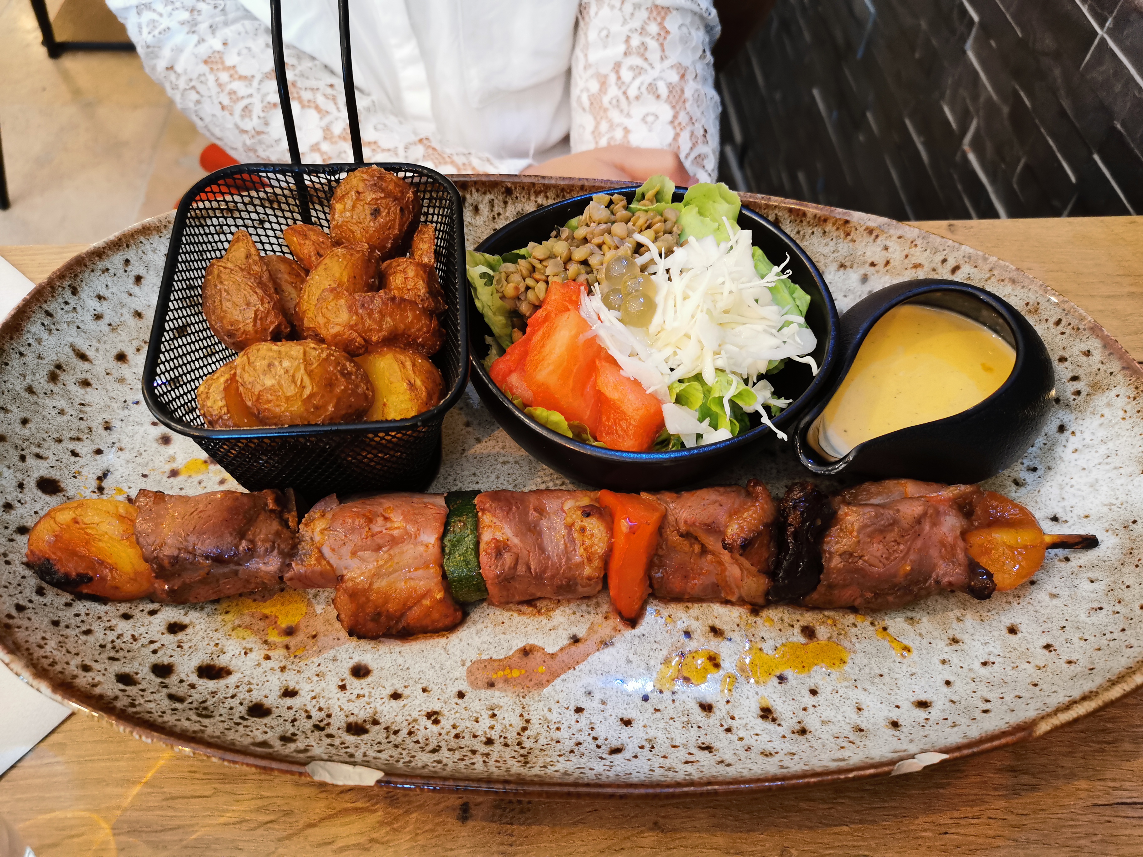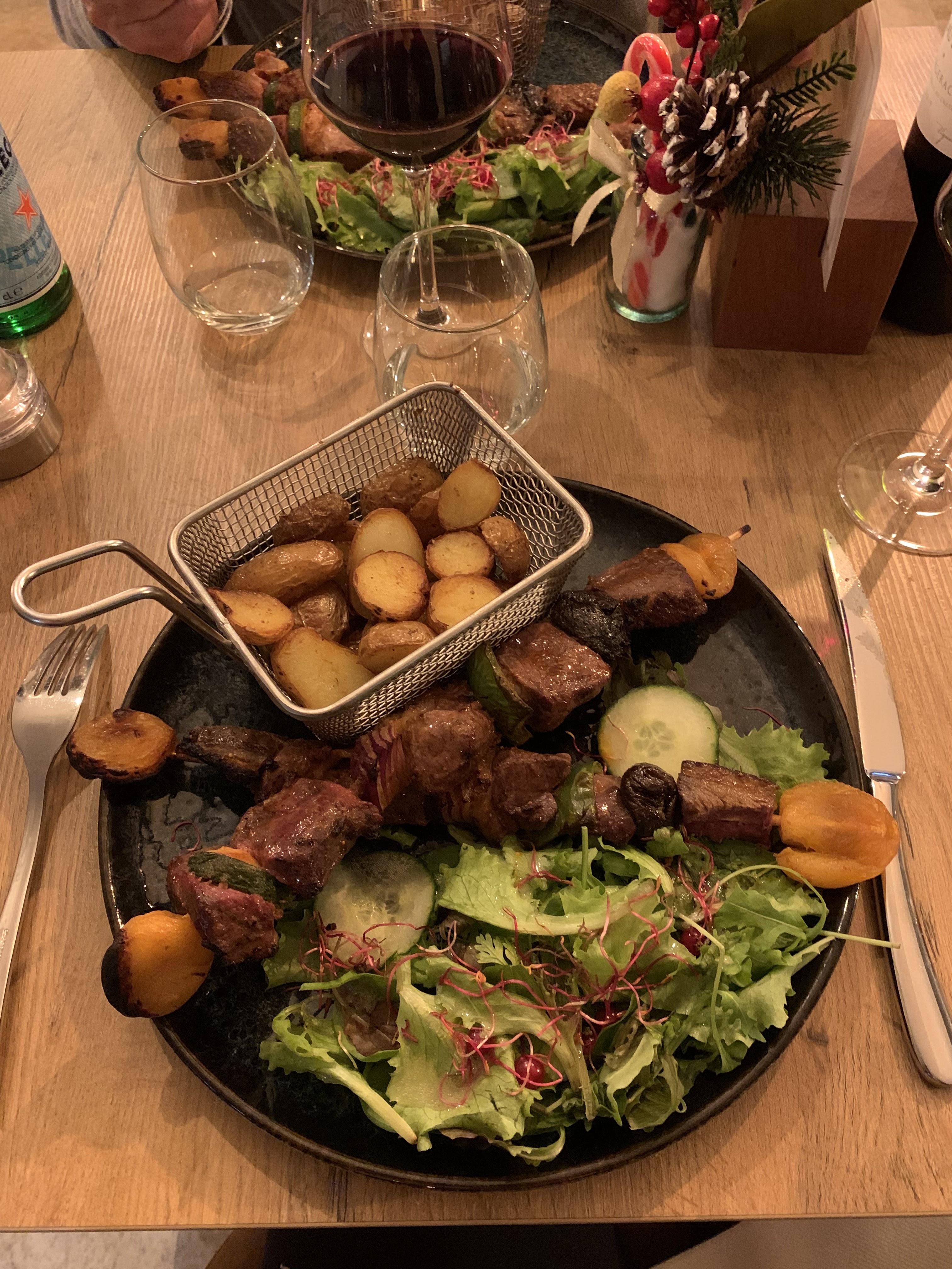 Cadre très sympa ! J'ai pris une brochette de magret de canard que je trouve bonne néanmoins très cher.. 26 euros pour 5 petit morceaux de magret je trouve sa excessif.. Gros bémol sur les chaise extérieure, pas du tout adapté pour des personnes en surpoids.. sa vous serre au niveau des cuisses et rend l'expérience très inconfortable..