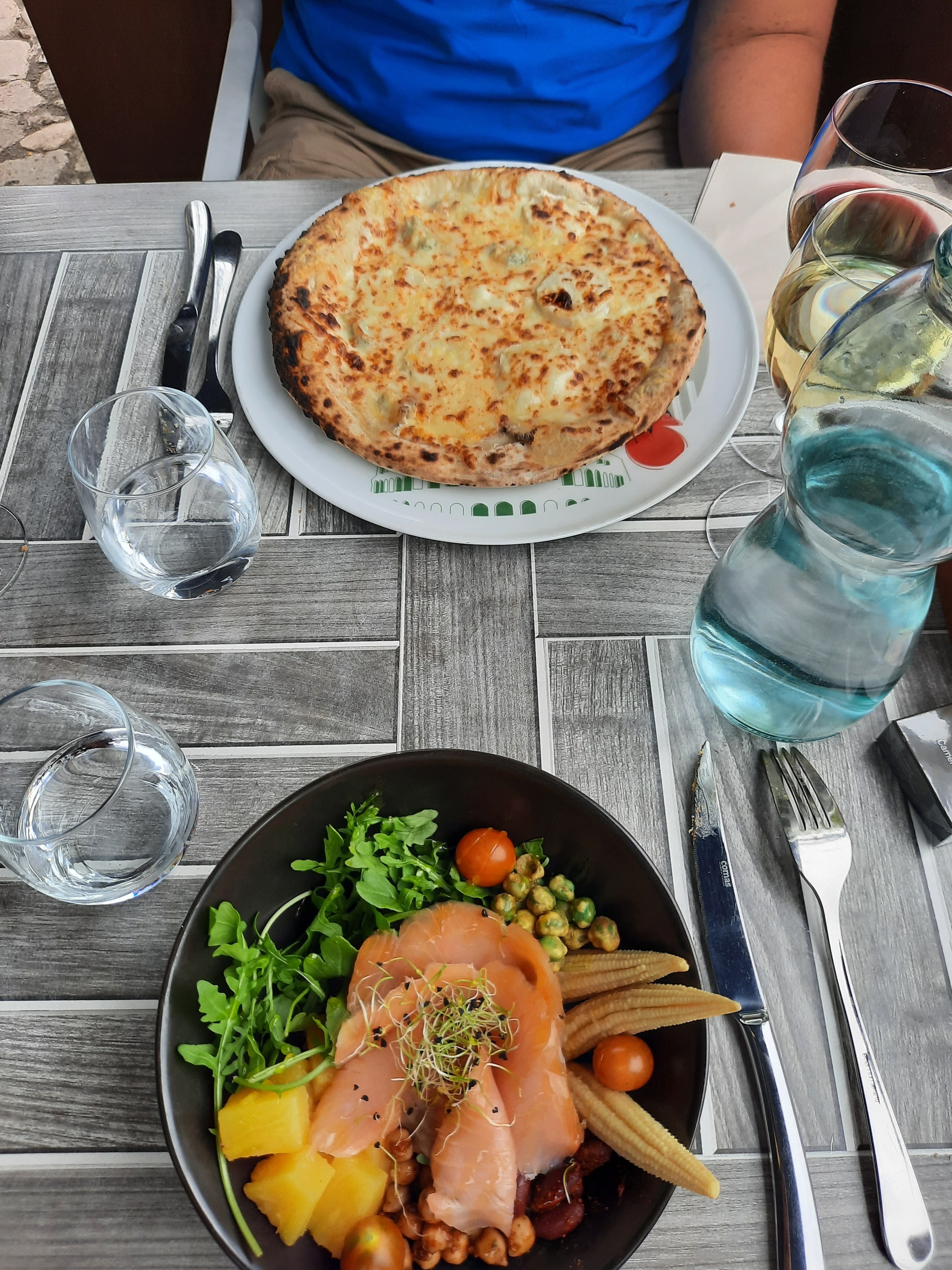 A l'arrivée, la façade de l'établissement est pimpante; La terrasse est coquète et d'ailleurs le patron en tenue de cuisinier (propre) s'y entretient avec des clients tandis que Madame la Patronne œuvre en salle. Voila de quoi nous rassurer : un restaurant où les patrons sont présents? un du coté cuisine et l'autre du coté salle, c'est le gage selon moi d'une organisation au top et prometteuse au niveau de la qualité. En salle, l'impression du départ ne s'émousse pas; tout est propre, bien agencé et décoré avec goût. L'employée au service est impeccable, tant sur elle que dans son travail, aux petits soins elle aussi auprès de la clientèle. La pizza est richement garnie. La moitié de la notre repartira avec nous dans une boite, trop grande et impossible à terminer sur place pour les solides mangeurs que nous sommes pourtant … L' autre plat, un jambonneau aux lentilles est servi bien chaud dans une assiette creuse, un miracle pour moi qui déteste manger froid ou tiède. L'assiette est très copieuse. Le vin au verre est à prix raisonnable, tout comme les plats. Le café gourmand peut se déguster à deux tellement il est bien garni lui aussi. Bref, l'ambiance est amicale, détendue, sans chichi et la priorité semble être la satisfaction du client. Ceux que nous avons vu ce jour là paraissent bien être du même avis que nous. Nos plus vifs encouragements ainsi que nos remerciements à ses propriétaires qui ont pris quelques minutes pour échanger avec nous autres.