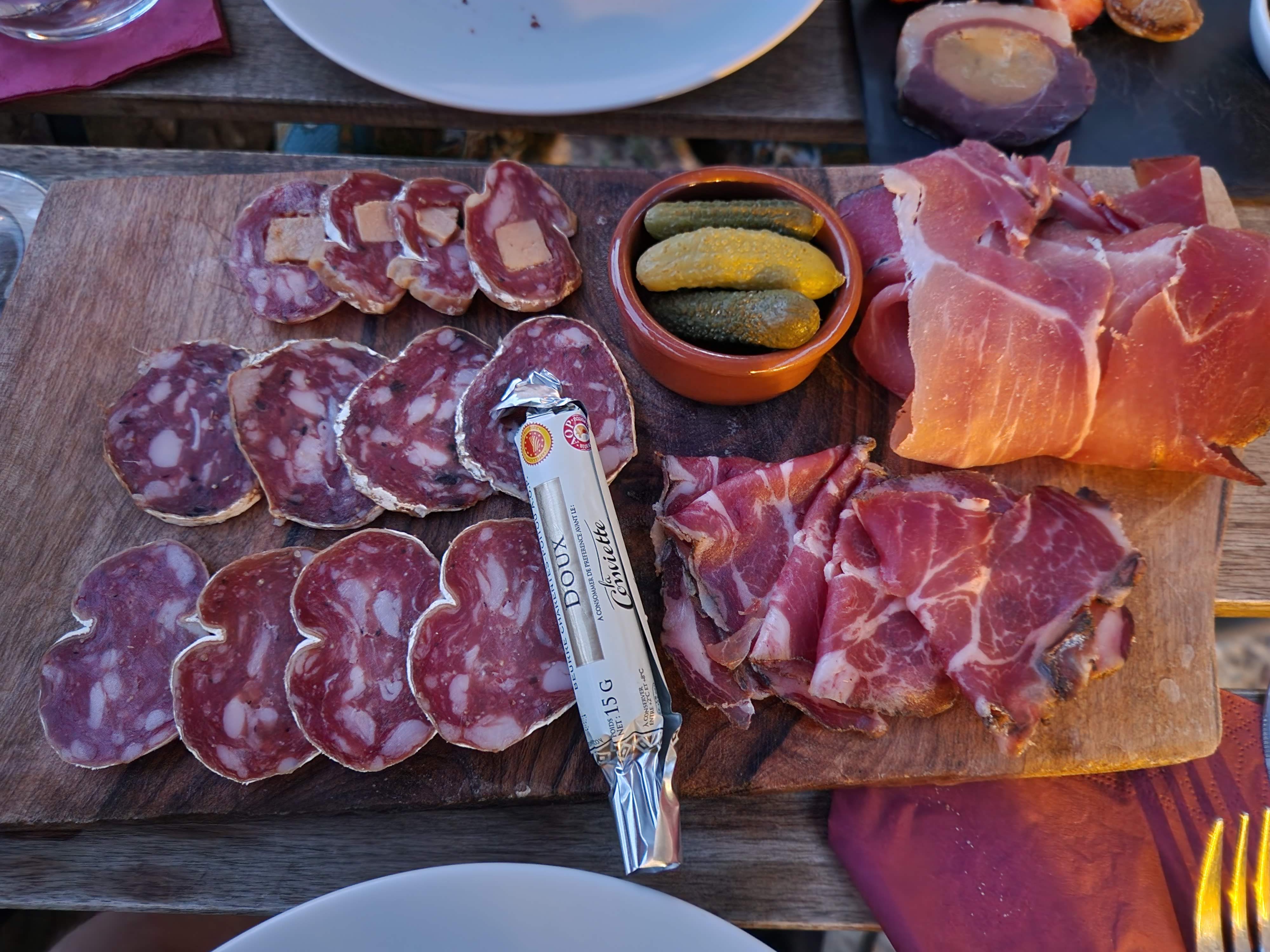 De bons produits : un foie gras divin accompagnė d'une confiture d'orange pas amère faite maison dont on aimerait la recette, de la 'vraie' charcuterie saucisson sec aux truffes, du fromage et du bon vin .... Tout est parfait