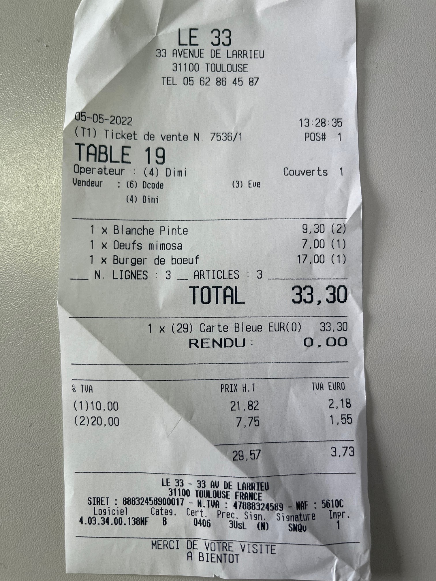 Tout était parfait comme à chaque fois que l'on vient, serveurses sympathique, repas très bon. Nous sommes toujours préssés et nous sommes toujours servis à temps :) Merci a tous le personnels du Numéro 33. Je recommande à 100%