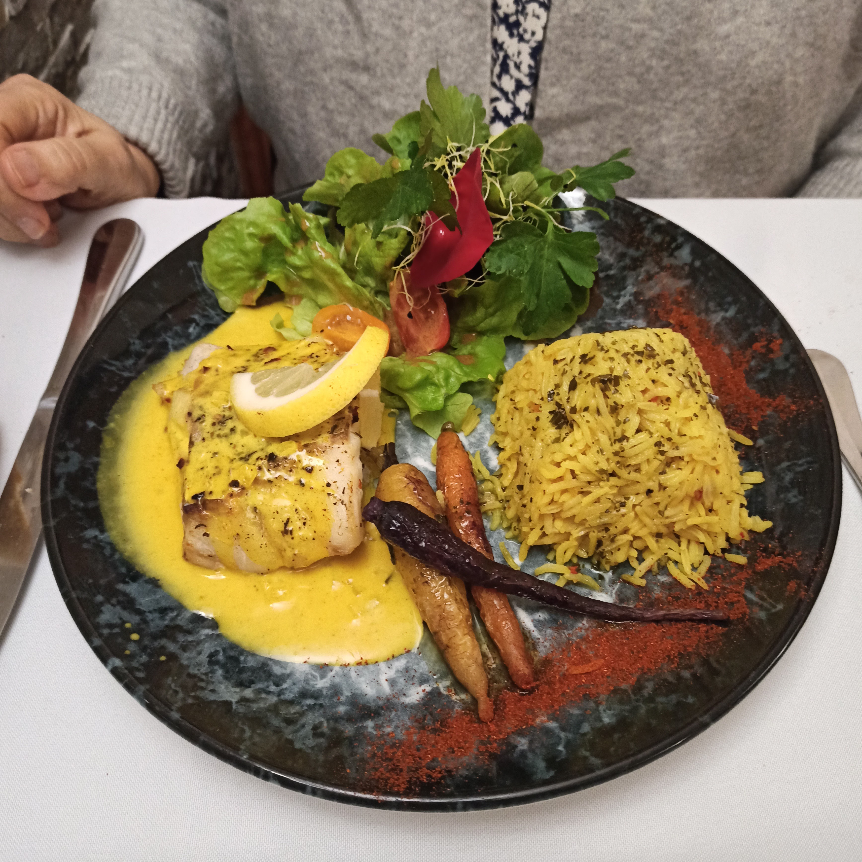Je suis venue déjeuner avec une amie et ce fut une belle surprise. Un sans faute pour ce repas: le dos de cabillaud était parfaitement cuit(fondant, pas sec) et le riz safrané était un bon accompagnement. Excellent café gourmand, tout est fait maison et les parts sont généreuses: une mousse à la noisette, un macaron, une crème brûlée et un brownie. Nous nous sommes régalées, vraiment. Hâte de revenir .