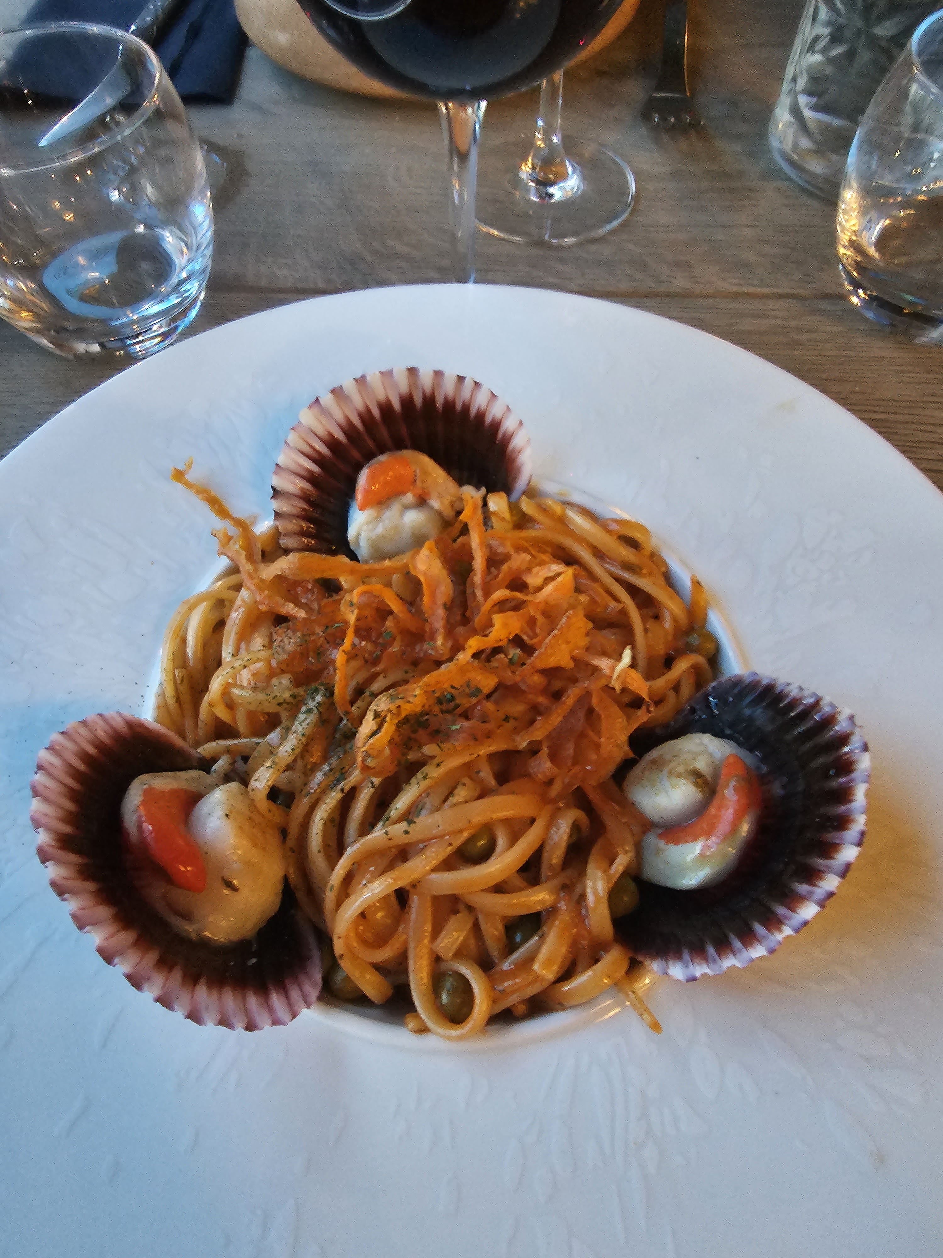Visite le samedi 20 mai au soir… Attente beaucoup trop longue, 1h20 pour l’apéritif et l’entrée… au total nous avons attendu pratiquement 2h50. Les linguines ne sont pas servies avec des St Jacques mais avec des pétoncles, 4 pétoncles et 3 gambas dans l’assiette, très peu en quantité