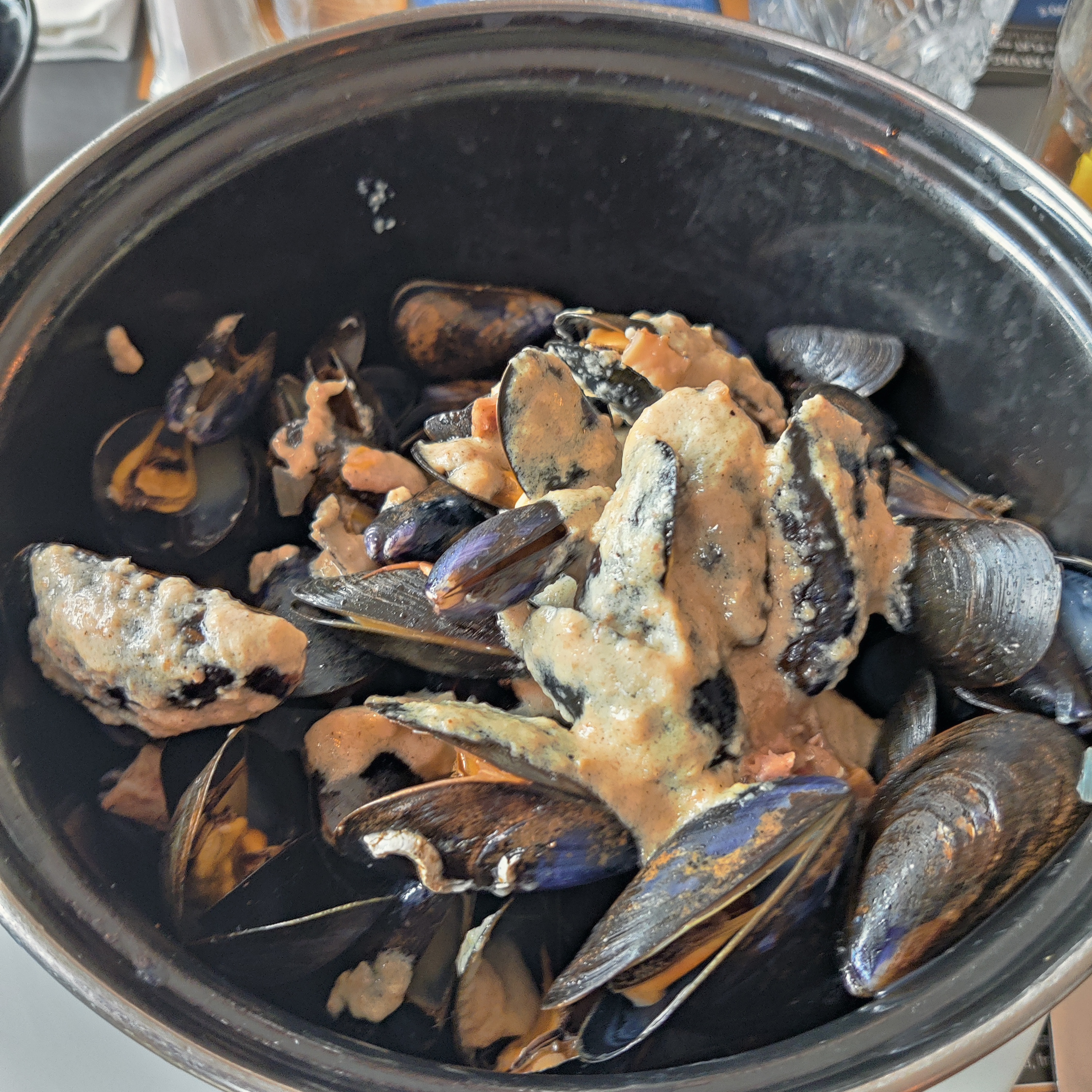 Planche apéro sympa avec plusieurs recettes de poisson. Les moules sont bien cuisiner rien à redire service rapide et serveurs souriants. Une très belle vue sur mer 🥰. Je conseille.