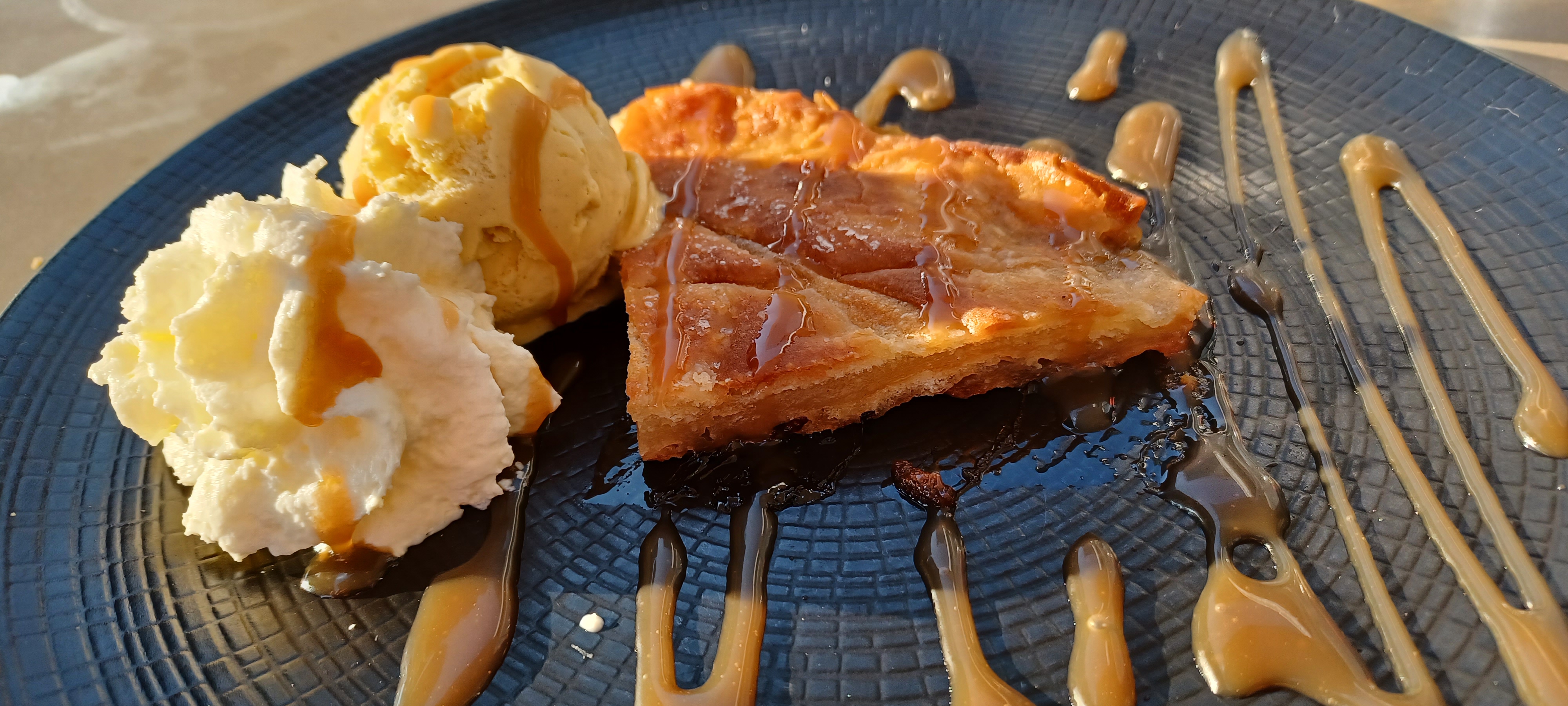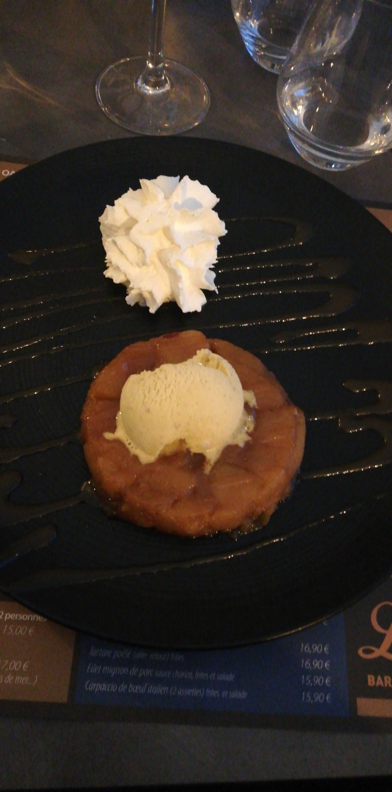 L après midi petite glace sur la terrasse pelouse face à la mer. La tarte tatin avec une boule de glace bien. Prix bon marché.