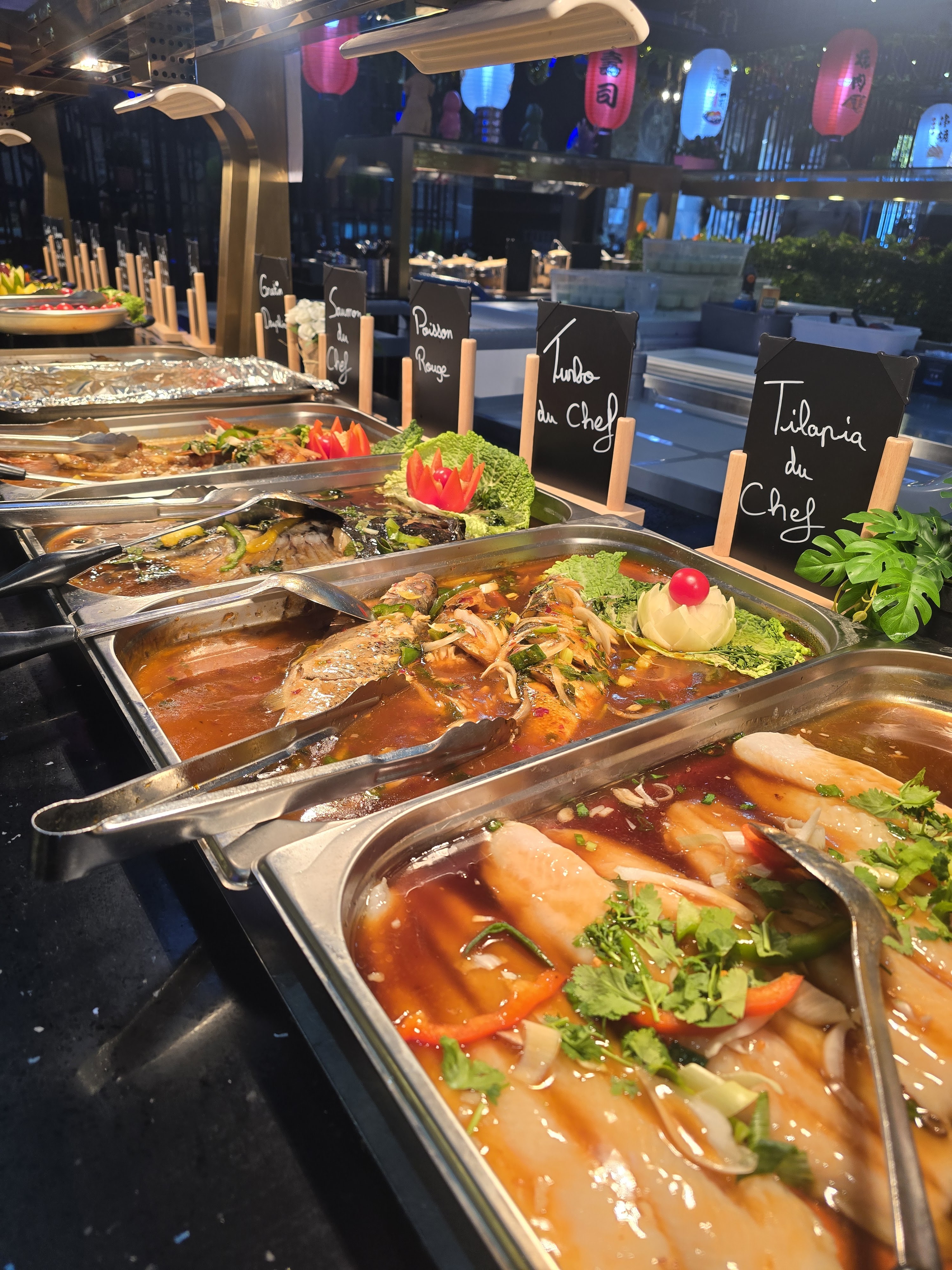 Il y a beaucoup de choix, poissons, viandes, fritures. Il y a aussi un bar à Naan / crêpes c’est super. Mais malheureusement le goût n’y est pas forcément et beaucoup trop de bruit c’est dommage mais c’est quand même bon quoi. 24,90€ le soir dimanche.. un peu trop quand même