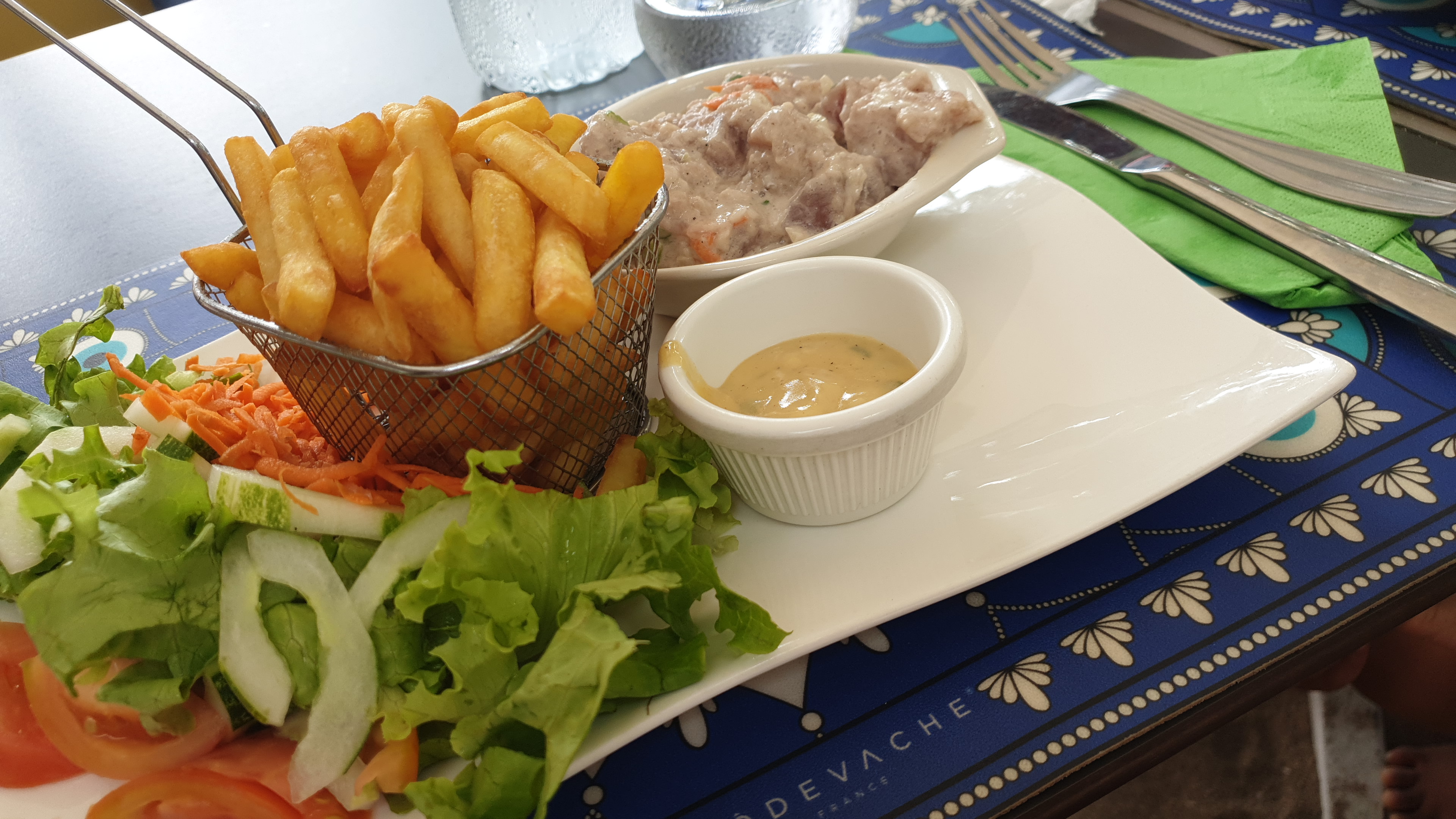 Cuisine de lolo, service sympa et souriant. Déjeuner les pieds sur la plage