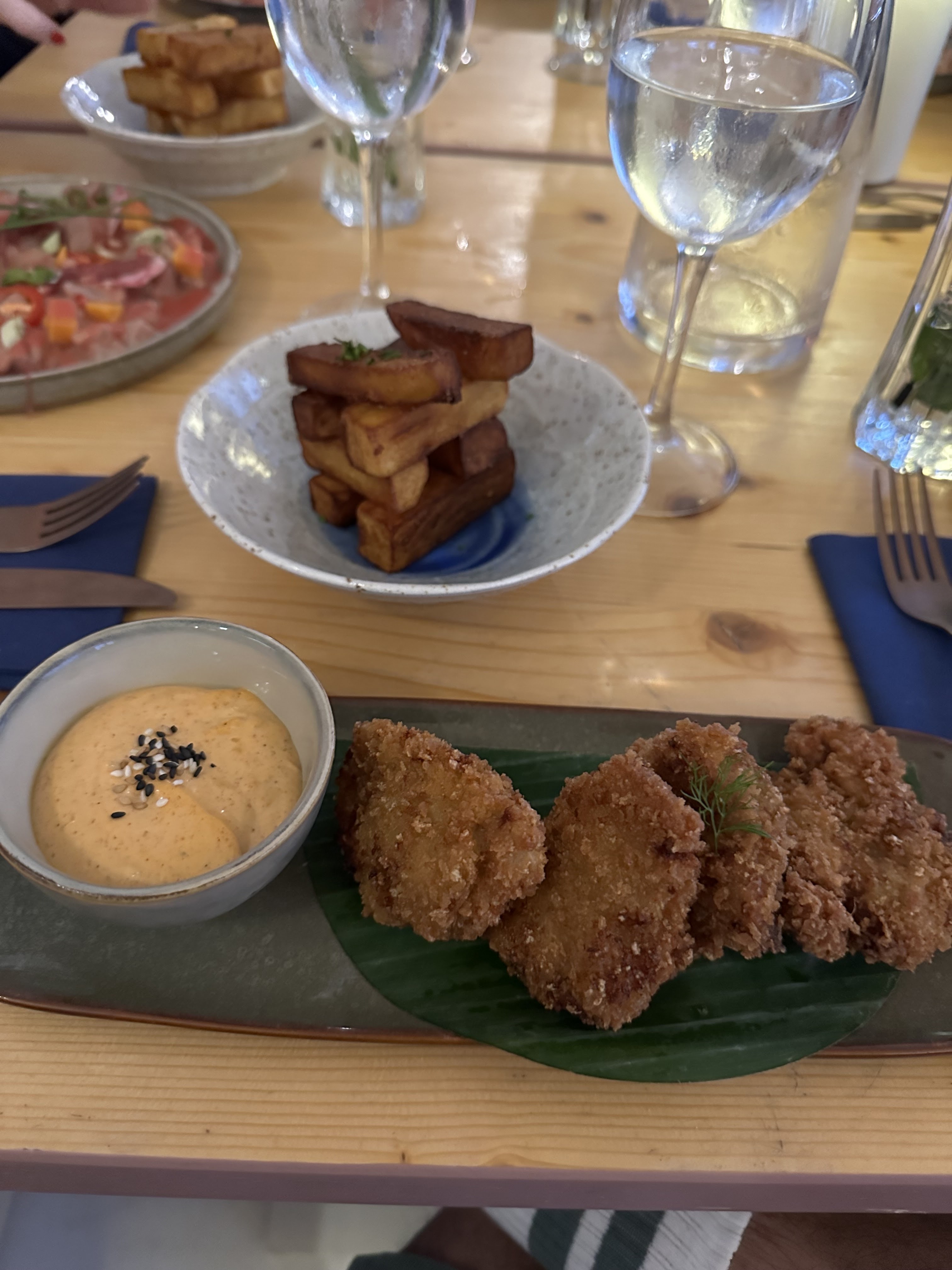 Diner à trois. Cadre très agréable. Chaises d'aspect cheap mais confortables. Belle table, jolis parasols. Musique d'ambiance agréable, et pas trop forte. Les serveurs semblent débutants, mais sympas et de bonne volonté. Bon cocktail du jour. Carte très limitée, mais pour un restau de plage, c'est plutôt rassurant. Les frites maison en accompagnement ne sont vraiment pas bonnes, dommage, c'est quand même la base. Faites quelque chose ! Le Korean fried chicken : très bon. Les crevettes (Shrimp roll) : OK, présentation originale, mais rien d'extraordinaire, surtout pour le prix. Les portions sont correctes. Bons desserts : Cookie du chef et Cheesecake charentais.