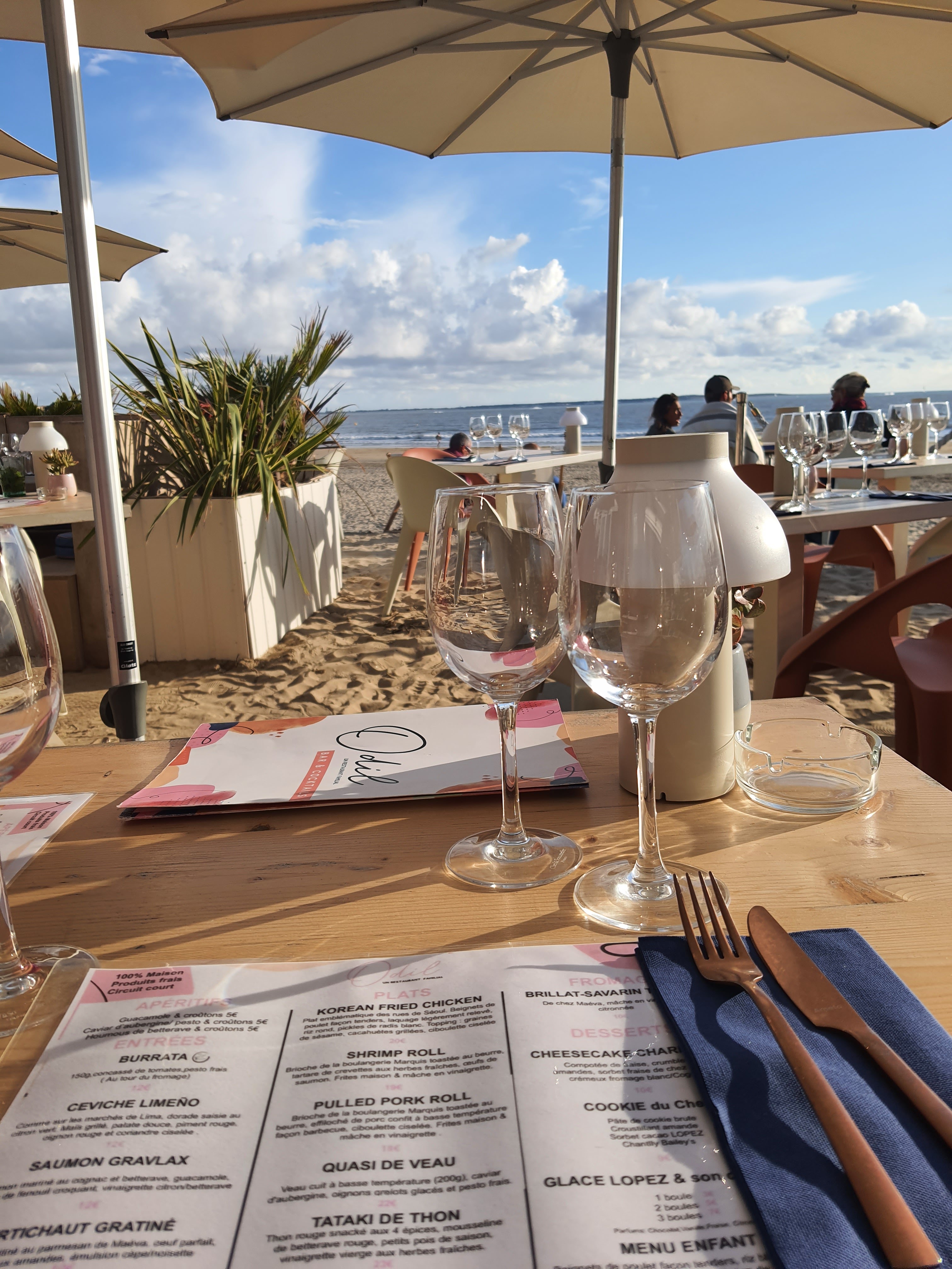 Agréable surprise de découvrir ce Restaurant ODIL sur la plage. Enfin un endroit neuf au gout simple frais moderne ou de suite on s y sent très bien . un acceuil tres agréable A l écoute de leur clientèle et de surcroît avec le sourire. La cuisine est de bonne saveur. Le lieu est est mis en valeur par le cadre marin. Je recommande à tous âges.