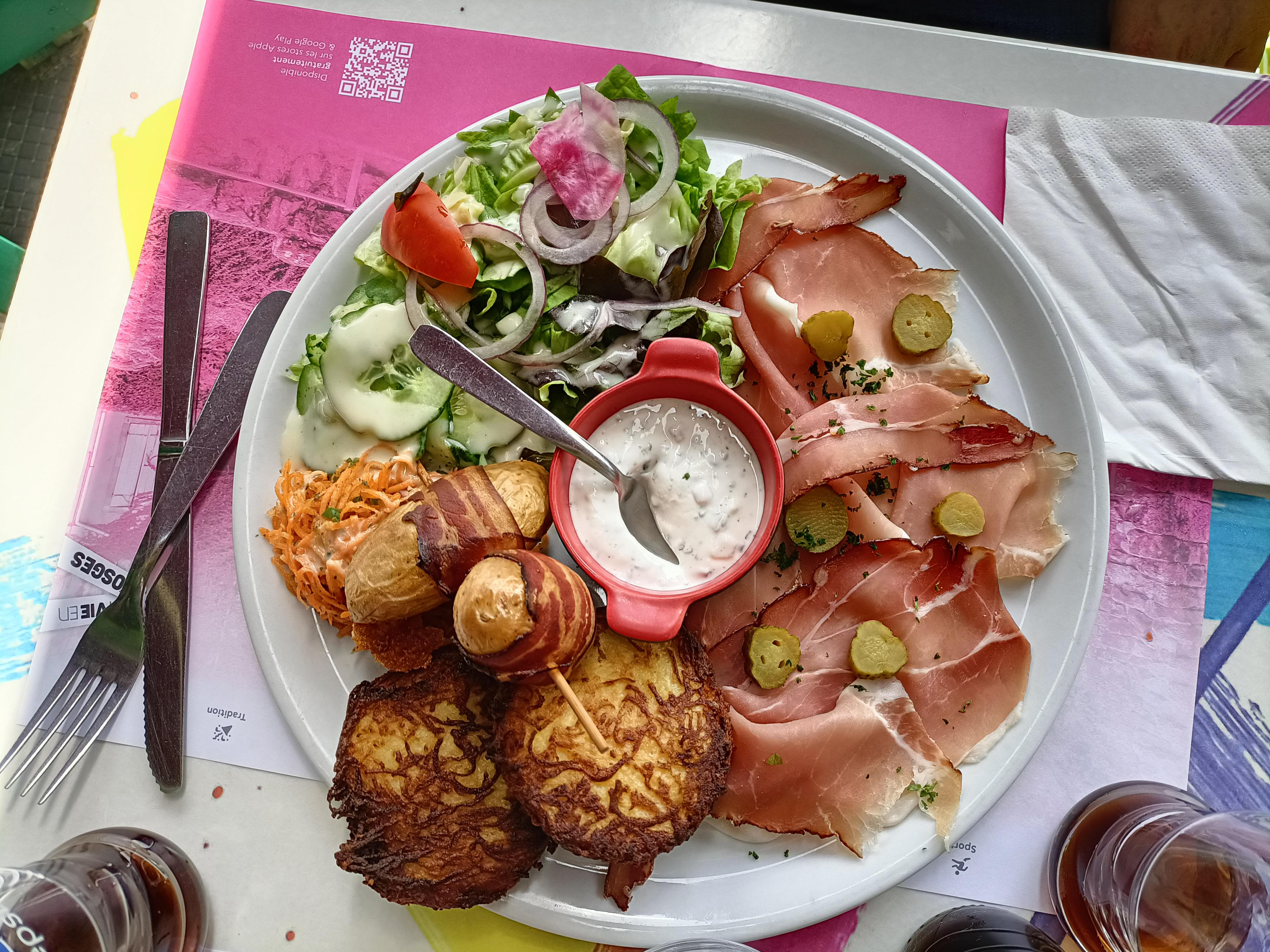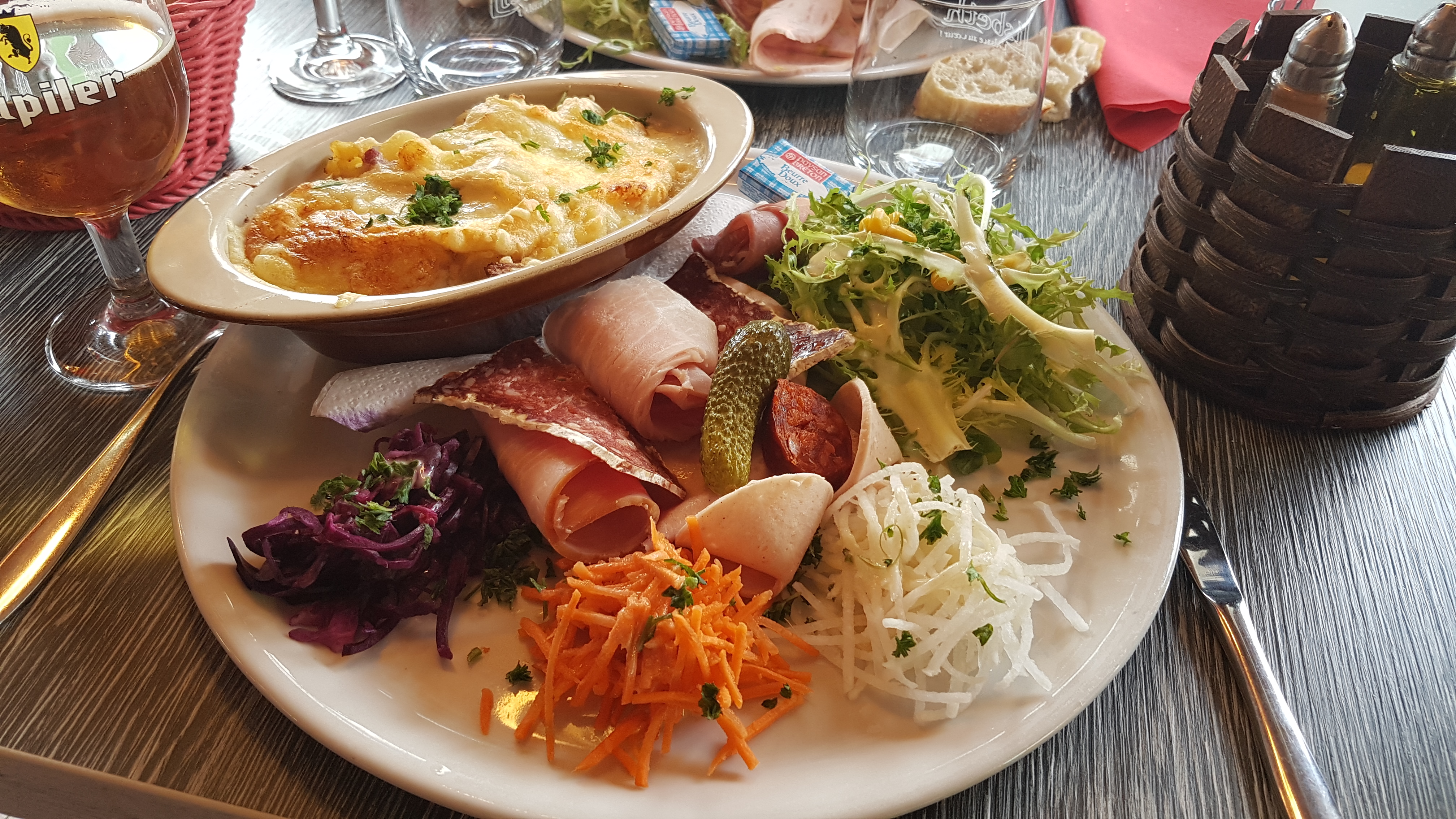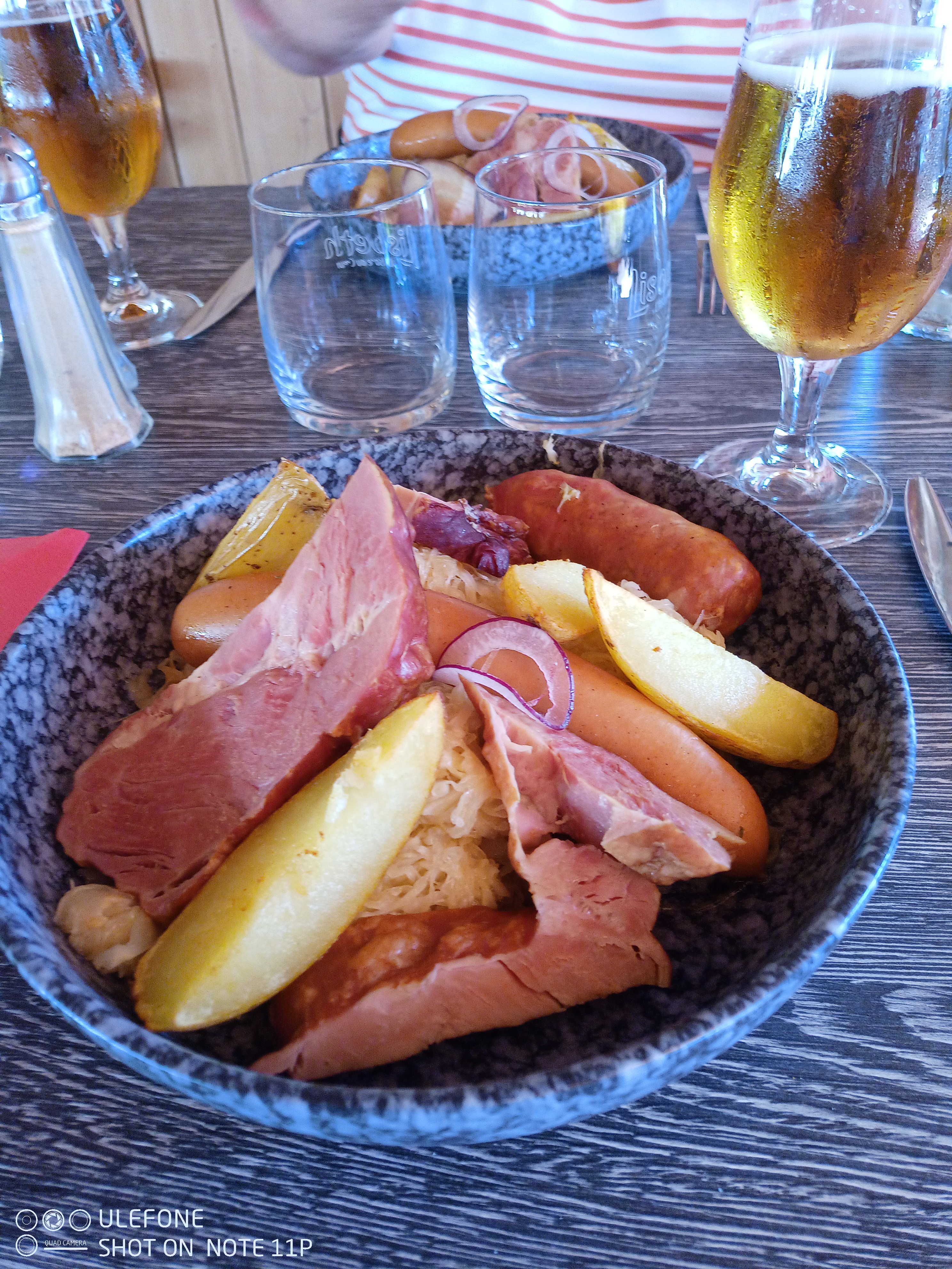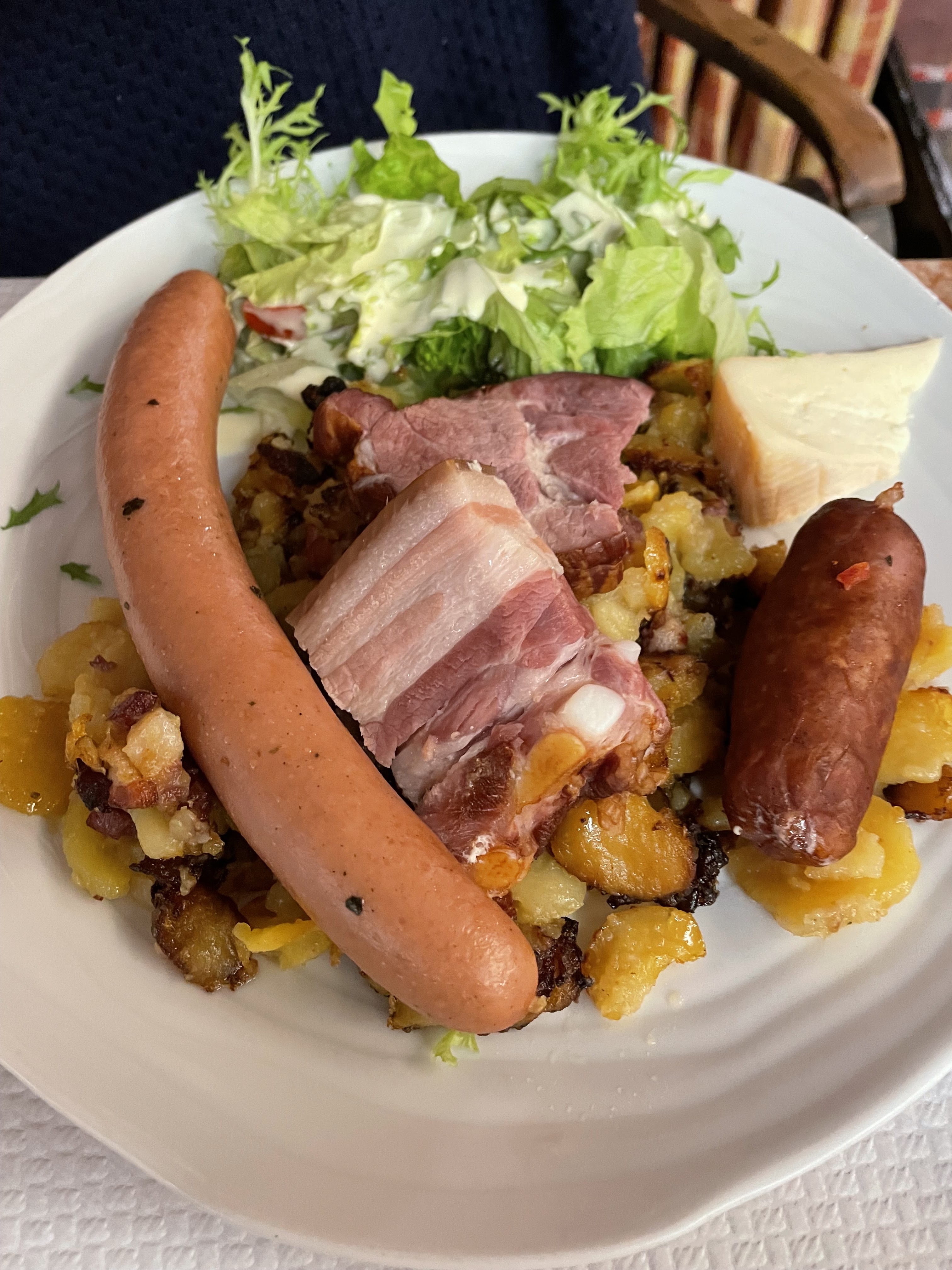 Carte variée de plats lorrains vosgiens et alsaciens. Pas de tartes flambées. La tofaille est une choucroute servie avec des pommes de terre cuites au jus et de la salade. L'assiette du marcheur était servie avec 2 pommes de terre en robe de chambre. J'ai finalement eu 3 potatoes enrobées de lard sur une brochette...