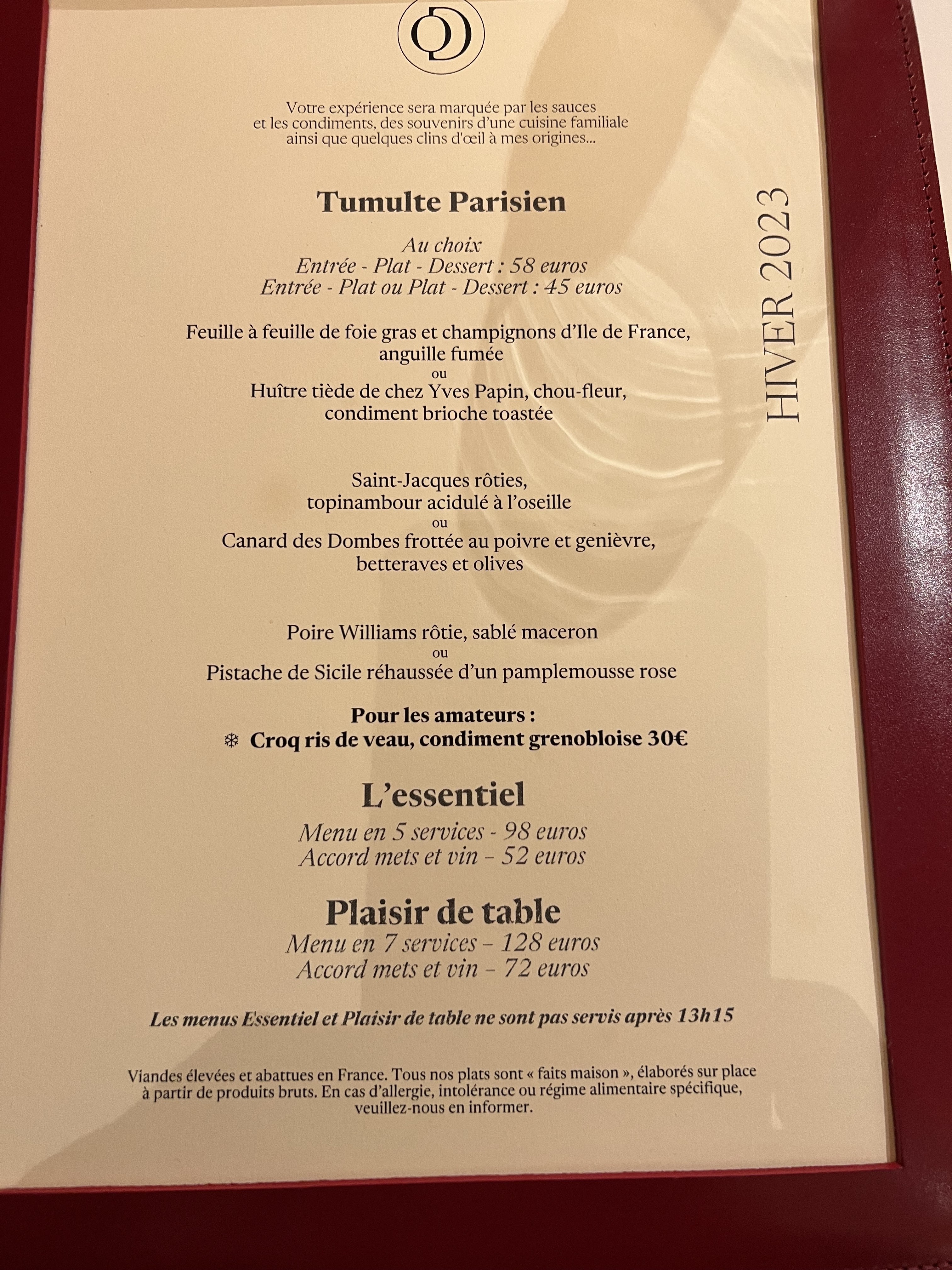 Une très belle surprise. Tout était parfait ! Les plats sont excellent (un coup de coeur pour le plat signature du chef) et pas trop copieux dans un menu 9 services, je ne suis pas ressortie en ayant trop mangé. L'accord mets et vins est parfait. Merci à Margot de nous faire découvrir ces vins. Merci au chef et à toute l'équipe !